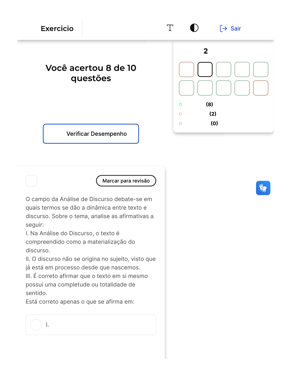 <p>Verifique o seu desempenho e continue</p><p>treinando! Você pode refazer o exercício</p><p>quantas vezes quiser.</p><p>A</p><p>1</p><p>O campo da Análise de Discurso debate-se em</p><p>quais termos se dão a dinâmica entre texto e</p><p>discurso. Sobre o tema, analise as afirmativas a</p><p>seguir:</p><p>I. Na Análise do Discurso, o texto é</p><p>compreendido como a materialização do</p><p>discurso.</p><p>II. O discurso não se origina no sujeito, visto que</p><p>já está em processo desde que nascemos.</p><p>III. É correto afirmar que o texto em si mesmo</p><p>possui uma completude ou totalidade de</p><p>sentido.</p><p>Está correto apenas o que se afirma em:</p><p>I.</p><p>Questão de 10</p><p>Corretas</p><p>Incorretas</p><p>Em branco</p><p>1 2 3 4 5</p><p>6 7 8 9 10</p><p>A Análise Do Discurso</p><p>Firefox https://estacio.saladeavaliacoes.com.br/exercicio/65e54767074a17ccb9...</p><p>1 of 18 04/03/2024, 01:11</p><p>B</p><p>C</p><p>D</p><p>E</p><p>II.</p><p>III.</p><p>I e II.</p><p>II e III.</p><p>Opa! A alternativa correta é a letra</p><p>D. Confira o gabarito comentado!</p><p>Na Análise de Discurso, o texto é entendido</p><p>como a concretização do discurso,</p><p>conforme expresso na afirmativa I. Além</p><p>disso, a afirmativa II está correta ao afirmar</p><p>que o discurso não se origina no sujeito,</p><p>pois ele já está em processo desde o nosso</p><p>nascimento, estando intrinsecamente</p><p>ligado à nossa memória e história. Por outro</p><p>lado, a afirmativa III está incorreta, pois,</p><p>embora o texto possa apresentar um certo</p><p>grau de completude, ele está sempre em</p><p>relação com outros textos e discursos,</p><p>sendo influenciado pela memória e pela</p><p>história. Portanto, o sentido de um texto vai</p><p>além dos seus próprios elementos</p><p>linguísticos, estando sempre em constante</p><p>construção e interpretação.</p><p>Firefox https://estacio.saladeavaliacoes.com.br/exercicio/65e54767074a17ccb9...</p><p>2 of 18 04/03/2024, 01:11</p><p>A</p><p>B</p><p>C</p><p>D</p><p>E</p><p>2</p><p>A Análise do Discurso é um campo de estudo</p><p>que surge no final da década de 60, num</p><p>contexto de efervescência política. Sobre a AD,</p><p>leia as afirmativas a seguir:</p><p>I. A Análise do Discurso estuda as condições de</p><p>produção do discurso.</p><p>II. O texto, na AD, é um conceito que significa a</p><p>mesma coisa que oratória.</p><p>III. As mídias são consideradas, no contexto da</p><p>AD, um aparelho ideológico.</p><p>Está correto apenas o que se afirma em:</p><p>I.</p><p>II.</p><p>III.</p><p>I e III.</p><p>II e III.</p><p>Parabéns, você selecionou a</p><p>alternativa correta. Confira o</p><p>gabarito comentado!</p><p>A Análise do Discurso �AD� é um campo de</p><p>Firefox https://estacio.saladeavaliacoes.com.br/exercicio/65e54767074a17ccb9...</p><p>3 of 18 04/03/2024, 01:11</p><p>estudo que se concentra nas condições de</p><p>produção do discurso, conforme afirmado</p><p>na afirmativa I. Isso significa que a AD</p><p>busca entender como o contexto social,</p><p>histórico e ideológico influencia a maneira</p><p>como o discurso é produzido e</p><p>interpretado. Portanto, a afirmativa I está</p><p>correta.</p><p>A afirmativa II, no entanto, está incorreta.</p><p>Na AD, o conceito de texto não é sinônimo</p><p>de oratória. A oratória é a arte de falar em</p><p>público de forma eloquente, enquanto o</p><p>texto, na AD, é entendido como um produto</p><p>das dinâmicas sociais, históricas e</p><p>ideológicas. Portanto, o texto não se limita</p><p>à oralidade, mas abrange todas as formas</p><p>de expressão discursiva.</p><p>Finalmente, a afirmativa III está correta. Na</p><p>AD, as mídias são consideradas um</p><p>aparelho ideológico. O filósofo Louis</p><p>Althusser definiu os aparelhos ideológicos</p><p>como instituições sociais que ajudam a</p><p>reproduzir as condições de produção</p><p>existentes. Isso inclui a família, a escola, a</p><p>política, a religião, as mídias e as artes.</p><p>Portanto, as mídias, como um aparelho</p><p>ideológico, desempenham um papel</p><p>importante na formação do discurso.</p><p>3</p><p>Os motivos relacionados com o surgimento da</p><p>análise do discurso e mesmo o seu</p><p>desenvolvimento não se limitam a uma única</p><p>questão nem a um momento pontual. Sobre a</p><p>história de constituição da Análise do Discurso,</p><p>Firefox https://estacio.saladeavaliacoes.com.br/exercicio/65e54767074a17ccb9...</p><p>4 of 18 04/03/2024, 01:11</p><p>A</p><p>B</p><p>C</p><p>D</p><p>E</p><p>assinale a alternativa correta.</p><p>A formação discursiva foi elaborada e</p><p>reformulada por Foucault.</p><p>A memória discursiva foi pensada na</p><p>primeira fase da disciplina.</p><p>O conceito de sujeito foi emprestado</p><p>da sociologia.</p><p>A ideologia ocupou um lugar central na</p><p>teoria do discurso.</p><p>A Análise do Discurso unificou, aos</p><p>poucos, seus objetos de estudo.</p><p>Parabéns, você selecionou a</p><p>alternativa correta. Confira o</p><p>gabarito comentado!</p><p>A alternativa correta é a letra D, que afirma</p><p>que a ideologia ocupou um lugar central na</p><p>teoria do discurso. Isso ocorre porque a</p><p>ideologia, entre outros problemas ou</p><p>aspectos tratados pela Análise do Discurso,</p><p>teve um lugar de destaque nos estudos e</p><p>debates da teoria do discurso. As demais</p><p>alternativas não devem ser assinaladas por</p><p>diversos motivos. A formação discursiva foi</p><p>elaborada por Foucault, mas reformulada</p><p>por Pêcheux, o que invalida a alternativa A.</p><p>Firefox https://estacio.saladeavaliacoes.com.br/exercicio/65e54767074a17ccb9...</p><p>5 of 18 04/03/2024, 01:11</p><p>A</p><p>B</p><p>C</p><p>A memória discursiva foi pensada na</p><p>primeira fase da disciplina, o que torna a</p><p>alternativa B incorreta. O conceito de</p><p>sujeito foi emprestado da psicanálise, e n