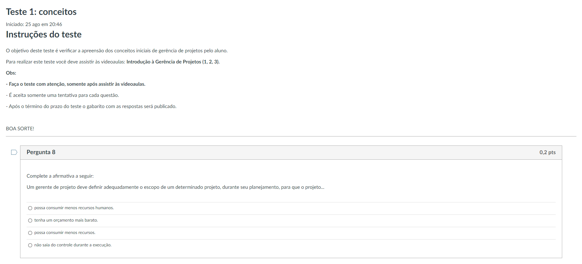 <p>Teste 1: conceitos Iniciado: 25 ago em 20:46 Instruções do teste objetivo deste teste é verificar a apreensão dos conceitos iniciais de gerência de projetos pelo aluno. Para realizar este teste você deve assistir às videoaulas: Introdução à Gerência de Projetos (1, Obs: - Faça teste com atenção, somente após assistir às videoaulas. - É aceita somente uma tentativa para cada questão. Após término do prazo do teste gabarito com as respostas será publicado. BOA SORTE! Pergunta 8 0,2 pts Complete a afirmativa a seguir: Um gerente de projeto deve definir adequadamente o escopo de um determinado projeto, durante seu planejamento, para que o projeto.. possa consumir menos recursos tenha um orçamento mais barato. possa consumir menos não saja do controle durante a execução.</p>