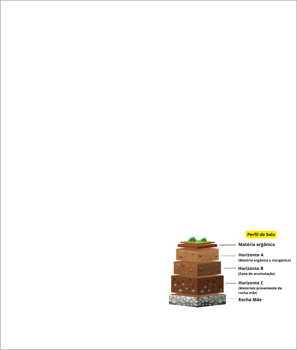 <p>CIÊNCIAS</p><p>O SOLO DA TERRA E SEUS RECURSOS</p><p>O SOLO É UMA PARTE MUITO IMPORTANTE DA TERRA. ELE É FORMADO PELA DECOMPOSIÇÃO DE ROCHAS, MATÉRIA ORGÂNICA, E A AÇÃO DE ORGANISMOS VIVOS AO LONGO DE MUITOS ANOS. O SOLO TEM DIFERENTES CAMADAS, E CADA UMA DELAS DESEMPENHA UM PAPEL ESPECIAL.</p><p>A CAMADA SUPERIOR DO SOLO, CHAMADA DE "HORIZONTE O", É RICA EM MATÉRIA ORGÂNICA E NUTRIENTES, E É ONDE AS PLANTAS CRESCEM MELHOR. ABAIXO DESSA CAMADA, TEMOS O "HORIZONTE A", QUE TAMBÉM CONTÉM NUTRIENTES E É IMPORTANTE PARA O CRESCIMENTO DAS PLANTAS. MAIS ABAIXO ESTÁ O "HORIZONTE B", QUE É FORMADO POR MINERAIS E PARTÍCULAS QUE FORAM TRANSPORTADOS DAS CAMADAS SUPERIORES. FINALMENTE, O "HORIZONTE C" É COMPOSTO PRINCIPALMENTE POR ROCHAS QUEBRADAS E MINERAIS QUE AINDA NÃO SE TRANSFORMARAM EM SOLO.</p><p>O SOLO É VITAL PARA A VIDA DAS PLANTAS PORQUE FORNECE NUTRIENTES, ÁGUA E UM LUGAR PARA AS RAÍZES CRESCEREM. ALÉM DISSO, A MATÉRIA ORGÂNICA NO SOLO AJUDA A MANTER A ESTRUTURA DO SOLO E A SUA CAPACIDADE DE RETER ÁGUA. AS MINHOCAS E OUTROS ORGANISMOS TAMBÉM AJUDAM A MELHORAR A QUALIDADE DO SOLO, DECOMPONDO MATÉRIA ORGÂNICA E CRIANDO CANAIS QUE PERMITEM A ENTRADA DE ÁGUA E AR.</p><p>QUANDO OS SERES HUMANOS FAZEM ATIVIDADES COMO DESMATAMENTO, AGRICULTURA INTENSIVA E CONSTRUÇÃO, ISSO PODE PREJUDICAR O SOLO. A EROSÃO, POR EXEMPLO, PODE REMOVER A CAMADA SUPERIOR DO SOLO, DEIXANDO-O MENOS FÉRTIL E MAIS DIFÍCIL PARA AS PLANTAS CRESCEREM.</p><p>EM ALGUNS TIPOS DE SOLO, COMO O SOLO ARENOSO, PODE SER NECESSÁRIO FAZER ALGO PARA MELHORAR SUA QUALIDADE. ADICIONAR COMPOSTO ORGÂNICO E MISTURAR O SOLO COM ARGILA SÃO DUAS MANEIRAS DE AJUDAR A TORNAR O SOLO MAIS FÉRTIL E ADEQUADO PARA O CRESCIMENTO DAS PLANTAS.</p><p>E. M. PROFª. “TEREZINHA DO MENINO JESUS CALIL”</p><p>ALUNO (A):</p><p>DATA:</p><p>PROF. RESPONSÁVEL:</p><p>3º ANO</p><p>3º BIMESTRE</p><p>NOTA DE AVAL:</p><p>ATIVIDADE AVALIATIVA DE CIÊNCIAS</p><p>VALOR DA ATIVIDADE – 10,0</p><p>1- QUAL DAS SEGUINTES DESCRIÇÕES É UMA CARACTERÍSTICA TÍPICA DA CAMADA DE SOLO CHAMADA “HORIZONTE C”?</p><p>CONTÉM MUITOS NUTRIENTES E É ONDE AS PLANTAS CRESCEM.</p><p>MÉ COMPOSTA PRINCIPALMENTE POR ROCHAS QUEBRADAS E MINERAIS. É RICA EM MATÉRIA ORGÂNICA E ESCURA.</p><p>É A CAMADA ONDE A ÁGUA SE ACUMULA.</p><p>2- COMO A PRESENÇA DE MINHOCAS NO SOLO PODE BENEFICIAR AS PLANTAS?</p><p>3- QUAL É A PRINCIPAL FUNÇÃO DA MATÉRIA ORGÂNICA NO SOLO?</p><p>FORNECER NUTRIENTES PARA AS PLANTAS AUMENTAR A QUANTIDADE DE ÁGUA NO SOLO</p><p>MELHORAR A DRENAGEM DO SOLO REDUZIR A EROSÃO DO SOLO</p><p>4- DESCREVA O PROCESSO DE FORMAÇÃO DO SOLO E COMO ELE PODE SER AFETADO POR ATIVIDADES HUMANAS.</p><p>5- O QUE A EROSÃO PODE CAUSAR AO SOLO?</p><p>__________________________________________________________________________________</p><p>__________________________________________________________________________________</p><p>__________________________________________________________________________________</p><p>6- DESCREVA AS CAMADAS OU HORIZONTES DO SOLO:</p><p>image1.png</p><p>image2.png</p><p>image3.png</p>