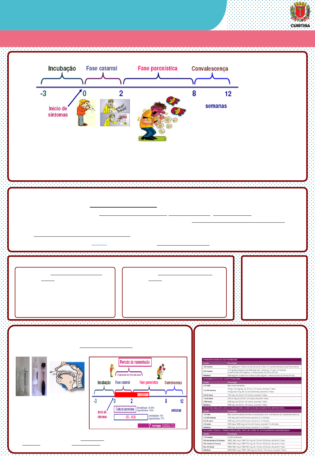 <p>V1: 08/08/2023</p><p>COQUELUCHE – CID A37.9</p><p>v.1 - 04/07/2024</p><p>SECRETARIA MUNICIPAL DA SAÚDE DE CURITIBA</p><p>Centro de Epidemiologia e</p><p>Departamento de Atenção Primária em Saúde</p><p>FASES CLÍNICAS DA COQUELUCHE</p><p>ANTIBIOTICOTERAPIA</p><p>➢ Deve ser iniciada no momento da suspeita</p><p>➢ Diminui a transmissibilidade</p><p>➢ Na fase catarral diminui o tempo e a gravidade dos</p><p>sintomas. Outras fases não afeta o curso dos sintomas.</p><p>➢ ATB e posologia conforme quadro abaixo:</p><p>COLETAR EXAMES PARA O DIAGNÓSTICO DE COQUELUCHE</p><p>➢ SWAB DE NASOFARINGE em tubo seco ou em meio de transporte R.L (REGAN LOWE):</p><p>enviar para o LACEN-PR PARA PESQUISA DE COQUELUCHE (CULTURA e/ou PCR para</p><p>Bordetella pertussis) – coletar no período de transmissão, conforme figura abaixo:</p><p>➢ OUTROS EXAMES AUXILIARES: Hemograma (leucocitose >20 mil com linfocitose >60%),</p><p>Sorologia (IgM reagente), Raio X de tórax (coração “felpudo” ou “franjado”, devido</p><p>aos infiltrados pulmonares que deixam as bordas cardíacas “borradas” e não nítidas).</p><p>DIAGNÓSTICO</p><p>DIFERENCIAL</p><p>▪ Traqueobronquite</p><p>▪ Bronquiolite</p><p>▪ Laringite</p><p>▪ Tuberculose (tosse>3 sem)</p><p>▪ Outras doenças/infecções</p><p>respiratórias (Mycoplasma</p><p>pneumoniae, Chlamydia pn., RSV,</p><p>Adenovírus ou outros vírus resp.)</p><p>CONSIDERAR CASO SUSPEITO DE COQUELUCHE</p><p>➢ Indivíduos que apresentam TOSSE há pelo menos 10 dias (se <6 meses idade) ou 14 dias E uma das seguintes condições:</p><p>• Um ou mais sintomas como guincho/estridor inspiratório, vômitos pós-tosse, tosse paroxística (tosse súbita</p><p>incontrolável, com tossidas rápidas e curtas (5 a 10) em uma única expiração), episódios de apneia, cianose ou engasgos</p><p>OU</p><p>• Contato recente com um caso confirmado de coqueluche, independentemente de idade e estado vacinal.</p><p>➢ Comunicantes vulneráveis (ver pg.2) de caso confirmado que apresentam tosse, independente do tempo e tipo de tosse.</p><p>INVESTIGAR, NOTIFICAR E TRATAR COMO CASO SUSPEITO DE COQUELUCHE, SE:</p><p>PACIENTE COM MENOS DE 6 MESES IDADE:</p><p>Tosse há 10 dias ou mais & pelo menos uma</p><p>das seguintes condições:</p><p>• Tosse paroxística</p><p>• Estridor ou guincho inspiratório</p><p>• Vômitos pós-tosse</p><p>• Episódios de cianose, apneia, engasgos</p><p>• Contato com caso confirmado</p><p>PACIENTE COM 6 MESES DE IDADE OU MAIS:</p><p>Tosse há 14 dias ou mais & pelo menos uma</p><p>das seguintes condições:</p><p>• Tosse paroxística</p><p>• Estridor ou guincho inspiratório</p><p>• Vômitos pós-tosse</p><p>• Contato com caso confirmado</p><p>FASE CATARRAL :</p><p>• CORIZA E TOSSE SECA</p><p>• AFEBRIL OU FEBRE BAIXA</p><p>• MAL ESTAR GERAL</p><p>• DURAÇÃO DE UMA A</p><p>DUAS SEMANAS</p><p>CONVALESCENÇA (RECUPERAÇÃO):</p><p>• A TOSSE VOLTA A SER “COMUM”</p><p>• MOMENTOS TRANSITÓRIOS DE PAROXISMOS</p><p>• DURAÇÃO DE DUAS A SEIS SEMANAS,</p><p>PODENDO CHEGAR ATÉ TRÊS MESES</p><p>FASE PAROXÍSTICA :</p><p>• CRISES DE TOSSE SECA SÚBITA (PAROXÍSTICA),</p><p>INCONTROLÁVEL, TOSSIDAS RÁPIDAS E CURTAS</p><p>• GUINCHO OU ESTRIDOR, VÔMITOS PÓS-TOSSE</p><p>• AFEBRIL OU FEBRE BAIXA</p><p>• DURAÇÃO DE DUAS A SEIS SEMANAS</p><p>INCUBAÇÃO:</p><p>• SEM SINTOMAS</p><p>• DURAÇÃO DE UMA</p><p>A TRÊS SEMANAS</p><p>Ilustrações coleta de amostras clínicas</p><p>para cultura e RT-PCR:</p><p>1. TUBO SECO E SWAB DE RAYON</p><p>2. MEIO DE TRANSPORTE R.L. E SWAB ALGIN.</p><p>3. COLETA DE NASOFARINGE</p><p>Não coletar amostras para cultura ou PCR de casos</p><p>suspeitos com mais de 30 dias com tosse ou quando já</p><p>tiver sido coletada amostra de suspeitos sintomáticos no</p><p>grupo que está sendo investigado.</p><p>1 2 3</p><p>V1: 08/08/2023</p><p>COQUELUCHE – CID A37.9</p><p>v.1 - 04/07/2024</p><p>SECRETARIA MUNICIPAL DA SAÚDE DE CURITIBA</p><p>Centro de Epidemiologia e</p><p>Departamento de Atenção Primária em Saúde</p><p>COMUNICANTES VULNERÁVEIS*</p><p>▪ Recém-nascido de mãe com sintomas respiratórios sugestivos ou que teve contato próximo com caso de coqueluche</p><p>▪ Criança menor de 10 anos (principalmente menor de 1 ano de idade), não imunizada ou com esquema vacinal incompleto (menos de</p><p>três doses de vacina com componente “pertussis” – pentavalente, DTP, DTPa, hexavalente, dTpa, etc.)</p><p>▪ Mulher no último trimestre de gestação</p><p>▪ Indivíduo imunodeprimido por doença ou medicamento</p><p>▪ Pessoa com doença crônica grave (pulmonar, cardiovascular, neurológica, renal, entre outras)</p><p>QUIMIOPROFILAXIA ESTÁ INDICADA PARA COMUNICANTES</p><p>▪ Com idade inferior a 1 ano, independente da situação vacinal. Recém-nascidos devem ter uma avaliação médica presencial.</p><p>▪ Com idade entre 1 e 7 anos não vacinados, com situação vacinal desconhecida ou que tenham tomado menos de quatro doses de</p><p>vacina com o componente pertussis</p><p>▪ A partir de 7 anos de idade, sem reforço de vacina pertussis recente e contato próximo prolongado com caso suspeito de coqueluche</p><p>▪ Imunodeprimidos, independentemente da idade ou situação vacinal</p><p>▪ Que trabalham em serviços de saúde ou convivem com gestantes ou crianças menores de 5 anos de idade.</p><p>MEDIDAS DE PREVENÇÃO E CONTROLE DA COQUELUCHE</p><p>▪ O esquema vacinal é composto por três doses da vacina Pentavalente (DTP-HB-Hib aos 2, 4 e 6 meses de vida), seguidas de reforços</p><p>com a Tríplice Bacteriana (DTP) aos 15 meses e aos 4 anos de idade, mesmo com história de doença prévia.</p><p>▪ Aplicar uma dose da vacina Tríplice Bacteriana Acelular (dTpa) a partir da 20ª semana de cada gestação ou puerpério.</p><p>▪ Aplicar uma dose da vacina dTpa a cada 10 anos para profissionais de saúde que atuam em atendimentos de ginecolo