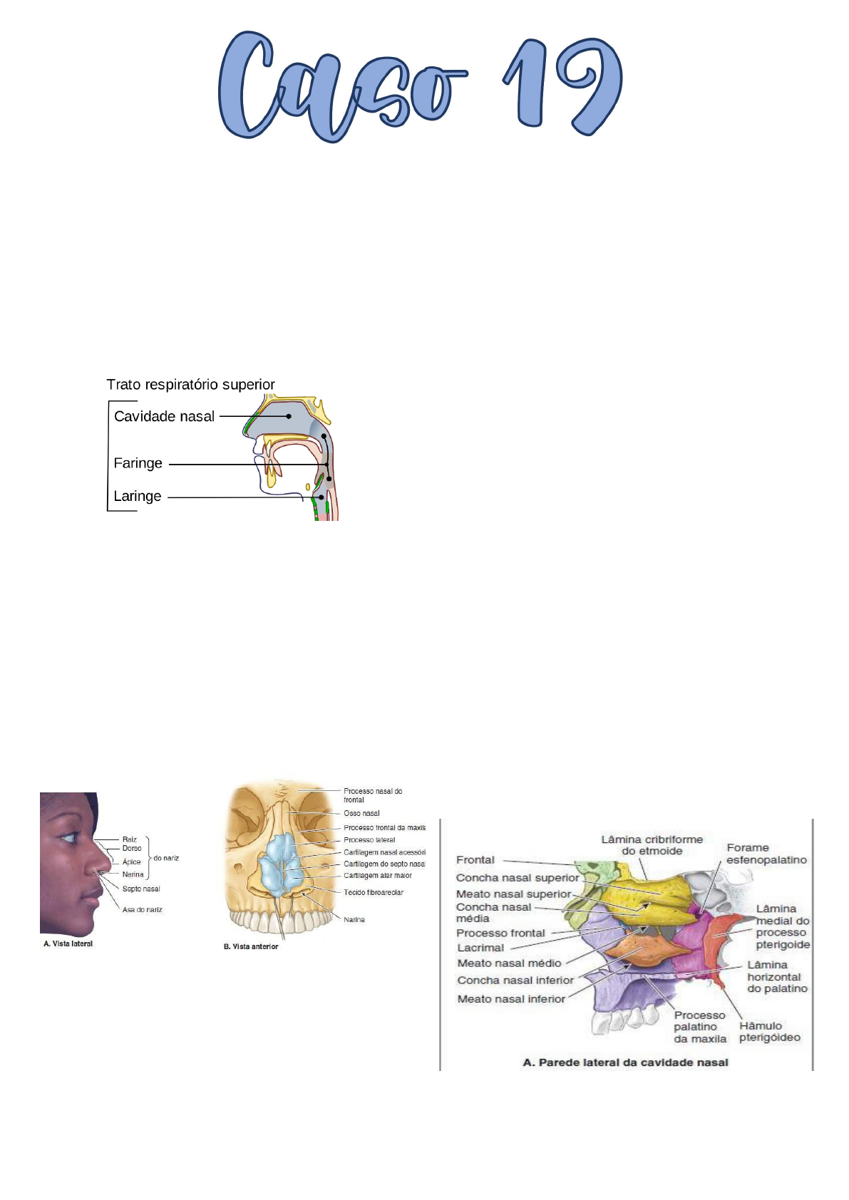 <p>1) ENTENDER A ANATOMIA DAS VIAS</p><p>AÉREAS SUPERIORES</p><p>♥ As vias aéreas podem ser anatomicamente</p><p>divididas em superiores e inferiores.</p><p>♥ VAS: localização extratorácica e são constituídas</p><p>pelas cavidades nasais, faringe e laringe</p><p>♥ VAI: localização intratorácica, e é composta pela</p><p>traqueia, brônquios, bronquíolos e alvéolos, que</p><p>são as estruturas funcionais do pulmão.</p><p>NARIZ</p><p>♥ Parte do sistema respiratório situada acima do</p><p>palato duro, contendo o órgão periférico do olfato.</p><p>♥ Inclui a parte externa do nariz e a cavidade nasal,</p><p>que é dividida em cavidades direita e esquerda</p><p>pelo septo nasal</p><p>♥ As funções do nariz são olfato, respiração,</p><p>filtração de poeira, umidificação do ar inspirado,</p><p>além de recepção e eliminação de secreções dos</p><p>seios paranasais e ductos lacrimonasais.</p><p>PARTE EXTERNA DO NARIZ</p><p>♥ Parte visível que se projeta da face; seu</p><p>esqueleto é principalmente cartilagíneo</p><p>♥ Tamanho e formato dos narizes variam muito,</p><p>principalmente por causa das diferenças nessas</p><p>cartilagens.</p><p>♥ O dorso do nariz estende-se da raiz até o ápice</p><p>(ponta) do nariz.</p><p>♥ A face inferior do nariz é perfurada por duas</p><p>aberturas piriformes (L. em forma de pera), as</p><p>narinas (aberturas nasais anteriores), que são</p><p>limitadas lateralmente pelas asas do nariz.</p><p>♥ A parte óssea superior do nariz, inclusive sua raiz,</p><p>é coberta por pele fina.</p><p>♥ A pele sobre a parte cartilagínea do nariz é</p><p>coberta por pele mais espessa, que contém</p><p>muitas glândulas sebáceas.</p><p>♥ A pele estende-se até o vestíbulo do nariz, onde</p><p>tem um número variável de pelos rígidos</p><p>(vibrissas).</p><p>♥ Como estão úmidos, esses pelos filtram partículas</p><p>de poeira do ar que entra na cavidade nasal.</p><p>♥ A junção da pele e da túnica mucosa está além</p><p>da área que tem pelos.</p><p>ESQUELETO DO NARIZ</p><p>♥ Formado por osso e cartilagem hialina.</p><p>♥ A parte óssea do nariz consiste em ossos nasais,</p><p>processos frontais das maxilas, parte nasal do</p><p>frontal e sua espinha nasal, e partes ósseas do</p><p>septo nasal.</p><p>♥ A parte cartilagínea do nariz é formada por cinco</p><p>cartilagens principais: duas cartilagens laterais, duas</p><p>cartilagens alares e uma cartilagem do septo.</p><p>♥ As cartilagens alares, em forma de U, são livres e</p><p>móveis; dilatam ou estreitam as narinas quando há</p><p>contração dos músculos que atuam sobre o nariz.</p><p>Paredes lateral e medial (septal) do lado direito da cavidade</p><p>nasal.</p><p>SEPTO NASAL</p><p>♥ Divide a câmara do nariz em 2 cavidades nasais.</p><p>♥ Apresenta uma parte óssea e uma parte</p><p>cartilagínea móvel flexível.</p><p>♥ Componentes: lâmina perpendicular do etmoide, o</p><p>vômer e a cartilagem do septo.</p><p>♥ A fina lâmina perpendicular do etmoide, que</p><p>forma a parte superior do septo nasal, desce a</p><p>partir da lâmina cribriforme e continua</p><p>superiormente a essa lâmina como a crista</p><p>etmoidal.</p><p>♥ Vômer: osso fino e plano, forma a parte postero</p><p>inferior do septo nasal, com alguma contribuição</p><p>das cristas nasais da maxila e do palatino.</p><p>♥ A cartilagem do septo tem uma articulação do</p><p>tipo macho e fêmea com as margens do septo</p><p>ósseo.</p><p>CAVIDADES NASAIS</p><p>♥ Toda a cavidade ou à metade direita ou esquerda,</p><p>dependendo do contexto.</p><p>♥ A entrada da cavidade nasal é anterior, através</p><p>das narinas, abre-se posteriormente na parte nasal</p><p>da faringe através dos cóanos</p><p>♥ Revestida por túnica mucosa, com exceção do</p><p>vestíbulo nasal, que é revestido por pele</p><p>Parede lateral da cavidade nasal da metade direita da</p><p>cabeça.</p><p>♥ A túnica mucosa do nariz está firmemente unida</p><p>ao periósteo e pericôndrio dos ossos e cartilagens</p><p>que sustentam o nariz.</p><p>- É contínua com o revestimento de todas as</p><p>câmaras com as quais as cavidades nasais se</p><p>comunicam: a parte nasal da faringe na parte posterior,</p><p>os seios paranasais nas partes superior e lateral, e o</p><p>saco lacrimal e a túnica conjuntiva na parte superior.</p><p>- Seus 2/3 inferiores correspondem à área respiratória</p><p>e o terço superior é a área olfatória</p><p>♥ O ar que passa sobre a área respiratória é</p><p>aquecido e umedecido antes de atravessar o</p><p>restante das vias respiratórias superiores até os</p><p>pulmões.</p><p>♥ A área olfatória contém o órgão periférico do</p><p>olfato; a aspiração leva ar até essa área.</p><p>LIMITES DAS CAVIDADES NASAIS</p><p>♥ Apresetam teto, assoalho, paredes medial e lateral.</p><p>♥ Teto das cavidades nasais: é curvo e estreito,</p><p>com exceção da extremidade posterior, onde o</p><p>corpo do esfenoide, que é oco, forma o teto. É</p><p>dividido em três partes (frontonasal, etmoidal e</p><p>esfenoidal), nomeadas de acordo com os ossos</p><p>que formam cada parte</p><p>♥ Assoalho: mais largo do que o teto e é formado</p><p>pelos processos palatinos da maxila e pelas</p><p>lâminas horizontais do palatino</p><p>♥ Parede medial: formada pelo septo nasal</p><p>♥ Paredes laterais: irregulares em razão de três</p><p>lâminas ósseas, as conchas nasais, que se</p><p>projetam inferiormente, como persianas</p><p>CARACTERÍSTICAS DAS CAVIDADES</p><p>♥ Conchas nasais (superior, média e inferior)</p><p>curvam-se em sentido inferomedial, pendendo da</p><p>parede lateral como persianas ou cortinas curtas.</p><p>♥ Conchas ou turbinados de muitos mamíferos</p><p>(sobretudo mamíferos corredores e que vivem</p><p>em ambientes hostis) são estruturas muito</p><p>convolutas, semelhantes a rolos, que oferecem</p><p>uma grande área de supe