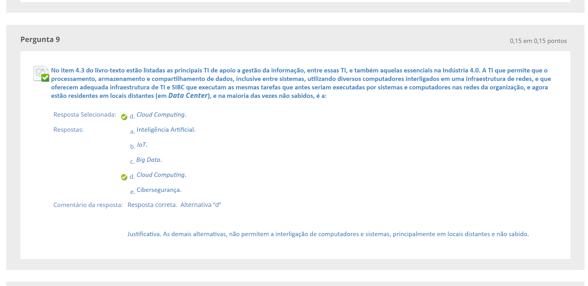 <p>Pergunta 9 0,15 em 0,15 pontos No item 4.3 do livro-texto estão listadas as principais TI de apoio a gestão da informação, entre essas TI, e também aquelas essenciais na Indústria 4.0. A que permite que processamento, armazenamento e compartilhamento de dados, inclusive entre sistemas, utilizando diversos computadores interligados em uma infraestrutura de redes, e que oferecem adequada infraestrutura de TI e SIBC que executam as mesmas tarefas que antes seriam executadas por sistemas e computadores nas redes da organização, e agora estão residentes em locais distantes (em Data Center), e na maioria das vezes não sabidos, é a: Resposta Selecionada: d. Cloud Computing. Respostas: a. Inteligência Artificial. b. C. Big Data. d. Cloud Computing. e. Cibersegurança. Comentário da resposta: Resposta correta. Alternativa "d" Justificativa. As demais alternativas, não permitem a interligação de computadores e sistemas, principalmente em locais distantes e não sabido.</p>
