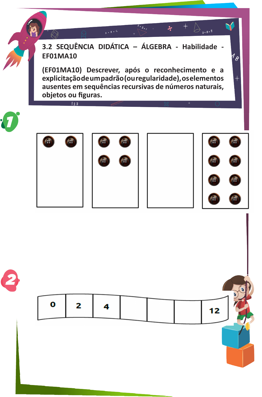 <p>49</p><p>3.2 SEQUÊNCIA DIDÁTICA – ÁLGEBRA - Habilidade -</p><p>EF01MA10</p><p>(EF01MA10) Descrever, após o reconhecimento e a</p><p>explicitação de um padrão (ou regularidade), os elementos</p><p>ausentes em sequências recursivas de números naturais,</p><p>objetos ou figuras.</p><p>OBSERVE COMO FICOU GUARDADO A COLEÇÃO DE BOTÕES DE THEO.</p><p>DESENHE NO QUADRO EM BRANCO A QUANTIDADE DE BOTÕES QUE ESTÃO</p><p>FALTANDO E MAQRUE UM X NA RESPOSTA CERTA:</p><p>A) ( ) 10</p><p>B) ( ) 8</p><p>C) ( ) 6</p><p>D) ( ) 4</p><p>OBSERVE A SEQUÊNCIA QUE JOSÉ FEZ. MAS ELE ESQUECEU ALGUNS NÚMEROS.</p><p>QUAIS FORAM OS NÚMEROS QUE JOSÉ ESQUECEU? MARQUE A ALTERNATIVA</p><p>CORRETA.</p><p>A) ( ) 4, 6, 10</p><p>B) ( ) 6, 8, 10</p><p>C) ( ) 2, 4, 8</p><p>D) ( ) 8, 10, 12</p><p>50</p><p>DESCUBRA A REGRA QUE FOI USADA PARA ESCREVER A SEQUÊNCIA DE NÚMEROS</p><p>ABAIXO. DEPOIS, COMPLETE COM OS NÚMEROS QUE FALTAM.</p><p>DESCUBRA A REGRA QUE FOI USADA PARA ESCREVER A SEQUÊNCIA DE NÚMEROS</p><p>ABAIXO. DEPOIS, COMPLETE COM OS NÚMEROS QUE FALTAM.</p><p>A) ( ) 12 , 13, 15, 17</p><p>B) ( ) 12, 15, 18, 21</p><p>C) ( ) 14, 17, 21, 25</p><p>D) ( ) 14, 18, 22, 26</p><p>QUAIS NÚMEROS ESTÃO FALTANDO NA RETA NUMÉRICA? DESTAQUE A OPÇÃO</p><p>COM A LETRA QUE INDICA A SEQUÊNCIA CORRETA.</p><p>NICOLAS ESTAVA JOGANDO DOMINÓ QUANDO PERCEBEU QUE ALGUMAS</p><p>PEÇAS DE SEU JOGO ESTAVAM APAGADAS. VAMOS AJUDAR NICOLAS A COMPLETAR A</p><p>SEQUÊNCIA DE ACORDO COM O JOGO.</p><p>AGORA QUE VOCÊ COMPLETOU O JOGO DE NICOLAS RESPONDA:</p><p>A. QUANTAS PEÇAS ESTAVAM APAGADAS?_________________________</p><p>B. QUANTAS PEÇAS TÊM O JOGO DE NICOLAS? _______________________</p><p>C. QUANTAS PEÇAS POSSUEM UM JOGO DE DOMINÓ TRADICIONAL?______</p><p>51</p><p>BRENDA FEZ UM QUADRO NUMÉRICO, PORÉM ESQUECEU-SE DE COLOCAR</p><p>ALGUNS NÚMEROS. QUAIS FORAM OS NÚMEROS QUE BRENDA ESQUECEU?</p><p>A) ( ) 4, 10, 13, 20</p><p>B) ( ) 2, 7, 14, 26</p><p>C) ( ) 7, 13, 20, 26</p><p>D) ( ) 8,11, 20, 30</p>
