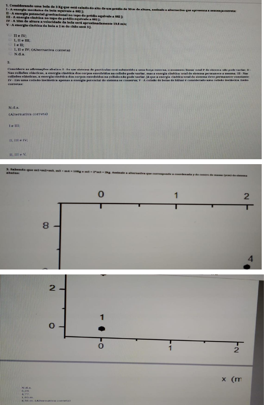 <p>1. Considerando uma bola de 3 Kg que está caindo do alto de um prédio de 30 m de assinale alternativa que apresenta sentença correta: A energia mecânica da equivale a J: II A energia potencial gravitacional no topo do prédio equivale a 882 J: III A energia cinética no topo do prédio equivale a IV A 10m de altura a velocidade da bola será aproximadamente A energia cinética da bola a 2 m do chão será II e IV: II e III: I e II: I. II e IV: (Alternativa correta) N.d.a. 2. Considere as afirmações abaixo: Se um sistema de particulas está submetido a uma força o momento total linear do sistema total P permanece do sistema não a mesma: pode variar: III Nas II Nas colisões a energia cinética dos corpos envolvidos envolvidos na colisão na colisão não pode pode que a energia total do sistema deve permanecer Estão a energia cinética colisões IV Em uma elásticas, colisão a energia cinética apenas dos energia corpos potencial do sistema conserva: A colisão de bolas de bilhar e considerado uma corretas: (Alternativa correta) III IV: 3. Sabendo que m3 alternativa que corresponde , centre de massa de sistema o 1 2 8 4 2 1 o o 1 2 (m</p><p>vezes 4. (IFSC de 2012) concreto, o bate-estacas que fazem parte um dispositivo da multo utilizado na fase Inicial de uma construção. Ele responsável pela colocação das das um encontra funcionamento cabo de logo aco. abaixo. do um bate-estacas enorme o processo peso baseado de suspensão fundação no que e de abandono abandonado um do peso por de uma sohre a estaca o por funcionamento exemplo, até de dele 10 estaca m. e relativamente que estar acaba na posição atingindo simples: desejada. a um estaca motor de CORRETO concreto na afirmar que maloria através se que de de: Colisões do tipo elástico entre martelo e à estaca; A conservação da quantidade de movimento do A transformação da energia mecânica do martelo em energia térmica da A transformação da energia potencial gravitacional em trabalho para empurrar a (Alternativa correta) Transformação da energia elétrica do motor em energia potencial elástica do 5. Considere uma mola elástica que está submetida a ação de força de 20 N. e está deformada de cm. A energia armazenada na mola é do tipo (e tem equivalente) Energia Potencial U 0,3 (Alternativa correta) Energia Potencial 0.3 Energia Cinética, U Energia cinética, K 0,3 N.d.a. 6. Determine a energia potencial gravitacional de uma moeda de 10g que do alto de prateleira de I N.d.a. 14.7 0.147 (Alternativa correta) coelho de kg se move com velocidade de um tigre que pretende devora triplica sua velocidade A energia cinética 7. do coelho, avistar tigre a variação da energia do coelho respectivamente (Alternativa correta)</p><p>Um elétron de massa 9,1*10-31 Kg é acele por um acelerador de a uma taxa de elétron equivale a 2,5*107 m/s e o mesmo se I - Após se deslocar a velocidade do elétron m/s; II - A energia cinética inicial do elétron equivale III - A energia cinética final do elétron equivale IV - A variação da energia cinética equivale a V - Trabalho equivale a aproximadamente 1 Assinale alternativa que apresenta a sentença 9. base (FATEC da 2002) Um bloco de massa é a partir do no ponto A de uma pista no plano ponto A está a 2.0m de altura pista, onde está fixa uma mola de constante elástica 150 N/m. São os efeitos do atrito. A máxima compressão da mola em metros: da N.d.a. (Alternativa correta) 10. (Adaptado de Halliday 2012) Um volante que gira em torno do central está perdendo velocidade por causa do atrito com eixo. primeiro minute de desaceleração sua velocidade angular vez a velocidade angular Inicial de 250 Supondo que a aceleração angular é constante, a velocidade angular após o segundo minuto será: 200 rev/min: (Alternativa correta) 100 N.d.a. as 250 rev/min: 25</p>