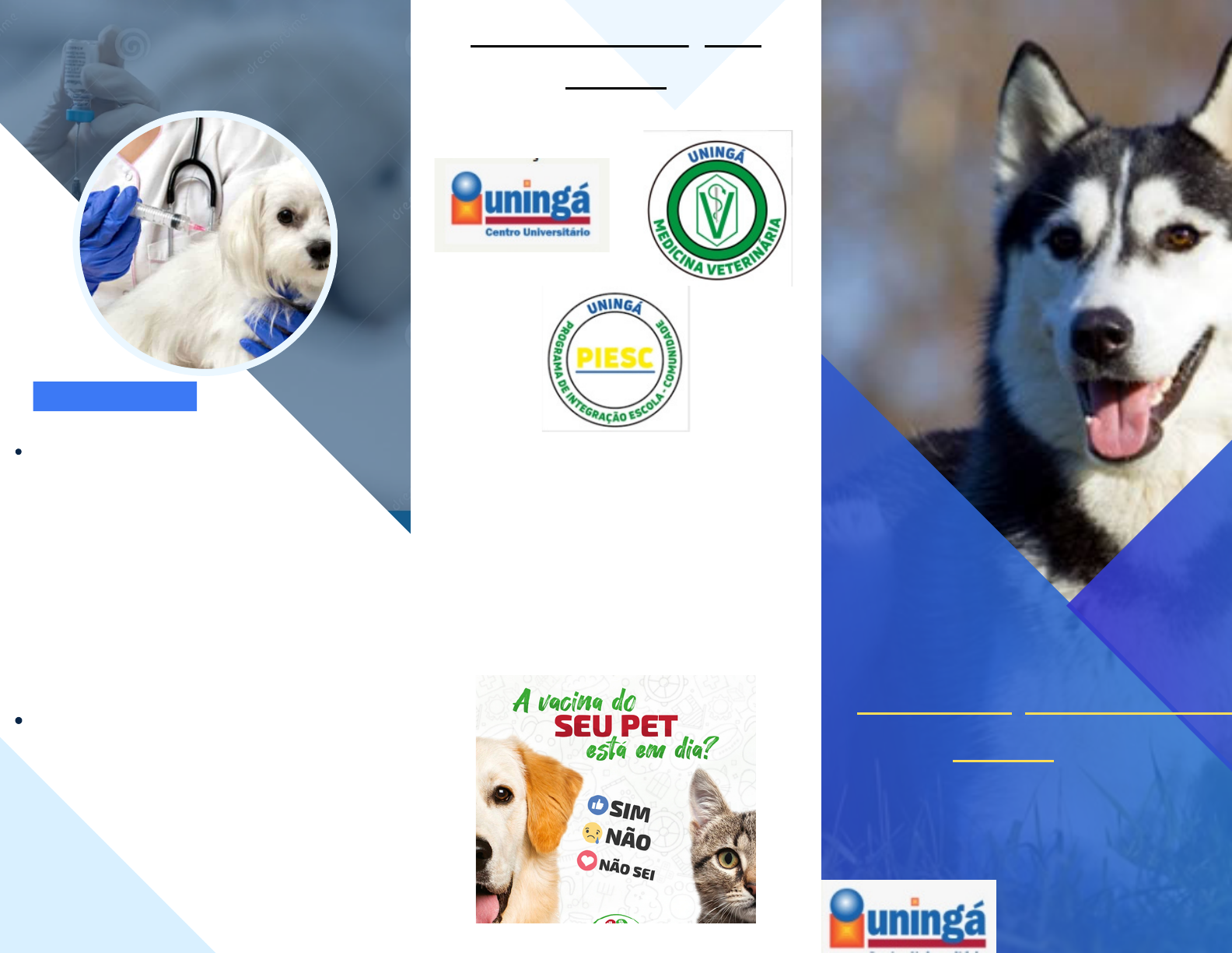<p>VACINAÇÃO DE</p><p>CÃES</p><p>As vacinas para cães</p><p>desempenham um papel</p><p>fundamental para a saúde e</p><p>bem estar dos pets. Com</p><p>esse gesto de carinho, os</p><p>tutores ajudam a prevenir</p><p>doenças graves, que podem</p><p>surgir em qualquer fase da</p><p>vida do animal e botar em</p><p>risco toda a família.</p><p>Vacinar os pets é um ato</p><p>de amor</p><p>“Vaciná- lo i rá permit i r que e le</p><p>permaneça saudável ! Proteger</p><p>as pessoas contra os agentes</p><p>ci rcu lantes dessas doenças. A</p><p>vacinação prev ine o contágio</p><p>de um animal para o outro , ou</p><p>mesmo para as pessoas.”</p><p>EM REALIZAÇÃO</p><p>PELA:</p><p>CURIOSIDADES</p><p>Doenças graves como a</p><p>Leishmaniose e a Raiva podem ser</p><p>transmitidas dos cães para os</p><p>humanos. E mesmo as doenças</p><p>menos graves e não transmissíveis</p><p>costumam gerar grandes estresses</p><p>psicológicos e financeiros, que</p><p>poderiam ser evitados com as</p><p>vacinas para cães.</p><p>Cinomose</p><p>O vírus da cinomose é</p><p>altamente contagioso e se</p><p>dispersa por gotículas</p><p>oronasais a partir de 7 dias de</p><p>infecção.</p><p>PRINCIPAIS DOENÇAS</p><p>INFECCIOSAS</p><p>CANINAS QUE PODEM</p><p>SER EVITADAS POR</p><p>VACINAÇÃO</p><p>Parvovirose</p><p>A febre, leucopenia (diminuição dos</p><p>glóbulos brancos do sangue) além de</p><p>sintomas cardíacos nos filhotes anorexia,</p><p>depressão, vômitos, pirexia, rápida</p><p>desidratação, diarréia sanguinolenta,</p><p>líquida e fétida e rápido emagrecimento.</p><p>Leptospirose</p><p>Febre (geralmente durante o curso</p><p>precoce da doença), Letargia e fraqueza,</p><p>Inapetência, Poliúria e polidipsia, Vômito e</p><p>diarréia, Colúria, Abortos, Icterícia.</p><p>VACINAS</p><p>ESSENCIAIS</p><p>Raiva</p><p>Febre, midríase, êmese, ataxia, disfagia,</p><p>tremores, paralisia, distonia e alteração</p><p>de comportamento, entre outros.</p><p>https://www.zoetis.com.br/prevencaocaesegatos/posts/c%C3%A3es/principais-doen%C3%A7as-infecciosas-caninas-que-podem-ser-evitadas-por-vacina%C3%A7%C3%A3o.aspx</p><p>https://www.zoetis.com.br/prevencaocaesegatos/posts/c%C3%A3es/principais-doen%C3%A7as-infecciosas-caninas-que-podem-ser-evitadas-por-vacina%C3%A7%C3%A3o.aspx</p><p>https://www.zoetis.com.br/prevencaocaesegatos/posts/c%C3%A3es/principais-doen%C3%A7as-infecciosas-caninas-que-podem-ser-evitadas-por-vacina%C3%A7%C3%A3o.aspx</p><p>https://www.zoetis.com.br/prevencaocaesegatos/posts/c%C3%A3es/principais-doen%C3%A7as-infecciosas-caninas-que-podem-ser-evitadas-por-vacina%C3%A7%C3%A3o.aspx</p><p>https://www.zoetis.com.br/prevencaocaesegatos/posts/c%C3%A3es/principais-doen%C3%A7as-infecciosas-caninas-que-podem-ser-evitadas-por-vacina%C3%A7%C3%A3o.aspx</p>