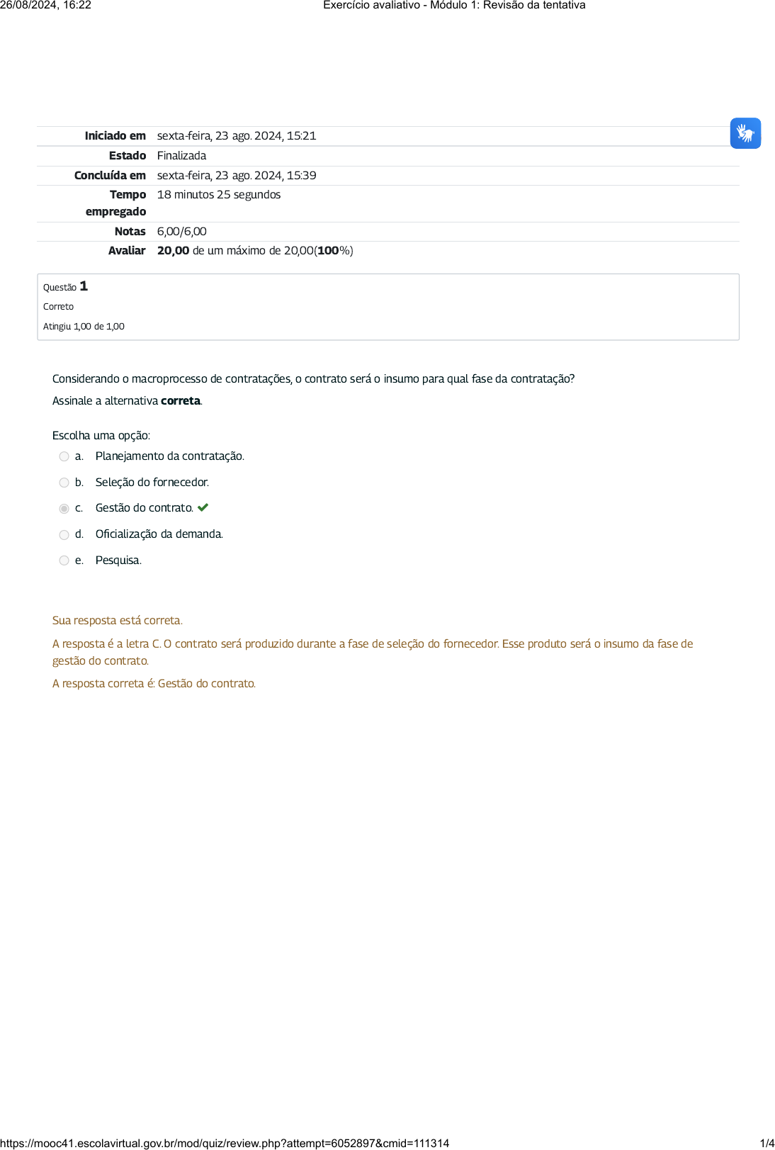 <p>Iniciado em sexta-feira, 23 ago. 2024, 15:21</p><p>Estado Finalizada</p><p>Concluída em sexta-feira, 23 ago. 2024, 15:39</p><p>Tempo</p><p>empregado</p><p>18 minutos 25 segundos</p><p>Notas 6,00/6,00</p><p>Avaliar 20,00 de um máximo de 20,00(100%)</p><p>Questão 1</p><p>Correto</p><p>Atingiu 1,00 de 1,00</p><p>Considerando o macroprocesso de contratações, o contrato será o insumo para qual fase da contratação?</p><p>Assinale a alternativa correta.</p><p>Escolha uma opção:</p><p>a. Planejamento da contratação.</p><p>b. Seleção do fornecedor.</p><p>c. Gestão do contrato. </p><p>d. O�cialização da demanda.</p><p>e. Pesquisa.</p><p>Sua resposta está correta.</p><p>A resposta é a letra C. O contrato será produzido durante a fase de seleção do fornecedor. Esse produto será o insumo da fase de</p><p>gestão do contrato.</p><p>A resposta correta é: Gestão do contrato.</p><p>26/08/2024, 16:22 Exercício avaliativo - Módulo 1: Revisão da tentativa</p><p>https://mooc41.escolavirtual.gov.br/mod/quiz/review.php?attempt=6052897&cmid=111314 1/4</p><p>Questão 2</p><p>Correto</p><p>Atingiu 1,00 de 1,00</p><p>Questão 3</p><p>Correto</p><p>Atingiu 1,00 de 1,00</p><p>O modelo de gestão contratual é de�nido durante o planejamento da contratação.</p><p>Assinale a alternativa QUE NÃO apresenta um item que deve ser de�nido na fase de planejamento.</p><p>Escolha uma opção:</p><p>a. Itens que compõem o faturamento mensal. </p><p>b. Indicadores que serão utilizados para medição dos resultados.</p><p>c. Relação de documentos a serem entregues mensalmente.</p><p>d. Unidade responsável pela �scalização.</p><p>e. Modelo de execução do contrato.</p><p>Sua resposta está correta.</p><p>A resposta é a letra A. Os itens que compõem o faturamento mensal serão apurados pela atividade de �scalização, observado o modelo</p><p>de execução que foi de�nido no planejamento.</p><p>A resposta correta é: Itens que compõem o faturamento mensal.</p><p>A gestão e a �scalização de contratos são realizadas por diversos atores.</p><p>Assinale a alternativa que descreve a �scalização técnica, nos moldes da IN Seges/ME n. 5/2017:</p><p>Escolha uma opção:</p><p>a. Acompanhamento com o objetivo de avaliar a execução do objeto nos moldes contratados e, se for o caso, aferir se a</p><p>quantidade, a qualidade, o tempo e o modo da prestação dos serviços estão compatíveis com os indicadores de níveis</p><p>mínimos de desempenho estipulados no ato convocatório.</p><p></p><p>b. Acompanhamento dos aspectos administrativos da execução dos serviços nos contratos com regime de dedicação exclusiva</p><p>de mão de obra quanto às obrigações previdenciárias, �scais e trabalhistas.</p><p>c. Coordenação das atividades relacionadas à �scalização técnica, administrativa, setorial e pelo público usuário, bem como dos</p><p>atos preparatórios à instrução processual e ao encaminhamento da documentação pertinente ao setor de contratos para</p><p>formalização dos procedimentos quanto aos aspectos que envolvam a prorrogação, a alteração, o reequilíbrio, o pagamento, a</p><p>eventual aplicação de sanções, a extinção dos contratos, entre outros.</p><p>d. Acompanhamento da execução do contrato nos aspectos técnicos ou administrativos quando a prestação dos serviços ocorrer</p><p>concomitantemente em setores distintos ou em unidades desconcentradas de um mesmo órgão ou entidade.</p><p>e. Acompanhamento da execução contratual por pesquisa de satisfação junto ao usuário com o objetivo de aferir os resultados</p><p>da prestação dos serviços, os recursos materiais e os procedimentos utilizados pela contratada, quando for o caso, ou outro</p><p>fator determinante para a avaliação dos aspectos qualitativos do objeto.</p><p>Sua resposta está correta.</p><p>A resposta é a letra A. Nos termos do art. 40 da Instrução Normativa n. 5/2017, a �scalização técnica é o acompanhamento com o</p><p>objetivo de avaliar a execução do objeto nos moldes contratados e, se for o caso, aferir se a quantidade, a qualidade, o tempo e o modo</p><p>da prestação dos serviços estão compatíveis com os indicadores de níveis mínimos de desempenho estipulados no ato convocatório.</p><p>A resposta correta é: Acompanhamento com o objetivo de avaliar a execução do objeto nos moldes contratados e, se for o caso, aferir</p><p>se a quantidade, a qualidade, o tempo e o modo da prestação dos serviços estão compatíveis com os indicadores de níveis mínimos de</p><p>desempenho estipulados no ato convocatório.</p><p>26/08/2024, 16:22 Exercício avaliativo - Módulo 1: Revisão da tentativa</p><p>https://mooc41.escolavirtual.gov.br/mod/quiz/review.php?attempt=6052897&cmid=111314 2/4</p><p>Questão 4</p><p>Correto</p><p>Atingiu 1,00 de 1,00</p><p>Questão 5</p><p>Correto</p><p>Atingiu 1,00 de 1,00</p><p>A �scalização pelo público usuário visa considerar a satisfação dos usuários com os resultados da prestação dos serviços, os recursos</p><p>materiais e os procedimentos utilizados pela contratada.</p><p>Assinale a alternativa QUE NÃO apresenta um exemplo dessa modalidade de �scalização:</p><p>Escolha uma opção:</p><p>a. Informações sobre a indisponibilidade de materiais de limpeza e higiene nos banheiros.</p><p>b. Veri�cação da data de pagamento do auxílio-transporte. </p><p>c. Pesquisa da qualidade da comida servida no restaurante existente no órgão.</p><p>d. Quantidade de ocorrências de banheiros sujos.</p><p>e. Manifestação dos chefes dos setores nos quais são realizados os serviços de apoio administrativo.</p><p>Sua resposta está correta.</p><p>A resposta é a letra B. O auxílio-transporte é uma obrigação trabalhista que será objeto da �scalização administrativa.</p><p>A resposta correta é: Veri�cação da data de pagamento do auxílio-transporte.</p><p>Acerca da responsabilidade do gestor e