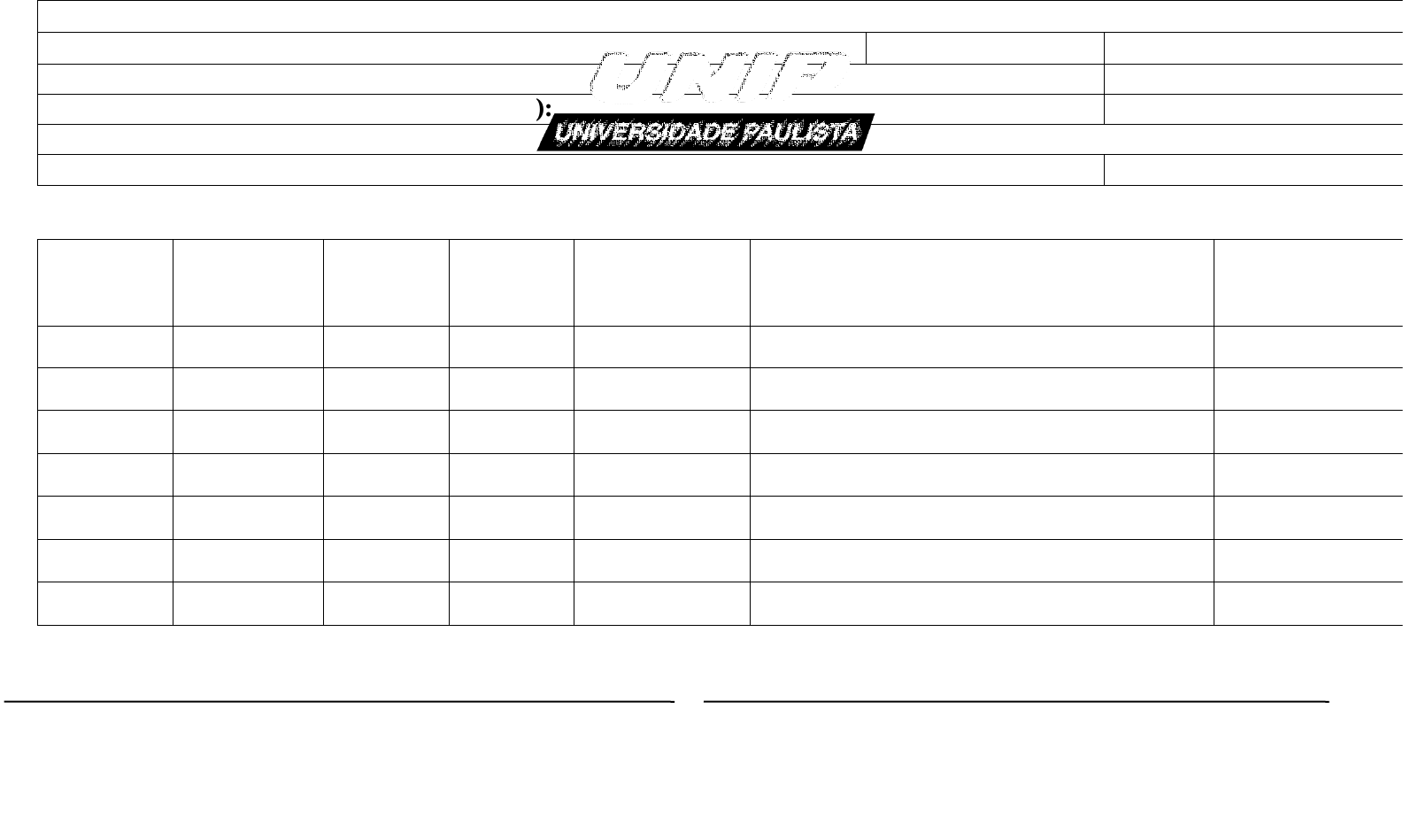 <p>Instituição: UNIVERSIDADE PAULISTA - UNIP</p><p>Curso: Bacharelado em Educação Física</p><p>Semestre:</p><p>Ano:</p><p>Aluno (a):</p><p>Matricula</p><p>Supervisor (a) Orientador (a) do Estagio (IES):</p><p>CREF:</p><p>Concedente:</p><p>Supervisor (a) de Campo:</p><p>CREF:</p><p>FICHA-MEIO DE ESTAGIO SUPERVISIONADO “IN LOCO”</p><p>DATA</p><p>ENTRADA</p><p>SAÍDA</p><p>HORAS</p><p>DISCIPLINAS</p><p>DESCRIÇÃO SUMÁRIA DA ATIVIDADE</p><p>ASS. DO</p><p>ALUNO (A)</p><p>Travesso Benjamin Constant, 529</p><p>Bairro: Caiçara</p><p>CEP: 68743-422, Castanhal-PA</p><p>Prof. Orientador de Estagio/UNIP (ASS. e Carimbo /CREF)</p><p>Supervisor Estágio/CONCEDENTE (ASS. e Carimbo /CREF)</p><p>image1.png</p>