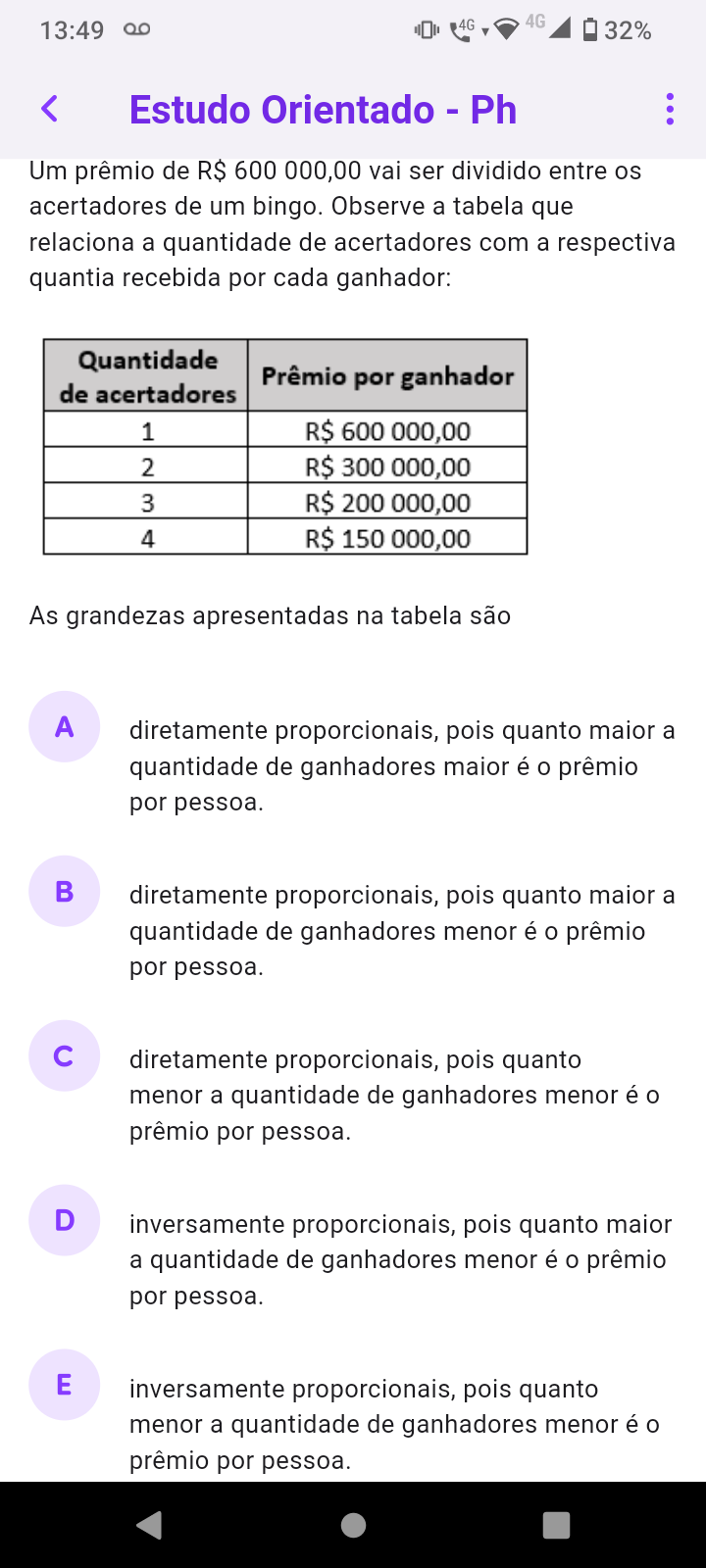 <p>4G 4G 13:49 so 32% < Estudo Orientado - Ph : Um prêmio de R$ 600 000,00 vai ser dividido entre os acertadores de um bingo. Observe a tabela que relaciona a quantidade de acertadores com a respectiva quantia recebida por cada ganhador: Quantidade Prêmio por ganhador de acertadores 1 R$ 600 000,00 2 R$ 300 000,00 3 R$ 200 000,00 4 R$ 150 000,00 As grandezas apresentadas na tabela são A diretamente proporcionais, pois quanto maior a quantidade de ganhadores maior é o prêmio por pessoa. B diretamente proporcionais, pois quanto maior a quantidade de ganhadores menor é o prêmio por pessoa. C diretamente proporcionais, pois quanto menor a quantidade de ganhadores menor é o prêmio por pessoa. D inversamente proporcionais, pois quanto maior a quantidade de ganhadores menor é o prêmio por pessoa. E inversamente proporcionais, pois quanto menor a quantidade de ganhadores menor é o prêmio por pessoa.</p>