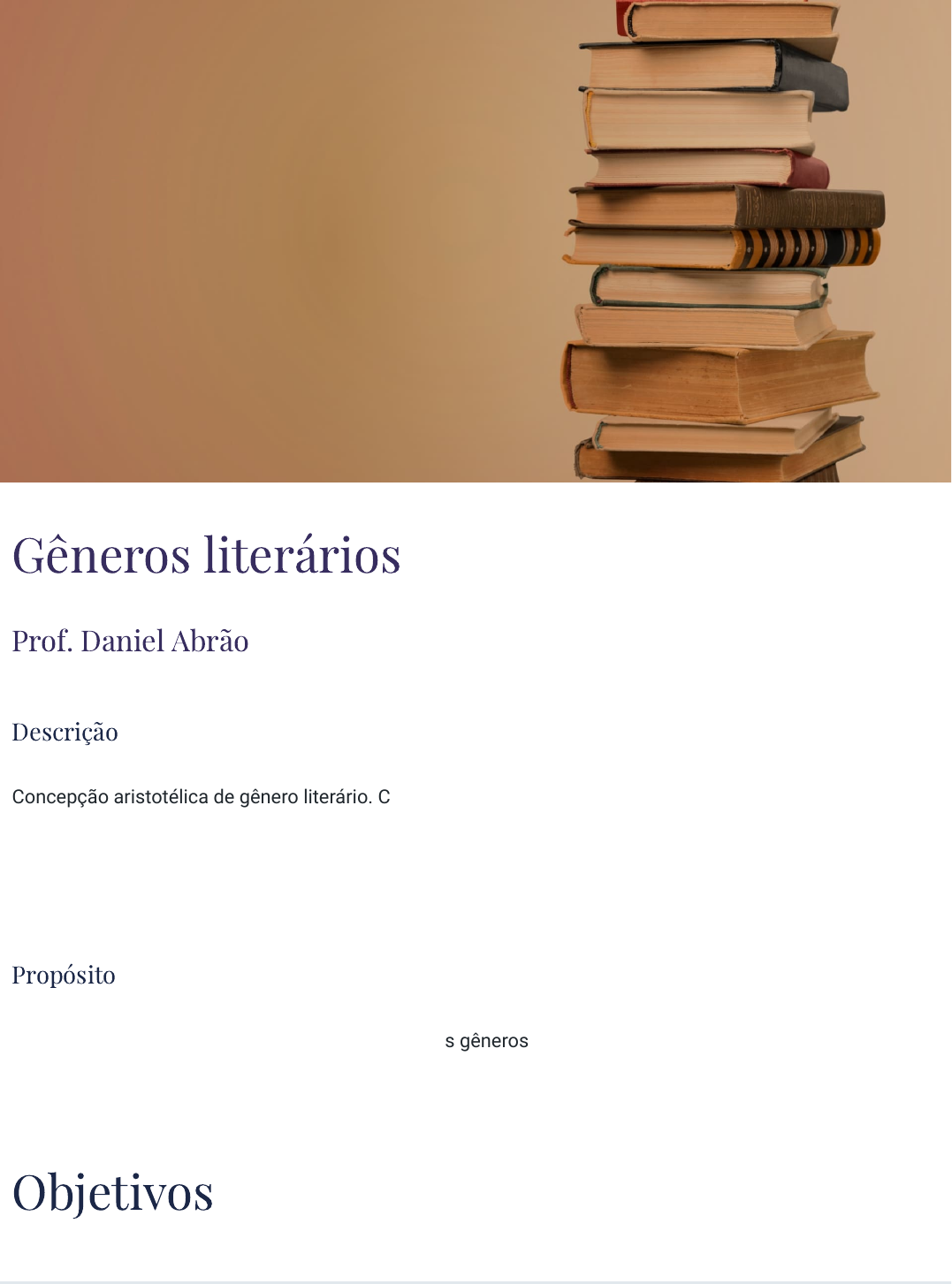 <p>Gêneros literários</p><p>Prof. Daniel Abrão</p><p>Descrição</p><p>Concepção aristotélica de gênero literário. Conceitos e contextos de definição dos gêneros épico, lírico e</p><p>dramático. Gêneros literários e suas variações nos contextos clássico, romântico, moderno, de vanguarda e</p><p>contemporâneo: romance, novela, conto, crônica, ensaio, poema, poema em prosa, romance psicológico e</p><p>romance policial.</p><p>Propósito</p><p>Compreender as concepções e transformações dos gêneros literários para uma reflexão sobre as diferentes</p><p>fases da literatura ao longo da história.</p><p>Objetivos</p><p>Módulo 1</p><p>Conceito de gênero literário</p><p>Identificar a concepção aristotélica de gênero literário.</p><p>Módulo 2</p><p>Gêneros épico, lírico e dramático</p><p>Distinguir as características dos gêneros épico, lírico e dramático.</p><p>Módulo 3</p><p>Problemas e perspectivas sobre gêneros literários</p><p>Descrever a problemática dos gêneros literários, da visão romântica à contemporaneidade.</p><p>Introdução</p><p>O poeta é um fingidor.</p><p>Finge tão completamente</p><p>Que chega a fingir que é dor</p><p>A dor que deveras sente.</p><p>(Fernando Pessoa)</p><p></p><p>A literatura é conhecida atualmente por conter textos denominados ficcionais ou imaginativos. Em linhas</p><p>gerais, textos criados a partir de realidades inventadas, mas devemos saber que nem sempre foi assim.</p><p>Quando assistimos a um filme, a uma novela, a documentários, entre outros, devemos ter em mente que</p><p>tudo partiu de um texto escrito, na maioria das vezes, um texto oriundo de um gênero literário, com suas</p><p>marcas específicas.</p><p>Nem sempre os textos literários se referem a realidades inventadas, mas são representações, cada obra</p><p>feita à sua maneira, de traços do que chamamos real ou, ainda, perspectivas de estados de espírito, o que</p><p>chamamos de representações da subjetividade (o chamado Eu interior).</p><p>Você sabe como surgiu a expressão literatura?</p><p>A expressão literatura é oriunda do século XVIII, criada para dar conta de uma série de textos que se</p><p>diferenciavam dos textos religiosos, da filosofia, da história, bem como de outras áreas desenvolvidas até</p><p>aquele momento.</p><p>Esses textos, hoje chamados de literários, anteriormente eram conhecidos como “belas letras”, justamente</p><p>pelos recursos estilísticos que compunham uma escrita recheada de recursos linguísticos que se</p><p>diferenciavam da linguagem objetiva da comunicação oral e escrita.</p><p>O que são gêneros literários?</p><p>São considerados gêneros literários certos textos que possuem características em comum, isto é, aqueles</p><p>que são compostos tendo como base a repetição ou constância de elementos análogos na forma e no</p><p>conteúdo, segundo critérios estabelecidos, como:</p><p>1. A estrutura de composição;</p><p>2. A parte semântica – construção de significados ou sentidos de um texto;</p><p>3. O contexto de leitura ou interlocução.</p><p>É exatamente do estudo dos gêneros literários, com suas origens, definições, características e</p><p>problematizações, que vamos tratar neste tema.</p><p>1 - Conceito de gênero literário</p><p>Ao �nal deste módulo, você será capaz de identi�car a concepção</p><p>aristotélica de gênero literário.</p><p>Considerações preliminares sobre os</p><p>gêneros literários</p><p>A divisão de gêneros literários aparece pela primeira vez no livro A República, de Platão. Posteriormente, em</p><p>Poética, de Aristóteles, que, observando a arte de seu período, estabeleceu a seguinte classificação:</p><p>gêneros épico, lírico e dramático.</p><p>Posteriormente, a classificação se alterou para gênero narrativo, lírico e dramático. Essas classificações</p><p>são consideradas clássicas e sofreram modificações e subdivisões ao longo do tempo. Veja a seguir.</p><p>Platão</p><p>Filósofo grego que nasceu em Atenas, por volta do ano 427 a.C., e morreu na mesma cidade, em 347 a.C.</p><p>Aristóteles</p><p>Filósofo grego, discípulo de Platão, nascido em Estagira, em 384 a.C., e falecido em Atenas, em 322 a.C.</p><p>Gênero lírico</p><p>Ao longo da história, espalhou-se em subgêneros, como ode, hino, elegia, idílio, écloga, epitalâmio, sátira,</p><p>entre outros.</p><p>Gênero dramático</p><p>Ao longo da história se subdividiu, como exemplo, em auto, comédia, tragédia, tragicomédia, farsa e drama.</p><p>Gênero épico</p><p>Ao longo da história sofreu modificações. Atualmente, sua matriz é muito usada nas sagas ficcionais, mas,</p><p>em seus desdobramentos, podemos compará-lo às novas formas surgidas, como, por exemplo, o romance,</p><p>a novela, o conto, a fábula, a crônica, o ensaio, entre outros.</p><p>Não podemos confundir gênero literário com gênero textual. Veja a seguir.</p><p>Gêneros literários</p><p>São formas de gêneros textuais, mas não se confundem, em definição, com eles.</p><p>Gêneros textuais</p><p>São compostos de textos diversos, não literários, como diário, notícia, artigo, e-mail, carta, ofício,</p><p>resenha etc.</p><p>Os gêneros textuais, dessa forma, são inúmeros e criados constantemente, pois dependem das formas de</p><p>circulação e interlocução, isto é, suas estruturas formais dependem dos agentes envolvidos na</p><p>comunicação, bem como em suas funções no diálogo.</p><p>Outra confusão a ser evitada é não misturar gênero textual com tipo</p><p>textual, pois os tipos textuais são: narração, descrição, dissertação</p><p>(ou exposição), argumentação, informação e injunção.</p><p>Agora que já temos um panorama dos gêneros literários, vamos continuar estudando cada um deles,</p><p>conhecer sua história, denominações e variações. Precisamos saber que a concepção de gêneros, ao longo</p><p>da histór