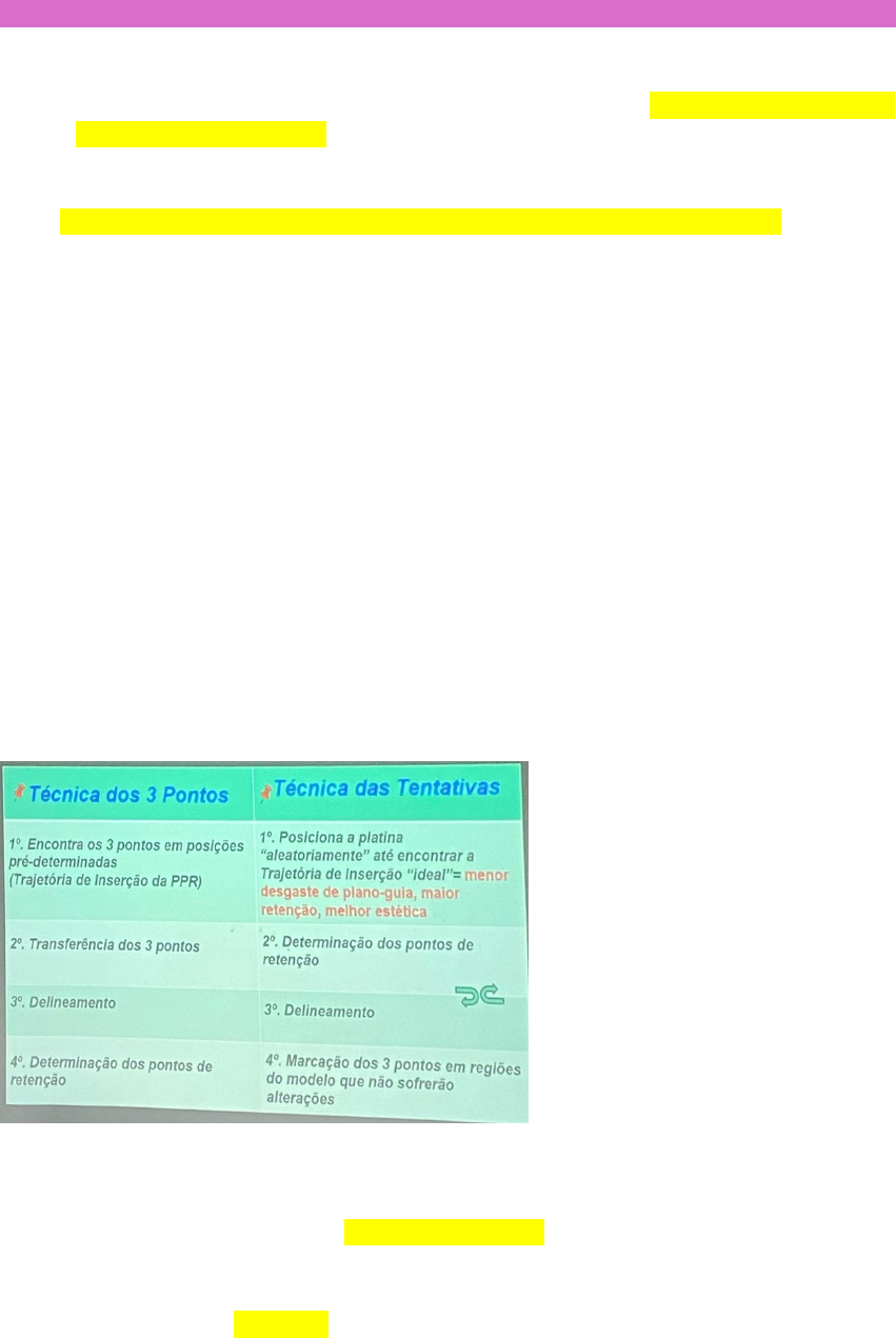<p>Protocolo clínico laboratorial para confecção de PPR</p><p>1° sessão clínica:</p><p>1. Primeira moldagem de estudo – com alginato/ SEMPRE personalizar a moldeira com cera/ O molde deve copiar todo fundo de vestíbulo com um afastamento adequado dos lábios e bochechas.</p><p>2. Segunda moldagem do arco antagonista – com alginato.</p><p>3. Vazamento do modelo de estudo – com gesso pedra/ modelo recordado corretamente: base com 2cm de altura, para o correto posicionamento na platina/ modelo inferior deve apresentar a parte da língua.</p><p>2° sessão laboratorial:</p><p>1. Localização dos apoios.</p><p>2. Retentores diretos e indiretos.</p><p>3. Localização dos conectores menores.</p><p>4. Tipo de conector maior.</p><p>5. Número de dentes artificiais.</p><p>2° determinação da trajetória de inserção da PPR:</p><p>1. Método de roach (três pontos).</p><p>2. Técnica das tentativas.</p><p>3° grafite colorido ???</p><p>4° determinação dos pontos de retenção nos dentes de suporte da PPR – marcar os pontos com grafite vermelho.</p><p>5° desenho da armação metálica.</p><p>6° mapeamento – SEMPRE realizado</p><p>1. Dentes que receberão nichos.</p><p>2. Dentes que necessitam de planos guias.</p><p>3. Dentes que necessitam de modificação de contorno – acréscimo e decréscimo.</p><p>Preparo de boca dos dentes de suporte da PPR</p><p>1. Planos guias, se necessário.</p><p>2. Nichos, SEMPRE.</p><p>3. Modificações de contorno, se necessário.</p><p>Moldagem de trabalho – em casos de classe lll e lV de Kenedy.</p><p>1. Alginato cavex.</p><p>· Individualização da moldeira de estoque com cera.</p><p>· Afastamento adequado dos tecidos moles e língua.</p><p>2. Silicona de condensação (densa e fluida)</p><p>· Moldeira de estoque.</p><p>· Técnica de impressão única ou reembasamento.</p><p>Em casos de classe l ou ll de Kenedy</p><p>1. Moldeira individual de resina acrílica.</p><p>2. Selado periférico (SOMENTE em região edentada).</p><p>3. Silicona de condensação (SOMENTE a fluida).</p><p>· Pode moldar com essa técnica caso seja preferência do orientador.</p><p>4. Alginato cavex</p><p>· Individualização da moldeira de estoque com cera.</p><p>· Afastamento adequado dos tecidos moles e língua.</p><p>Vazamento do modelo de trabalho – realizar o vazamento de gesso em duas etapas:</p><p>1. Primeira camada – a região dos dentes: com gesso pedra especial.</p><p>2. Segunda camada – a base do modelo: com gesso pedra.</p><p>· Correta proporção de água e pó.</p><p>· Obrigatório o uso de pincel + vibrador de gesso.</p><p>· Não pode haver bolhas no modelo.</p><p>4° sessão laboratorial:</p><p>1° transferência da trajetória de inserção da PPR.</p><p>Por que devemos realizar a transferência da trajetória de inserção da PPR do modelo de estudo para o modelo de trabalho? Para não perder a trajetória de inserção e melhorar a precisão da PPR.</p><p>2° desenho da armação metálica no modelo de trabalho</p><p>1. Não aprofundar muito o grafite para não danificar o modelo.</p><p>2. Manter o posicionamento dos braços e pontas ativas dos grampos de estudo.</p><p>4° sessão clínica</p><p>1° prova de armação metálica:</p><p>1. Checar o correto assentamento de todos os elementos da PPR em suas posições.</p><p>2. Checar a oclusão.</p><p>2° registro interoclusal:</p><p>1. Se houver estabilidade oclusal – MIH.</p><p>2. Se não houver estabilidade oclusal – RC.</p><p>3° seleção da cor dos dentes artificiais:</p><p>1. Utilizar a escala correspondente a marca comercial do dente escolhido.</p><p>4° montagem no articulador.</p><p>5° mandar para o protético.</p><p>5° sessão clínica</p><p>Prova dos dentes de cera</p><p>1. Forma e cor.</p><p>2. Posicionamento dental.</p><p>3. Oclusão.</p><p>4. Pequenos ajustes podem ser reduzidos.</p><p>5. Participação do paciente.</p><p>6° sessão clínica</p><p>Entrega da PPR</p><p>1. Assentamento da prótese.</p><p>2. Conforto.</p><p>3. Estética.</p><p>4. Oclusão.</p><p>5. Realizar os ajustes, se necessário.</p><p>6. Entrega das orientações impressas do uso da prótese (assinatura do paciente comprovando o recebimento).</p><p>Proservação</p><p>1. Uma semana após a entrega.</p><p>2. Realizar ajustes, se necessário.</p><p>3. Retornos semanais até o paciente não relatar mais queixas.</p><p>4. Controles periódicos a cada 6 meses.</p><p>image1.jpeg</p>