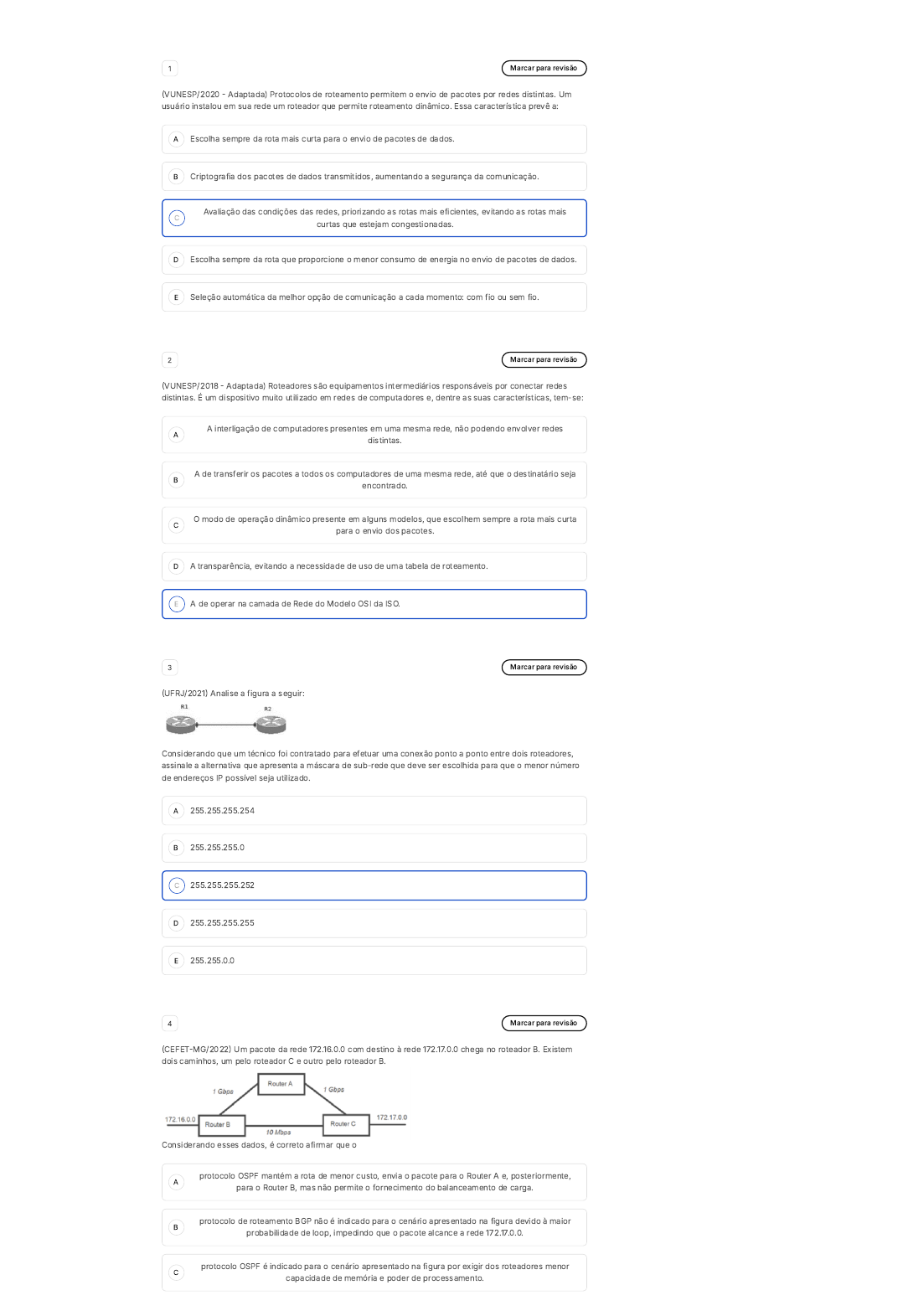 <p>A</p><p>B</p><p>C</p><p>D</p><p>E</p><p>A</p><p>B</p><p>C</p><p>D</p><p>E</p><p>A</p><p>B</p><p>C</p><p>D</p><p>E</p><p>A</p><p>B</p><p>C</p><p>1 Marcar para revisão</p><p>�VUNESP/2020 � Adaptada) Protocolos de roteamento permitem o envio de pacotes por redes distintas. Um</p><p>usuário instalou em sua rede um roteador que permite roteamento dinâmico. Essa característica prevê a:</p><p>Escolha sempre da rota mais curta para o envio de pacotes de dados.</p><p>Criptografia dos pacotes de dados transmitidos, aumentando a segurança da comunicação.</p><p>Avaliação das condições das redes, priorizando as rotas mais eficientes, evitando as rotas mais</p><p>curtas que estejam congestionadas.</p><p>Escolha sempre da rota que proporcione o menor consumo de energia no envio de pacotes de dados.</p><p>Seleção automática da melhor opção de comunicação a cada momento: com fio ou sem fio.</p><p>2 Marcar para revisão</p><p>�VUNESP/2018 � Adaptada) Roteadores são equipamentos intermediários responsáveis por conectar redes</p><p>distintas. É um dispositivo muito utilizado em redes de computadores e, dentre as suas características, tem-se:</p><p>A interligação de computadores presentes em uma mesma rede, não podendo envolver redes</p><p>distintas.</p><p>A de transferir os pacotes a todos os computadores de uma mesma rede, até que o destinatário seja</p><p>encontrado.</p><p>O modo de operação dinâmico presente em alguns modelos, que escolhem sempre a rota mais curta</p><p>para o envio dos pacotes.</p><p>A transparência, evitando a necessidade de uso de uma tabela de roteamento.</p><p>A de operar na camada de Rede do Modelo OSI da ISO.</p><p>3 Marcar para revisão</p><p>�UFRJ/2021� Analise a figura a seguir:</p><p>Considerando que um técnico foi contratado para efetuar uma conexão ponto a ponto entre dois roteadores,</p><p>assinale a alternativa que apresenta a máscara de sub-rede que deve ser escolhida para que o menor número</p><p>de endereços IP possível seja utilizado.</p><p>255.255.255.254</p><p>255.255.255.0</p><p>255.255.255.252</p><p>255.255.255.255</p><p>255.255.0.0</p><p>4 Marcar para revisão</p><p>�CEFET�MG/2022� Um pacote da rede 172.16.0.0 com destino à rede 172.17.0.0 chega no roteador B. Existem</p><p>dois caminhos, um pelo roteador C e outro pelo roteador B.</p><p>Considerando esses dados, é correto afirmar que o</p><p>protocolo OSPF mantém a rota de menor custo, envia o pacote para o Router A e, posteriormente,</p><p>para o Router B, mas não permite o fornecimento do balanceamento de carga.</p><p>protocolo de roteamento BGP não é indicado para o cenário apresentado na figura devido à maior</p><p>probabilidade de loop, impedindo que o pacote alcance a rede 172.17.0.0.</p><p>protocolo OSPF é indicado para o cenário apresentado na figura por exigir dos roteadores menor</p><p>capacidade de memória e poder de processamento.</p><p>D</p><p>E</p><p>A</p><p>B</p><p>C</p><p>D</p><p>E</p><p>A</p><p>B</p><p>C</p><p>D</p><p>E</p><p>A</p><p>B</p><p>C</p><p>D</p><p>E</p><p>A</p><p>B</p><p>C</p><p>protocolo RIP pode adotar os dois caminhos, quando o balanceamento de carga está habilitado nos</p><p>roteadores.</p><p>protocolo RIP, independentemente da velocidade dos links, enviará o pacote diretamente para o</p><p>Router C sem passar pelo Router A.</p><p>5 Marcar para revisão</p><p>�IADES/2021� Na literatura de redes de computadores, há dois tipos de protocolos de roteamento: Interior</p><p>Gateway Protocol �IGP) e Exterior Gateway Protocol �EGP�. Com relação aos protocolos de roteamento, assinale</p><p>a alternativa correta.</p><p>O protocolo Routing Information Protocol �RIP) utiliza roteamento por estado de enlace.</p><p>O Border Gateway Protocol �BGP) é um tipo de IGP para interligar sistemas autônomos.</p><p>O Open Shortest Path First Protocol �OSPF) utiliza o roteamento por estado de enlace otimizado.</p><p>O Border Gateway Protocol �BGP) foi projetado para executar o roteamento interno do sistema</p><p>autônomo.</p><p>O Open Shortest Path First Protocol �OSPF) é um EGP semelhante ao RIP.</p><p>6 Marcar para revisão</p><p>�FURB/2022� Onde há uma rede de computadores, certamente haverá um equipamento roteando os pacotes.</p><p>Ao encontro disso, o roteamento será feito por um equipamento Layer 3, que analisará o cabeçalho do pacote e</p><p>encaminhará aos seus destinos. Diante disso, acerca dos conceitos de roteamento, analise as afirmativas a</p><p>seguir:</p><p>I � Os protocolos de roteamento são divididos em interno e externo, os internos são os RIPv1, RIPv2,</p><p>IGRP, EIGRP, OSPF e Integrated IS�IS e o externo é o BGP.</p><p>II � Gateway é um ponto de comunicação central de uma rede, também chamado de nó, que serve como</p><p>portal para outras redes.</p><p>III � Traffic Shaping consiste somente no controle da velocidade de transmissão de dados.</p><p>IV � Rotas dinâmicas devem ser usadas quando há dois caminhos para uma rede.</p><p>É correto o que se afirma em:</p><p>I, II, III e IV.</p><p>I, II e IV, apenas.</p><p>III, apenas.</p><p>I e IV, apenas.</p><p>II e III, apenas.</p><p>7 Marcar para revisão</p><p>�INSTITUTO AOCP/2021� Os roteadores utilizam diversas métricas no cálculo do melhor caminho para o</p><p>encaminhamento de pacotes. As métricas para esse cálculo estão relacionadas com os protocolos de</p><p>roteamento utilizados. Qual dos protocolos de roteamento a seguir utiliza apenas o número de saltos (hops)</p><p>como métrica?</p><p>OSPF</p><p>RIP</p><p>IGRP</p><p>EIGRP</p><p>BGP</p><p>8 Marcar para revisão</p><p>�CETRO/2015� Os roteadores utilizam algoritmos para determinar as melhores rotas para os pacotes de dados</p><p>em uma rede. Assinale a alternativa que apresenta o algoritmo que necessita de conhecimento completo da</p><p>rede (todas as rotas da rede e suas características).</p><p>Algoritmos de Estado de Enlace.</p><p>Algoritmos