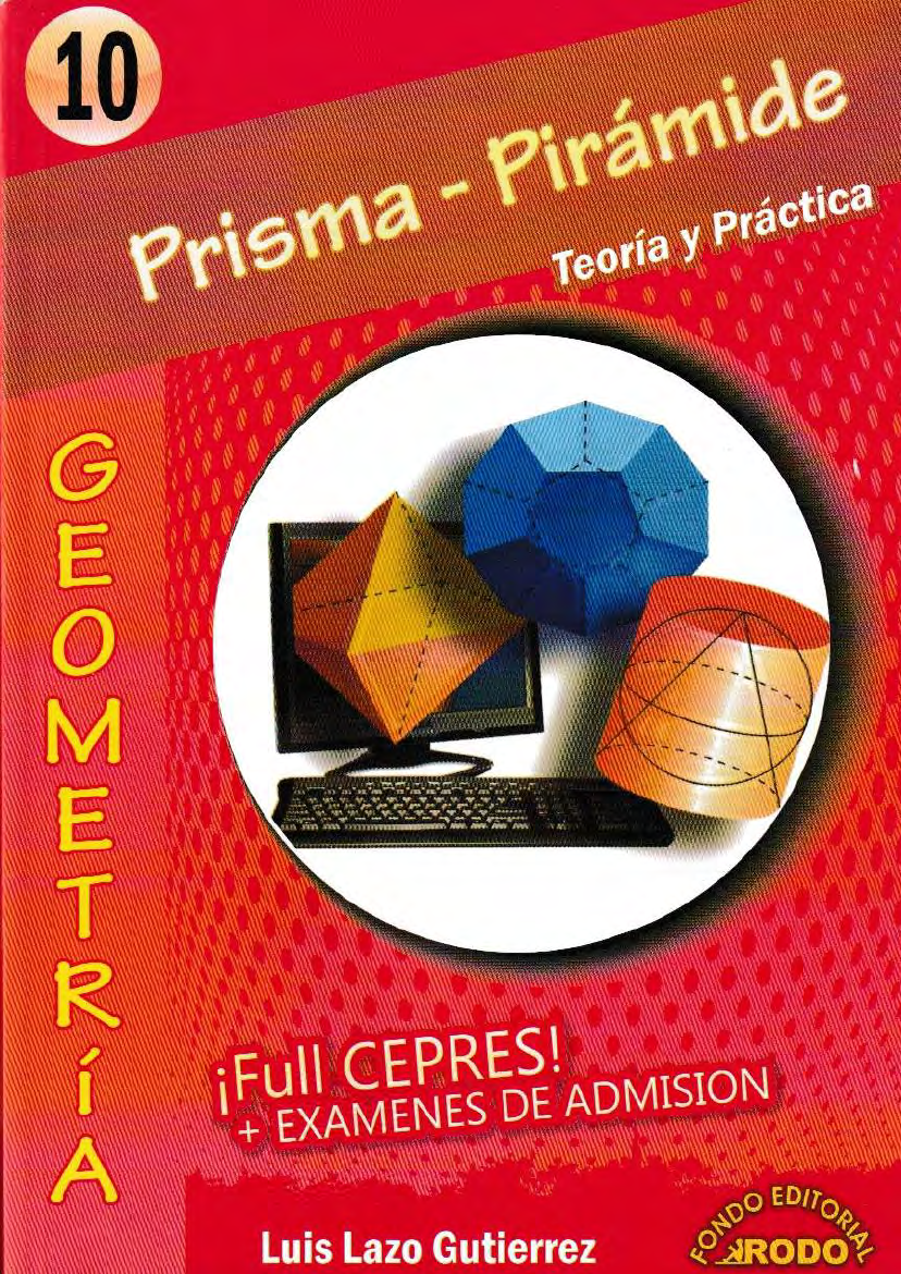 <p>10 Prisma Teoria M iFull CEPRES! + EXAMENES DE ADMISION Luis Lazo Gutierrez</p><p>10 Prisma y Practica E i Full CEPRES! + EXAMENES DE ADMISION Luis Lazo Gutierrez</p><p>MEZA BRAVO ELVIS</p><p>PRESENTACIÓN El Fondo Editorial RODO es un grupo educativo con formado por profesionales de experiencia que por muchos años vienen participando en el análisis y producción de textos acordes con las necesidades del sistema educativo. Conocedores de la realidad de nuestro educando que día a día nos muestra la interacción con ellos en las aulas de clase y poniendo de manifiesto nuestro compromiso como educadores hemos asumido el reto de contribuir a elevar el nivel académico de manera integral. Continuando con la elaboración de nuestra colección con miras al ciclo académico 2015, en está oportunidad presentamos el texto teórico práctico denominado TEMAS SELECTOS DE desarrollado con la gran experiencia de nuestro grupo humano. Caracterizándolo así por el rigor y la exigencia académica ya que abarca los temas y preguntas solicitadas según la currícula de los centros preuniversitarios de las universidades más importantes del país relacionados con el curso. Esta obra es la continuación de nuestra serie de publicaciones, caracterizada por la calidad e innovación constatada en los miles de ingresantes que han tenido como apoyo nuestras colecciones, esperando los comentarios y sugerencias las cuales sabremos aceptar La presente serie de boletines consta de una sección teórica, donde se muestra toda la teoría referente al capítulo o capítulos mostrados en el boletín, luego se determina una sección de 100 problemas resueltos por los autores clasificados por nivel de exigencia de menor a mayor dificultad, explicados de manera clara y sencilla que servirá tanto para alumnos que recién empiezan su camino a la universidad, como alumnos de nivel avanzado, dándole nuevas alternativas de solución, luego se cuenta con 100 problemas propuestos con sus respectivas claves para que el alumno mida su nivel de comprensión respecto al capítulo con problemas de igual exigencia que la sección anterior, por último se muestra una sección de exámenes de admisión del curso en mención, con soluciones explicadas de la mejor manera. Fondo Editorial RODO De: Walter Benitez</p><p>MEZA BRAVO ELVIS PRISMA - PIRÁMIDE EDIT GEOMETRÍA - TEMA SELECTO - 10, 1ra Edición No está permitida la reproducción total o parcial de este libro, tampoco su tratamiento informático, ni la transmisión de ninguna forma o por cualquier medio, ya sea electrónico, mecánico, por fotocopia, por registro u otros métodos, sin el permiso previo y por escrito de los titulares del copyright. DERECHOS RESERVADOS Diciembre 2016 por FONDO EDITORIAL RODO de Walter Z. Benitez Nuñez Av. Venezuela 979 Of. 205 - Breña LIMA 05, 424-6350 992-796104 Hecho el Depósito Legal en la Biblioteca Nacional del Perú 2015 - 19124 EQUIPO PEDAGÓGICO Luis Lazo Gutiérrez DIAGRAMACIÓN, DIGITACIÓN Y GRÁFICOS Claudia Gisell Llosa La Serna José Miguel Gallo Ballena IMPRESO EN PRINTED IN Impreso en los Talleres Gráficos de CORPORACIÓN PIANCASH S.A.C. Jr. Chancay 446 Of. 112 - Lima 01</p><p>PRISMA PIRÁMIDE PRISMA El Prisma es un poliedro en donde dos de sus caras son regiones limitadas por polígonos congruentes situados en planos paralelos, y las demás caras son regiones A las regiones poligonales paralelas se les llama bases del prisma, y a las regiones caras laterales. Los lados de las bases son llamadas aristas básicas, mientras que las intersecciones de las caras laterales son las aristas laterales. Todas las aristas laterales de un prisma son paralelas y congruentes. La distancia entre los planos que contienen a las bases se llama altura del prisma. 1. Un prisma es recto si las aristas laterales son perpendiculares a las bases, en caso contrario será oblicuo. 2. En un prisma recto las caras laterales son regiones rectangulares. 3. Un prisma recto es regular si sus bases son regiones limitadas por polígonos regulares. 4. En todo prisma el número de lados de la base es igual al número de caras laterales. 5. Un prisma se denomina según el polígono que limita su base, así los prismas serán triangulares, cuadrangulares, pentagonales, etc., según que sus bases sean regiones triangulares, cuadrangulares, pentagonales, etc. Arista básica Base Cara lateral Arista lateral Altura Base Si: n : Es el número de lados de la base Entonces: C=n+2 C : Número de caras V : Número de vértices A : Número de aristas A=3n 5</p><p>MEZA BRAVO ELVIS BOLETÍN DE GEOMETRÍA - 10 Prisma Recto A B SLATERAL = (Perímetro de la base) a C a STOTAL = E Volumen = (Altura) F Prisma Oblicuo SLATERAL = (Perímetro de la sección recta) a STOTAL SLATERAL + a h Volumen = (Altura) Sección recta Volumen P/ Sumatoria de lados de la base NOTA Se llama sección recta de un prisma a la sección determinada en el prisma por un plano perpendicular a las aristas laterales. Paralelepípedo Un paralelepípedo es un prisma cuya base es una región Paralelepípedo Recto Paralelepipedo Oblicuo Paralelepípedo Rectangular, Ortoedro o Rectoedro Es un paralelepípedo recto cuyas bases son regiones rectangulares. En estos paralelepípedos, las seis caras son regiones rectangulares. 6</p><p>PRISMA - PIRÁMIDE d b Volumen = abc a d : Medida de la diagonal a, by C : Dimensiones de rectoedro TRONCO DE PRISMA Es una porción de prisma que está comprendida entre una de sus bases y plano que no es paralelo a las bases y secante a todas sus aristas laterales. Tronco de Prisma Triangular Recto a = SBASE . 3 b Base pl Tronco de Prisma Triangular Oblicuo Sección recta VTRONCO RECTA ( a+b+c 3 a VTRONCO SBASE . ha + hb + 3 hb Base 7</p><p>MEZA BRAVO ELVIS BOLETÍN DE GEOMETRÍA - 10 EDITORIA DEMOSTRACIÓN DEL VOLUMEN DEL TRONCO DE EN FUNCIÓN DE LA SECCIÓN RECTA Y EL SEGMENTO QUE UNE LOS BARICENTROS DE LAS BASES A' 2n G1 B' n M C' a b X b/c 2 B A 2m G M C Datos: Área de la secc