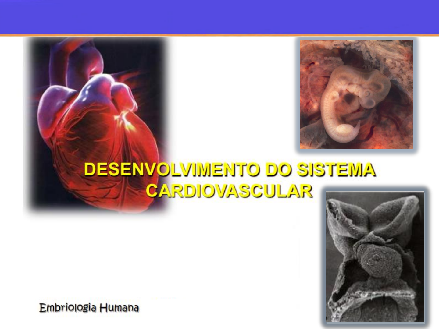 <p>Profa. Dra. Glaucia Vilar</p><p>Mobile User</p><p>DESENVOLVIMENTO DO SISTEMA CARDIOVASCULAR</p><p>O SISTEMA CARDIOVASCULAR é o primeiro dos órgãos embrionários</p><p>que adquire estado funcional.</p><p>No início da 3º semana, inicia-se a VASCULOGÊNESE e a ANGIOGÊNESE no</p><p>mesoderma extraembrionário do saco vitelino. Os vasos sanguíneos do embrião</p><p>começam a se desenvolver cerca de dois dias mais tarde.</p><p>A formação inicial do sistema cardiovascular ocorre devido à necessidade de vasos</p><p>sanguíneos para trazer oxigênio e nutrientes para o embrião e descarte de</p><p>metabólitos.</p><p>É necessário o estabelecimento de uma malha vascular que dê suporte a este</p><p>complexo sistema de transporte.</p><p>Mobile User</p><p>DESENVOLVIMENTO DO SISTEMA CARDIOVASCULAR</p><p>• Durante o processo de gastrulação os três</p><p>folhetos germinativos, endoderme, ectoderme</p><p>e mesoderme, são estabelecidos.</p><p>• Os primeiros sinais do desenvolvimento de</p><p>um PLEXO VASCULAR são observados na</p><p>formação da mesoderma lateral esplâncnico</p><p>do saco vitelínico. Surgimento de vasos do coração</p><p>Mobile User</p><p>DESENVOLVIMENTO DO SISTEMA CARDIOVASCULAR</p><p>Saco vitelino</p><p>com ilhotas</p><p>sanguíneas</p><p>• No início da 3º semana, os primeiros sinais do desenvolvimento de um</p><p>plexo vascular primitivo são observados na formação da mesoderma</p><p>lateral do saco vitelínico.</p><p>• Células hematopoiéticas e endoteliais são induzidas na mesoderma pela</p><p>sinalização dos fatores de crescimento de fibroblastos (FGFs).</p><p>Mobile User</p><p>VASCULOGÊNESE E ANGIOGÊNESE</p><p>• O fator de crescimento de fibroblastos 2 (FGF2) é o principal promotor</p><p>da VASCULOGÊNESE. Ao ligar-se aos seus receptores no mesoderma,</p><p>o FGF2 induz a diferenciação celular para hemangioblastos.</p><p>• Com a ação do fator de crescimento endotelial (VEGF) agindo em</p><p>receptores VEGF-R2, os hemangioblastos eventualmente se</p><p>diferenciam em células endoteliais.</p><p>P</p><p>L</p><p>conois voselores</p><p>se transfemenemongiablostos</p><p>&</p><p>Se transf em endotélio</p><p>↑</p><p>Mobile User</p><p>VASCULOGÊNESE E ANGIOGÊNESE</p><p>I. Induzidos por FGFs as células mesodérmicas se diferenciam</p><p>dando origem aos hemangioblastos.</p><p>II. Esses hemangioblastos formam agregados celulares constituídos</p><p>internamente por células precursoras hematopoiéticas e</p><p>revestidos externamente pelos angioblastos.</p><p>Mobile User</p><p>VASCULOGÊNESE E ANGIOGÊNESE</p><p>III. A agregação in situ destes angioblastos formam um plexo vascular</p><p>(primórdios dos vasos sanguíneos).</p><p>IV. Em seguida, este plexo vascular capilar é expandido e passa por um</p><p>processo de remodelamento e expansão no qual o tecido endotelial</p><p>existente se ramifica originando novos vasos num processo</p><p>denominado ANGIOGÊNESE.</p><p>Mobile User</p><p>DESENVOLVIMENTO CARDÍACO</p><p>Uma vez estabelecida a malha vascular, tem início a</p><p>formação do coração; este por sua vez irá se conectar ao</p><p>vasos formados.</p><p>A cardiogênese é um intrincado processo e susceptível a</p><p>problemas que resultam em defeitos congênitos.</p><p>Mobile User</p><p>O primórdio do coração é observado no 18º dia de desenvolvimento no</p><p>mesoderma cardiogênico, região anterior da membrana orofaríngea,</p><p>com a formação de dois cordões angioblásticos laterais.</p><p>O coração e os grandes vasos formam-se de</p><p>células mesenquimais da área cardiogênica.</p><p>DESENVOLVIMENTO DO SISTEMA CARDIOVASCULAR</p><p>Mobile User</p><p>DESENVOLVIMENTO DO SISTEMA CARDIOVASCULAR</p><p>ÁREA CARDIOGÊNICA</p><p>Mobile User</p><p>DESENVOLVIMENTO DE CÉLULAS SANGUÍNEAS</p><p>Os cordões angioblásticos se canalizam formando tubos</p><p>endocárdicos do coração</p><p>Mobile User</p><p>DESENVOLVIMENTO DE CÉLULAS SANGUÍNEAS</p><p>▪ Dobramento lateral do embrião: tubos endocárdicos do</p><p>coração → que se fundem para formar o coração tubular ( final</p><p>da terceira semana)</p><p>Mobile User</p><p>DESENVOLVIMENTO DE CÉLULAS SANGUÍNEAS</p><p>Os tubos endocárdicos do coração → fundem-se para formar o</p><p>coração tubular.</p><p>Mobile User</p><p>DESENVOLVIMENTO DE CÉLULAS SANGUÍNEAS</p><p>Os tubos endocárdicos do coração → fundem-se para formar o</p><p>coração tubular.</p><p>Mobile User</p><p>DESENVOLVIMENTO DO SISTEMA CARDIOVASCULAR</p><p>Dobramento cefálico</p><p>Coração assume</p><p>posição ventral</p><p>Mobile User</p><p>DESENVOLVIMENTO DO SISTEMA CARDIOVASCULAR</p><p>• Parede cardíaca</p><p>Endocárdio</p><p>Miocárdio</p><p>Epicárdio</p><p>Epicárdio</p><p>(pericárdio</p><p>parietal)</p><p>Mobile User</p><p>DESENVOLVIMENTO DO SISTEMA CARDIOVASCULAR</p><p>DOBRAMENTOS</p><p>• Com a dobra craniocaudal do embrião = tubo cardíaco (2) mais caudoventral</p><p>= desenvolvimento das aortas dorsais (3) aproxima o tubo cardiogênico</p><p>• Porção caudal das veias vitelinas (4) aproxima-se do tudo cardiogênico e se</p><p>fundem (5)</p><p>• Porção caudal da aorta dorsal se fundem (6) e acontece a fusão dos dois lados</p><p>do tubo cardíaco</p><p>2</p><p>3</p><p>2</p><p>3</p><p>2</p><p>3</p><p>3</p><p>4</p><p>5</p><p>3 6</p><p>7</p><p>Mobile User</p><p>SISTEMA CARDIOVASCULAR PRIMITIVO</p><p>• Forma-se as aortas dorsais (1) e ventrais (2)</p><p>• Alongamento = desenvolve dilatações e constrições alternadas</p><p>• 5 partes: tronco arterioso (extremidade cranial), bulbo cardíaco (3),</p><p>ventrículo (4), átrio primitivo (5) e seio venoso (extremidade caudal)</p><p>2</p><p>3 4 5</p><p>1</p><p>Mobile User</p><p>SISTEMA CARDIOVASCULAR PRIMITIVO</p><p>CÂMARAS CARDÍACAS</p><p>▪ TUBO ENDOCÁRDICO ÚNICO:</p><p>aparecimento das câmaras cardíacas</p><p>primitivas</p><p>- Tronco arterioso: conduz fluxo de</p><p>saída (início da aorta e 