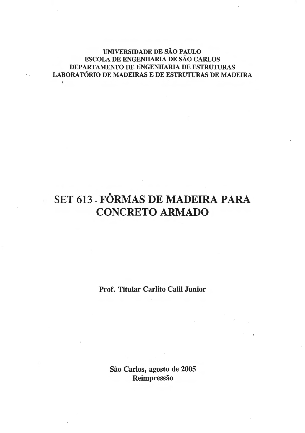 <p>UNIVERSIDADE DE SÃO PAULO</p><p>ESCOLA DE ENGENHARIA DE SÃO CARLOS</p><p>DEPARTAMENTO DE ENGENHARIA DE ESTRUTURAS</p><p>LABORATÓRIO DE MADEIRAS E DE ESTRUTURAS DE MADEIRA</p><p>SET 613 -FÔRMAS DE MADEIRA PARA</p><p>CONCRETO ARMADO</p><p>Prof. Titular Carlito Calil Junior</p><p>São Carlos, agosto de 2005</p><p>Reimpressão</p><p>s</p><p>1 INTRODUÇÃO 1</p><p>1.1 PLANEJAMENTO E PROJETO DE FÔRMAS 1</p><p>1.2 UTILIZAÇÃO DAS FÔRMAS 3</p><p>1.3 CLASSiFICAÇÃO POR TIPO DE MATERIAL EMPREGADO 4</p><p>1.4 SISTEMA DE FÔRMAS DE MADEIRA 4</p><p>1.5 PATOLOGIA E RECOMENDAÇÕES DE PROJETO 4</p><p>2 MATERIAIS</p><p>2.1 MADEIRAS SERRADAS COMERCIAIS</p><p>2.2 CHAPAS DE MADEIRA COMPENSADA</p><p>2. 2.1 Generalidades</p><p>2.2.2 Parâmetros Elásticos e de Resistência da</p><p>Madeira Compensada</p><p>2.3 ACESSÓRIOS</p><p>2.3.1 Pregos</p><p>2.3.2 Tensores</p><p>2. 3. 3 Assessórios comerciais</p><p>3 SISTEMAS DE FÔRMAS E CIMBRAMENTOS</p><p>3.1 SISTEMA TRADICIONAL (ABCP)</p><p>3.2 SISTEMA TOSHIO UENO</p><p>3.3 SISTEMA FORMAPRÉ</p><p>3.4 SISTEMA FORMAPRONTA (MADEIRIT)</p><p>3.5 SISTEMA PRÁTIKA</p><p>3.6 SISTEMA GETHAL</p><p>3.7 FÔRMAS ESPECiAiS</p><p>3.8 CUIDADOS NA DESFORMA</p><p>5</p><p>5</p><p>8</p><p>8</p><p>12</p><p>14</p><p>14</p><p>16</p><p>16</p><p>19</p><p>19</p><p>23</p><p>25</p><p>26</p><p>29</p><p>31</p><p>36</p><p>37</p><p>4 AÇÕES EM FÔRMAS E ESCORAMENTOS DE MADEIRA</p><p>4.1 COMPORTAMENTO ESTRUTURAL</p><p>4.1.1 Fôrmas para Lajes</p><p>4.1.2 Fôrmas para Vigas</p><p>4.1.3 Formas para Pilares</p><p>4.2 PROPRIEDADES DO CONCRETO</p><p>4.2.1 Comportamento do Concreto</p><p>4.2.2 Peso do Concreto</p><p>4.2.3 Pega e endurecimento</p><p>4.2.4 Retração</p><p>4.3 AÇÕES NAS FORMAS E CIMBRAMENTOS</p><p>4.3.1 Peso Próprio das Fôrmas</p><p>4.3.2 Peso do Concreto Fresco</p><p>4.3.3 Sobrecargas</p><p>4.4 COMBiNAÇÃO DAS AÇÕES</p><p>4. 4.1 Estados Limites Últimos</p><p>4.4.2 Estados Limites de Utilização</p><p>4.4.3 Coeficientes para as combinações das ações</p><p>4.5 ESTUDO DA PRESSÃO LATERAL DO CONCRETO</p><p>4.5.1 Vigas</p><p>4.5.2 Pilares</p><p>5 PROJETO DE FÔRMAS E CIMBRAMENTOS DE MADEIRA</p><p>5.1 DADOS</p><p>5.1.1 Projeto Estrutural</p><p>5.1.2 Projeto de Fôrmas</p><p>5.2 FÔRMA E CIMBRAMENTO DAS LAJES</p><p>5.2.1 Painéis de laje</p><p>5.2.2 Combinações das ações</p><p>5.2.3 Dimensionamento do espaçamento entre transversinas</p><p>5.2.4 Dimensionamento do espaçamento entre pontaletes</p><p>5. 2. 5 Verificação dos pontaletes</p><p>5.3 FÔRMAS E CIMBRAMENTOS DAS VIGAS</p><p>5. 3. 1 Esquema geral</p><p>5. 3. 2 Esforços</p><p>5. 3. 3 Dimensionamento do espaçamento entre garfos no</p><p>fundo da viga</p><p>5. 3. 4 Dimensionamento do espaçamento dos garfos na</p><p>lateral da viga</p><p>...</p><p>39</p><p>39</p><p>39</p><p>39</p><p>40</p><p>40</p><p>40</p><p>40</p><p>40</p><p>40</p><p>41</p><p>41</p><p>41</p><p>41</p><p>42</p><p>42</p><p>42</p><p>42</p><p>43</p><p>45</p><p>45</p><p>47</p><p>47</p><p>47</p><p>47</p><p>49</p><p>49</p><p>50</p><p>50</p><p>53</p><p>55</p><p>57</p><p>57</p><p>58</p><p>59</p><p>60</p><p>5.4 FÔRMAS DOS PILARES 62</p><p>5. 4.1 Esquema geral 62</p><p>5.4.2 Ações a considerar 62</p><p>5. 4. 3 Dimensionamento do espaçamento entre sarrafos 64</p><p>5.4.4 Dimensionamento do espaçamento entre tensores 65</p><p>5.4.5 Posicionamento dos sarrafos e tensores no pilar 66</p><p>5.5 DETALHAMENTO DAS PEÇAS E DOS CORTES 67</p><p>5.5.1 Laje 67</p><p>5.5.2 Pilares 67</p><p>5.5.3 Vigas 68</p><p>5.5.4 Otimização dos cortes das chapas 68</p><p>5.5.5 Otimização das madeiras de pinus 70</p><p>6 EXEMPLO DE DETALHAMENTO DE UM</p><p>PROJETO DE FÔRMAS 71</p><p>PREFÁCIO</p><p>Esta publicação foi especialmente desenvolvida para a disciplina de graduação</p><p>"Formas e cimbramentos de madeira", disciplina optativa oferecida pelo Laboratório de</p><p>Madeiras e de Estruturas de Madeira (LaMEM) do Departamento de Engenharia de</p><p>Estruturas (SET) da Escola de Engenharia de São Carlos (EESC) da Universidade de São</p><p>Paulo (USP)</p><p>Colaboraram nesta publicação os alunos do Programa de Aperfeiçoamento de</p><p>Ensino (P AE):</p><p>Giani Pfister (Iniciação Científica/1995)</p><p>F emando Okimoto (Programa P AE/96)</p><p>Guilherme Corrêa Stamato (Programa P AE/97 e 98)</p><p>São Carlos, agosto de 2005,</p><p>Prof. Dr. Carlito Calil Junior</p><p>LaMEM-EESC-USP</p><p>1 I</p><p>Denomina-se fôrmas a um conjunto de elementos cuja função é moldar as estruturas de concreto,</p><p>garantindo a obtenção das dimensões desejadas. Em essência, fôrmas são estruturas temporárias</p><p>destinadas a sustentar o concreto fresco até que o mesmo atinja resistência suficiente para ser auto</p><p>portante. As fôrmas devem suportar também a sobrecarga da concretagem, seu peso próprio, carga</p><p>oriunda de outros materiais, etc.</p><p>As fôrmas de concreto devem apresentar resistência suficiente para suportar esforços provenientes de</p><p>seu peso próprio, do peso e empuxo lateral do concreto, do adensamento, do trânsito de pessoas e</p><p>equipamentos, com rigidez suficiente para manter as dimensões e forma previstas no projeto de</p><p>estrutura para os elementos de concreto. Deve-se garantir sua estabilidade utilizando-se suportes e</p><p>contraventamentos.</p><p>As fôrmas devem ser estanques para evitar perda de água e fmos durante a concretagem, exceto no</p><p>caso de fôrmas absorventes, onde é feito o controle da drenagem do excesso de água utilizada para</p><p>aumentar a trabalhabilidade do concreto. Ainda, deve possibilitar o correto posicionamento da</p><p>armadura, um correto lançamento e adensamento do concreto, bem como garantir a segurança tanto</p><p>para os trabalhadores como para a estrutura de concreto.</p><p>Quanto ao acabamento, as fôrmas devem ter texturas conforme as eXJgencias de cada projeto,</p><p>especialmente nas estruturas de concreto aparente. Devendo-se observar sempre que a aderência da</