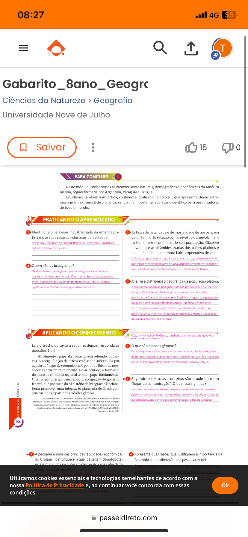 <p>08:27 4G 35 T Ciências da Natureza > Geografia Universidade Nove de Julho Salvar 15 0 PARA CONCLUIR Neste módulo, conhecemos as características naturais, e econômicas da América platina, região formada por Argentina, Paraguai e Uruguai. Estudamos também a Antártida, continente localizado no polo sul, que apresenta climas extre- mos e grande diversidade biológica, sendo um importante laboratório para pesquisadores de todo o mundo PRATICANDO APRENDIZADO Identifique o país mais industrializado da pla- As taxas de natalidade e de mortalidade de um país, em tina e cite seus setores industriais de destaque. geral, têm forte relação com nível de desenvolvimen- Argentina Destacam-se as indústrias textil to humano e econômico de sua população. Observe automobilistica de celulose novamente as pirâmides etárias dos países platinos e indique aquela que denota baixa expectativa de Paraguai apresenta uma etária com topo mais que indica menor expectativa de vida aspecto em geral relacionado a Quem são os brasiguaios? niveis de desenvolvimento e mais baixos brasileiros que migraram para e desenvolveram grandes monoculturas no país termo também é usado para se referir pessoas que vivem na fronteira entre Brasil e Paraguai Analise a distribuição da população ligadas movimentos sociais que lutam por terras A maioria da população paraguaia está nas proximidades da fronteira Paraguai-Brasil A população argentina também se concentra nas áreas de fronteira do país com Brasil Já a população uruguaia está próxima à fronteira com a Argentina Em todos os a maior concentração está nos arredores das capitais A proximidade com as fronteiras está relacionada à grande quantidade de cidades gêmeas nessa região APLICANDO CONHECIMENTO Veja no Manual do Professor gabarito comentado das questões sinalizadas com asterisco Leia o trecho do texto a seguir e, depois, responda às 1 que são cidades gêmeas? questões 1 2. Cidades que se situam em zonas de localizadas em naises Atualmente o papel da fronteira vem sofrendo mudan- mas que apresentam área urbana integrada São marcadas ças A antiga função de defesa está sendo substituída por por intensos fluxos de mercadorias e capital entre si aquela do "lugar de comunicação", por onde fluxos de mer- cadorias cruzam diariamente Nesse sentido, a formação do bloco de regional tem um papel o tema em questão vem sendo preocupação do governo Segundo texto, as fronteiras são atualmente um que por meio do Ministério da Integração Nacional "lugar de comunicação". o que isso significa? tenta promover uma integração planejada do Brasil com Como fluxos de serviços, etc entre os seus vizinhos a partir das cidades paises tornam-se cada vez existe tendência de que as fronteiras CARNFIRO FILHO cidades nas Brasile passem a ser vistas como locais de e não de separação Argentina Itaqui Gruno Disponível em argentina 2016 208 A pecuária é uma das principais atividades econômicas Apresente duas razões que justifiquem a importância da do Uruguai. Identifique em qual paisagem Antártida como laboratório de pesquisa nica é mais comum desenvolvimento dessa atividade e justifique sua resposta Utilizamos cookies essenciais e tecnologias semelhantes de acordo com a nossa Política de Privacidade e, ao continuar você concorda com essas Ok condições. passeidireto.com</p>