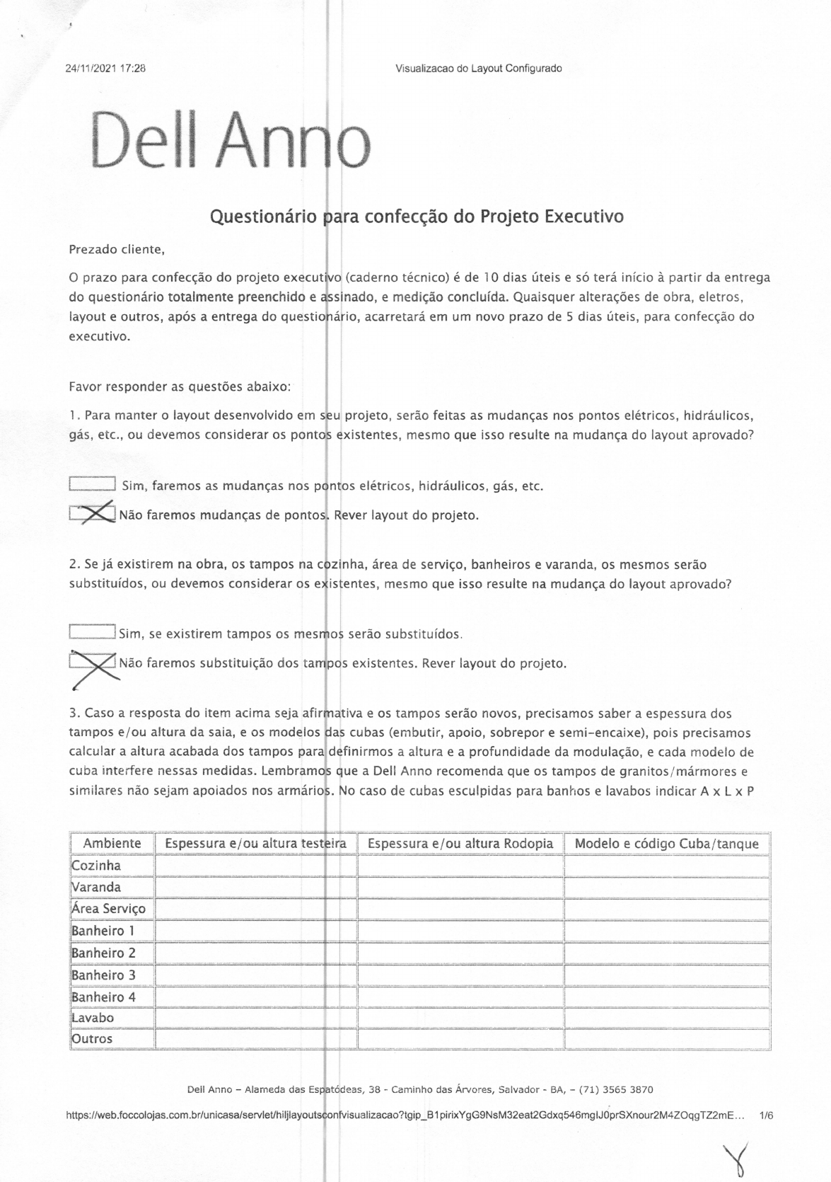 <p>24/11/2021 17:28 Visualizacao do Layout Configurado Dell Anno Questionário para confecção do Projeto Executivo Prezado cliente, prazo para confecção do projeto executivo (caderno técnico) é de 10 dias úteis e só terá início à partir da entrega do questionário totalmente preenchido e assinado, e medição concluída. Quaisquer alterações de obra, eletros, layout e outros, após a entrega do questionário, acarretará em um novo prazo de 5 dias úteis, para confecção do executivo. Favor responder as questões abaixo: 1. Para manter o layout desenvolvido em seu projeto, serão feitas as mudanças nos pontos elétricos, hidráulicos, gás, etc., ou devemos considerar os pontos existentes, mesmo que isso resulte na mudança do layout aprovado? Sim, faremos as mudanças nos pontos elétricos, hidráulicos, gás, etc. Não faremos mudanças de pontos. Rever layout do projeto. 2. Se já existirem na obra, os tampos na cozinha, área de serviço, banheiros e varanda, os mesmos serão substituídos, ou devemos considerar os existentes, mesmo que isso resulte na mudança do layout aprovado? Sim, se existirem tampos os mesmos serão substituídos. Não faremos substituição dos tampos existentes. Rever layout do projeto. 3. Caso a resposta do item acima seja afirmativa e os tampos serão novos, precisamos saber a espessura dos tampos e/ou altura da saia, e os modelos das cubas (embutir, apoio, sobrepor e semi-encaixe), pois precisamos calcular a altura acabada dos tampos para definirmos a altura e a profundidade da modulação, e cada modelo de cuba interfere nessas medidas. Lembramos que a Dell Anno recomenda que os tampos de granitos/mármores e similares não sejam apoiados nos armários. No caso de cubas esculpidas para banhos e lavabos indicar A L P Ambiente Espessura e/ou altura testeira Espessura e/ou altura Rodopia Modelo e código Cuba/tanque Cozinha Varanda Área Serviço Banheiro 1 Banheiro 2 Banheiro 3 Banheiro 4 Lavabo Outros Dell Anno Alameda das Espatódeas, 38 - Caminho das Árvores, Salvador - BA, (71) 3565 3870</p><p>24/11/2021 17:28 Visualizacao do Layout Configurado 4. Serão construídas bases de alvenaria para os armários: Sim, em quais ambientes Não 5. Haverá forros rebaixados em gesso, ou devemos considerar as medidas de pé direito na laje? Sim, faremos rebaixos com forros de gesso. Não faremos rebaixos de gesso. Considerar as medidas de pé direito na laje Os forros já estão rebaixados, considerar as medidas atuais da obra. 6. Caso a resposta do item acima seja afirmativa, favor indicar o pé direito com o rebaixo de gesso para cada ambiente, em milímetros, considerando o ambiente acabado com o piso. Cozinha P.D = Suíte Master P.D = Área de serviço P.D = Closet P.D = Varanda P.D = Dormitório 1 P.D = Despensa P.D = Dormitório 2 P.D = Banho 1 P.D = Dormitótio 3 P.D = Banho 2 P.D = Home Office P.D = Banho 3 P.D = Sala / Living P.D = Lavabo P.D = Rouparia P.D = Gabinete / Escritório P.D = Outros P.D = Outros P.D = Outros P.D = Outros P.D = Outros P.D = 7. Haverá aplicação de revestimento nas paredes, ou devemos considerar as medidas atuais? Sim, será aplicado revestimento nas paredes. Não faremos. Considerar as medidas atuais. 8. Indicar alturas de rodapés e larguras das guarnições que serão utilizadas: 9. Lavanderia: Indicar qual tipo de varal será utilizado e posicionar o mesmo no projeto executivo. Atenção: se atentar para abertura de portas de giro. Modelo varal Dell Anno - Alameda das Espatódeas, 38 Caminho das Árvores, Salvador BA, - (71) 3565 3870</p><p>24/11/2021 17:28 Visualizacao do Layout Configurado 10. Haverá iluminação nos armários: Sim, qual o tipo e modelo Não 11. Haverá iluminação de fita em LED nas prateleiras e nichos: Sim, qual o tipo e modelo Não 12. Portas divisórias de passagem, portas de correr em vidro serão sempre produzidas após piso e rebaixo estarem concluídos, sendo executada uma nova medição para este item. 13. Portas pivotantes serão produzidas após vão arrestado e da confirmação da dimensão in locco pelo nosso supervisor. Porta com fechadura? Sim, dos dois lados Não Dell Anno - Alameda das Espatódeas, 38 - Caminho das Árvores, Salvador - BA, - (71) 3565 3870</p><p>24/11/2021 17:28 Visualizacao do Layout Configurado Relação dos Equipamentos dos Ambientes Para a confecção do projeto executivo, necessitamos que seja listado abaixo TODOS os eletros e equipamentos que serão utilizados. Essa lista deve estar devidamente preenchida, caso o contrário o pedido ficara parado aguardando o envio das informações. Utilizar os campos em branco para os equipamentos que não constam na lista: PRODUTO AMBIENTE MARCA MODELO DIMENSÕES EXISTENTE Fogão piso BESSN LARG. ALT. PROF. SIM NÃO Fogão embutir Forno embutir Cooktop Coifa Depurador SUGGDR D131THP, Refrigerador Freezer Micro-ondas Micro-ondas embutir Lava louças Filtro Lixeira Triturador Misturador/torneira Adega Frigobar Cervejeira Lava roupa Secadora Home Theater Receiver DVD TV Cama Tanque Dell Anno - Alameda das Espatódeas, 38 - Caminho das Árvores, Salvador - BA, - (71) 3565 3870 4/6</p><p>24/11/2021 17:28 Visualizacao do Layout Configurado Informações importantes 1. o prazo de entrega dos produtos Dell Anno é de 55 (cinquenta e cinco) dias úteis contados a partir da assinatura da pasta executiva e após confirmação de adimplência com os pagamentos. A conferência final é realizada após assinatura do presente contrato e suas partes integrantes e após autorização do cliente. Para que seja realizada esta conferência é necessário que os espaços e componentes onde serão instalados o mobiliário estejam devidamente concluídos, tais como: piso, paredes, forros e rebaixos, janelas, pedras de mármore/granito/similares, pias, lavatórios e demais instalações. 2. Caso alguma peça do mobiliário não possa ser transportada por elevador, escadaria ou qualquer outro meio de acesso ao local de instalação, conf
