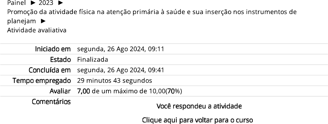 <p>Painel 2023 Promoção da atividade física na atenção primária à saúde e sua inserção nos instrumentos de planejam Atividade avaliativa Iniciado em segunda, 26 Ago 2024, 09:11 Estado Finalizada Concluída em segunda, 26 Ago 2024, 09:41 Tempo empregado 29 minutos 43 segundos Avaliar 7,00 de um máximo de 10,00(70%) Comentários Você respondeu a atividade Clique aqui para voltar para o curso</p><p>Questão 1 Operacionalizar ações, programas e políticas sem se atentar às suas Correto particularidades e, ainda, sem monitorar, pode resultar em desfechos não Atingiu 1,00 de desejados e/ou fragilizados, deixados usualmente ao acaso. Qual é a indicação 1,00 feita na Unidade 4 para contemplar os resultados desejados? Assinale a opção responde corretamente à questão: Escolha uma opção: Incluir iniciativas de atividade física nos instrumentos da gestão pública e do SUS, zelando por processos inovadores e inéditos, sem recorrer a norteadores preestabelecidos. Planejar perguntas que sejam limitadas a respostas como "sim" ou "não" para garantir a agilidade do processo acima da complexidade do tema, especificando um formulário padrão. Cessar a construção do Planejamento Estratégico Situacional (PES) ao passar por todos os momentos do processo e padronizar as ações. Elaborar uma pergunta norteadora de avaliação e estabelecer indicadores de acompanhamento de ações, programas e políticas de promoção da atividade física fatores relevantes tanto para o monitoramento quanto para a avaliação. Exatamente, excelente resposta! Nesse sentido, o ato de monitorar integra o processo de avaliação. De posse de dados e informações obtidas ao longo do processo de formulação, implementação e operacionalização de ações, programas e políticas, ficará facilitado o processo avaliativo quando for necessário realizá-lo. Sendo assim, ambos permitem dar melhores respostas às necessidades e demandas dos envolvidos com vistas tanto a valorizar o trabalho que foi feito quanto a cocriar uma cultura avaliativa de busca constante por melhorias de ações, programas e políticas. Sua resposta está correta. Vale lembrar que, quando as ações, os programas e as políticas já vêm com estratégias de monitoramento e avaliação definidos e indicadores formulados pelo Ministério da Saúde ou pelas secretarias estaduais, é sempre possível revê- los e ampliá-los. Nesse contexto, a pergunta de avaliação é relevante para identificar com clareza o que se pretende avaliar e para pactuar coletivamente os indicadores qualitativos e/ou quantitativos de processo e resultado.</p><p>Questão 2 O indicador é uma mensuração que reflete uma determinada situação Incorreto importante no que tange à promoção da atividade física. Sobre o tema, analise Atingiu 0,00 de as afirmações a seguir: 1,00 1. Algumas perguntas podem ser feitas para ajudar na construção dos indicadores como, por exemplo, "como podemos saber se alcançamos um resultado ou se as mudanças estão seguindo o planejamento proposto?", "como reconhecer quando um resultado ou mudança foi alcançado?" e "como isto poderia ser observado e medido quanti e qualitativamente?". 2. Os indicadores de caráter geral fornecem parâmetros para um potencial monitoramento e avaliação sobre o alcance e a abrangência de ações, programas e políticas. 3. Os indicadores podem ser quantitativos, cujos valores numéricos são prioritariamente considerados para efeito de avaliação, podendo ser expressos em números absolutos, percentual, taxas, índices, coeficientes, razões ou chances; e qualitativos, voltados mais a aspectos de ações políticas ou administrativas a partir dos sentidos e significados dos envolvidos sobre as ações realizadas. Agora, assinale a opção que indica quais afirmações são verdadeiras: Escolha uma opção: 2 e 3 estão corretas. 1 e 3 estão corretas. Pense bem. De fato, a primeira e a terceira afirmações estão corretas, mas para compreender corretamente a importância e a utilização dos indicadores é necessário reconhecer também outras informações vistas no enunciado desta questão. Volte ao conteúdo e relembre o tema. Todas as afirmações estão corretas. 1 e 2 estão corretas. Sua resposta está incorreta. A existência de boas estatísticas públicas que fazem parte do cálculo de indicadores depende dos dados criados pelos profissionais de saúde que atuam nos territórios, que observam os eventos (participação, realização das atividades, diálogos etc.) como fontes para gerar formas de medição número de participantes, de profissionais, de atividades realizadas por modalidade (dança, jogos etc.), de rodas de conversa ou reuniões, de participantes dessas atividades etc. Nesses exemplos é possível pensar em estatísticas públicas que estão na base da criação de indicadores de processo, ou seja, que medem os esforços envolvidos nas ações.</p><p>Questão 3 A gestão ocupa lugar fundamental na formulação de ações de promoção da Incorreto atividade física, o que exige diálogos entre diferentes setores e atores sociais e Atingiu 0,00 de atenção às especificidades do território presentes em cada contexto de trabalho. 1,00 Sobre o tema, analise as afirmações a seguir: 1. processo de planejamento em saúde é de responsabilidade de cada ente federado, a ser desenvolvido de forma contínua, articulada, progressiva, integrada e solidária entre as três esferas de governo (municipal, estadual/distrital e federal), na medida em que visa dar direcionalidade à gestão pública da saúde. 2. O Planejamento Estratégico Situacional (PES) em saúde possibilita a explicação de um problema a partir da visão dos atores envolvidos, da identificação das possíveis causas e a busca por diferentes modos de abordar e propor soluções, sendo estruturado em dois momentos: o normativo e o estratégico. 3. Planejar significa imaginar percurso, reduzir incerte