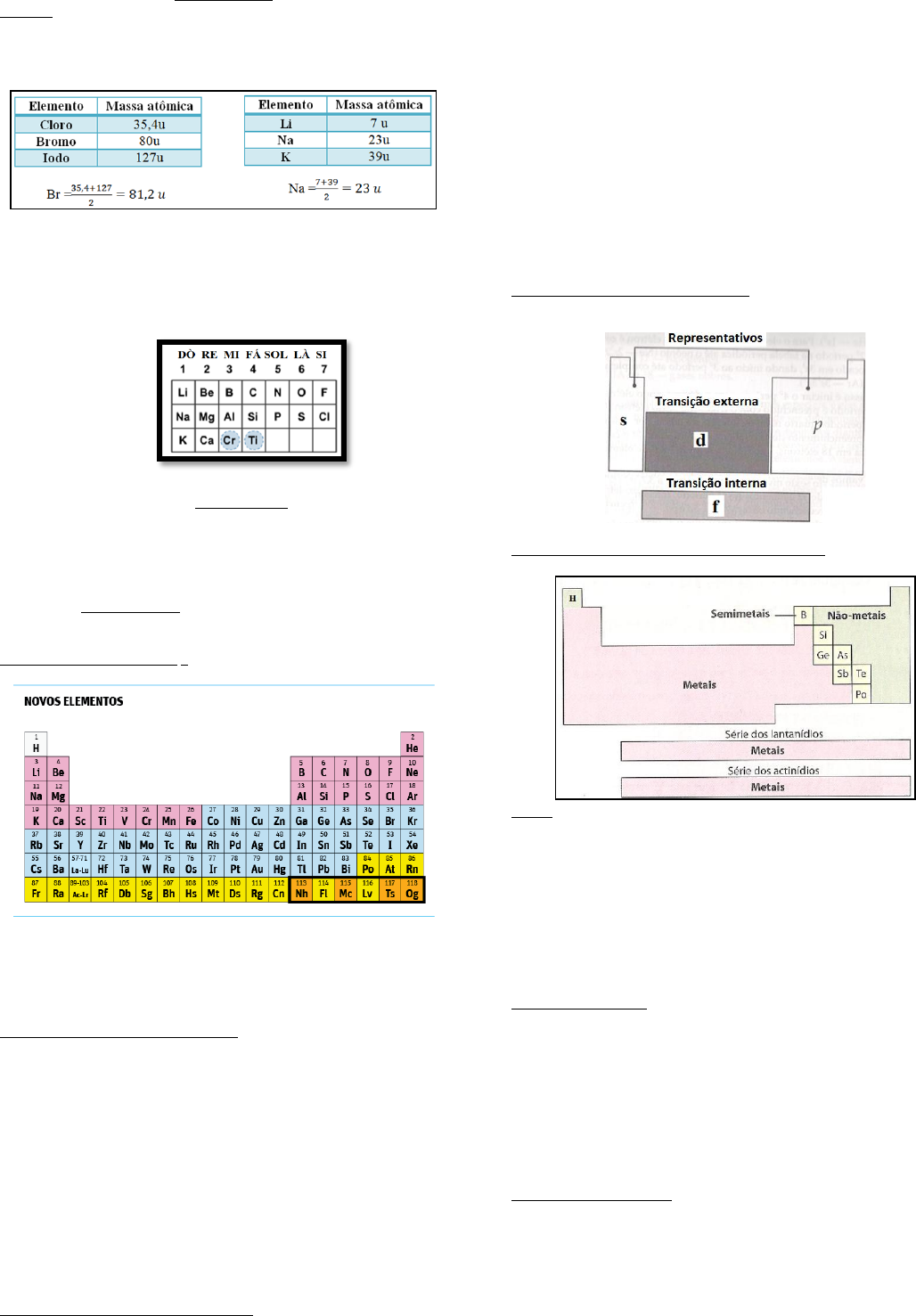 <p>Tabela periódica</p><p>Histórico</p><p>➢ 1817 – Döbereiner criou as Tríades. Grupos de três elementos nos</p><p>quais o elemento do meio apresentava a massa atômica</p><p>praticamente igual à média aritmética das massas atômicas do</p><p>elemento de cima com o debaixo.</p><p>➢ 1862 – Alexandre Chancourtois (parafuso telúrico) ordenou os</p><p>elementos químicos em ordem crescente de suas massas atômicas</p><p>em torno de um cilindro.</p><p>➢ 1864 - John Newlands criou a Lei das oitavas. Newlands ordenou os</p><p>elementos em ordem crescente de massas atômicas e verificou</p><p>que suas propriedades se repetiam a cada oito elementos, como as</p><p>notas numa escala musical.</p><p>➢ 1869- Dimitri Mendelleev ordenou os elementos conhecidos em</p><p>ordem crescente de massa atômica. A tabela de Mendelleev</p><p>possuía 8 colunas verticais e 12 de colunas horizontais. Dimitri é</p><p>considerado o “Pai da tabela periódica”.Outro grande feito de</p><p>Mendelleev foi deixar espaços vazios na tabela,prevendo a</p><p>descoberta de alguns elementos como ,por exemplo, o Germânio.</p><p>➢ 1913- Henry Moseley ordenou os elementos em ordem crescente</p><p>de número atômico. Esse novo conceito de ordenação deu origem</p><p>à tabela periódica atual ou moderna.</p><p>Organização da tabela atual: a tabela atual possui 18 colunas verticais</p><p>(famílias ou grupos) e 7 colunas horizontais (períodos).</p><p>Obs:</p><p>➢ Os elementos de um mesmo grupo(família ) possuem o mesmo</p><p>número de elétrons na camada de valência(CV).</p><p>➢ Os elementos de um mesmo período possuem o mesmo número</p><p>de níveis de energia(camadas).</p><p>Elementos representativos (Bloco s e p): possuem o subnível mais</p><p>energético (SME) s ou p.</p><p>1 ou 1A= metais alcalinos → CV = 1 elétron</p><p>2 ou 2A = metais alcalinos terrosos → CV = 2 elétrons</p><p>13 ou 3A =família do boro → CV= 3 elétrons</p><p>14 ou 4A = família do carbono → CV= 4 elétrons</p><p>15 ou 5A = família do nitrogênio → CV= 5 elétrons</p><p>16 ou 6A = calcogênios → CV= 6 elétrons</p><p>17 ou 7A = halogênios → CV= 7 elétrons</p><p>18 ou 8A = gases nobres → CV= 8 elétrons</p><p>Obs:</p><p>➢ O He possui 2 elétrons na CV.</p><p>➢ Grupo(família) = no de e- na CV</p><p>Elementos de transição externa (Bloco d ): possuem o subnível mais</p><p>energético(SME) d.Geralmente possuem 2 elétrons na CV.</p><p>3 ou 3B</p><p>4 ou 4B</p><p>5 ou 5B</p><p>6 ou 6B</p><p>7ou 7 B</p><p>8 ou 8B</p><p>9 ou 8B</p><p>10 ou 8B</p><p>11 ou 1B</p><p>12 ou 2B</p><p>Obs:</p><p>➢ Cu , Cr possuem 1 elétron na CV e 5 elétrons no subnível mais</p><p>energético(SME).</p><p>➢ Cu,Ag e Au possuem 1 elétron na CV e 10 elétrons no subnível</p><p>mais energético(SME).</p><p>➢ Grupo(família) = no de e- da CV + no de e- do SME</p><p>Elementos de transição interna(bloco f):possuem o subnível mais energético</p><p>4f (lantanídios;6o período) ou 5f (actinídios; 7o período). Esses elementos</p><p>pertencem ao grupo 3 ou 3B da tabela.</p><p>Divisão com base nas propriedades físicas e químicas</p><p>Metais</p><p>➢ Bons condutores de calor e eletricidade</p><p>➢ Possuem brilho</p><p>➢ Alta maleabilidade e ductibilidade</p><p>➢ Geralmente possuem elevados PF , PE e densidade.</p><p>➢ São sólidos nas CNTP. Exceção Hg (líquido)</p><p>➢ Reagem com ácidos.</p><p>➢ Formam óxidos básicos.</p><p>➢ Formam cátions</p><p>➢ Formam haletos iônicos.</p><p>Ametais ou não metais</p><p>➢ Maus condutores de calor e eletricidade</p><p>➢ Não possuem brilho</p><p>➢ Baixa maleabilidade e ductibilidade</p><p>➢ Geralmente possuem baixos PF , PE e densidade.</p><p>➢ Podem se apresentar nos três estados físicos.</p><p>➢ Não reagem com ácidos.</p><p>➢ Formam óxidos ácidos.</p><p>➢ Formam ânions.</p><p>➢ Formam haletos covalentes.</p><p>Semimetais ou metalóides: os semimetais possuem propriedades</p><p>intermediária.</p><p>B Si Ge As Sb Te Po</p><p>Obs:</p><p>➢ Os principais semimetais são o silício e o germânio que são</p><p>semicondutores utilizados na indústria da informática.</p><p>➢ O carbono na forma de grafite é condutor de corrente elétrica.</p><p>➢ Carbono grafite e carbono diamante possuem alto ponto de</p><p>fusão.</p><p>➢ O boro e o silício são sólidos brilhantes com alto ponto de fusão.</p><p>➢ O Iodo sólido possui cor preta e apresenta um ligeiro brilho</p><p>metálico, quando sublima forma um vapor violeta.</p><p>➢ O hidrogênio é um ametal e possui a propriedade de se</p><p>combinar com metais, ametais e semimetais. É um gás</p><p>extremamente inflamável.</p><p>Gases nobres: os gases nobres são ametais que possuem uma característica</p><p>particular. Esses elementos encontram-se isolados na Natureza na forma de</p><p>gases monoatômicos. São praticamente inertes,ou seja,em condições</p><p>normais não reagem entre si nem com outros elementos.</p><p>Elementos artificiais: o urânio é o elemento natural de maior número</p><p>atômico( Z= 92). Os elementos artificiais são denominados transurânicos e</p><p>cisurânicos.</p><p>Transurânicos = Z ≥ 93 Cisurânicos = Z< 92</p><p>Obs:</p><p>➢ Existem somente dois elementos cisurânicos: Tc e Pm</p><p>Elementos radioativos:todo elemento com Z ≥ 84 é radioativo</p><p>Obs:</p><p>➢ Existem isótopos radioativos com Z menor que 84.</p><p>Estado físico (substância simples)</p><p>Gasosas = H2 , N2 , O2 , F2 (amarelo claro), Cl2 (amarelo esverdeado), e gases</p><p>nobres.</p><p>Líquidas = Br2 (líquido castanho avermelhado) e Hg.</p><p>Sólidas = as demais.</p><p>Exercícios propostos</p><p>01 - (PUC RS) A Tabela Periódica contém todos os elementos químicos já</p><p>descobertos, os quais estão organizados em função de sua estrutura e</p><p>propriedades. Em relação aos elementos químicos, é correto afirmar que</p><p>a)o mais leve da Tabe