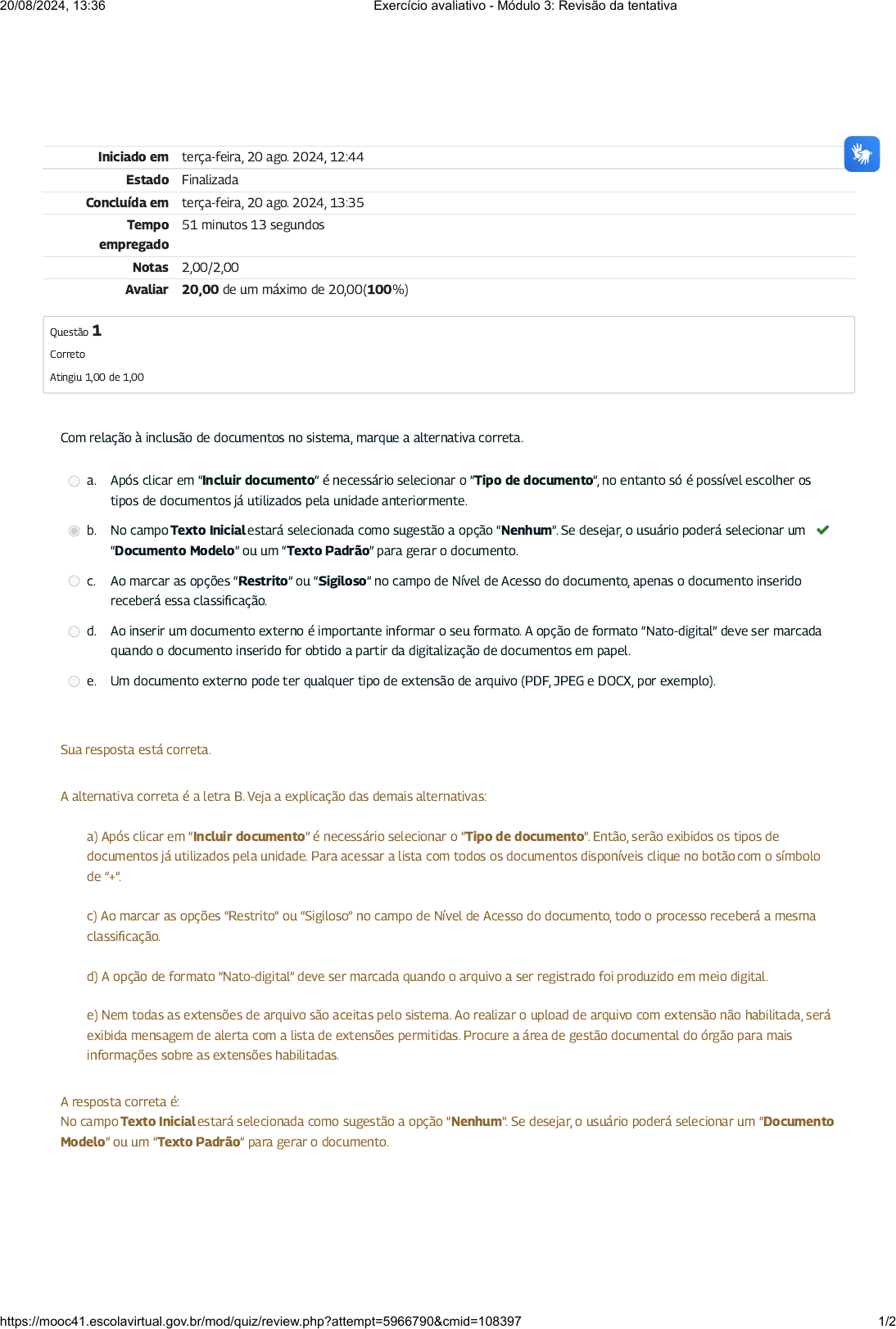<p>Iniciado em terça-feira, 20 ago. 2024, 12:44</p><p>Estado Finalizada</p><p>Concluída em terça-feira, 20 ago. 2024, 13:35</p><p>Tempo</p><p>empregado</p><p>51 minutos 13 segundos</p><p>Notas 2,00/2,00</p><p>Avaliar 20,00 de um máximo de 20,00(100%)</p><p>Questão 1</p><p>Correto</p><p>Atingiu 1,00 de 1,00</p><p>Com relação à inclusão de documentos no sistema, marque a alternativa correta.</p><p>a. Após clicar em “Incluir documento” é necessário selecionar o “Tipo de documento”, no entanto só é possível escolher os</p><p>tipos de documentos já utilizados pela unidade anteriormente.</p><p>b. No campo Texto Inicial estará selecionada como sugestão a opção “Nenhum”. Se desejar, o usuário poderá selecionar um</p><p>“Documento Modelo” ou um “Texto Padrão” para gerar o documento.</p><p></p><p>c. Ao marcar as opções “Restrito” ou “Sigiloso” no campo de Nível de Acesso do documento, apenas o documento inserido</p><p>receberá essa classi�cação.</p><p>d. Ao inserir um documento externo é importante informar o seu formato. A opção de formato “Nato-digital” deve ser marcada</p><p>quando o documento inserido for obtido a partir da digitalização de documentos em papel.</p><p>e. Um documento externo pode ter qualquer tipo de extensão de arquivo (PDF, JPEG e DOCX, por exemplo).</p><p>Sua resposta está correta.</p><p>A alternativa correta é a letra B. Veja a explicação das demais alternativas:</p><p>a) Após clicar em “Incluir documento” é necessário selecionar o “Tipo de documento”. Então, serão exibidos os tipos de</p><p>documentos já utilizados pela unidade. Para acessar a lista com todos os documentos disponíveis clique no botão com o símbolo</p><p>de “+”.</p><p>c) Ao marcar as opções “Restrito” ou “Sigiloso” no campo de Nível de Acesso do documento, todo o processo receberá a mesma</p><p>classi�cação.</p><p>d) A opção de formato “Nato-digital” deve ser marcada quando o arquivo a ser registrado foi produzido em meio digital.</p><p>e) Nem todas as extensões de arquivo são aceitas pelo sistema. Ao realizar o upload de arquivo com extensão não habilitada, será</p><p>exibida mensagem de alerta com a lista de extensões permitidas. Procure a área de gestão documental do órgão para mais</p><p>informações sobre as extensões habilitadas.</p><p>A resposta correta é:</p><p>No campo Texto Inicial estará selecionada como sugestão a opção “Nenhum”. Se desejar, o usuário poderá selecionar um “Documento</p><p>Modelo” ou um “Texto Padrão” para gerar o documento.</p><p>20/08/2024, 13:36 Exercício avaliativo - Módulo 3: Revisão da tentativa</p><p>https://mooc41.escolavirtual.gov.br/mod/quiz/review.php?attempt=5966790&cmid=108397 1/2</p><p>Questão 2</p><p>Correto</p><p>Atingiu 1,00 de 1,00</p><p>Com base nas operações de excluir e de cancelar documento no SEI, marque a alternativa correta:</p><p>a. Qualquer documento, em qualquer hipótese, poderá ser excluído do sistema.</p><p>b. O cancelamento de um documento é utilizado nos casos em que não caiba mais edição ou não seja possível a exclusão do</p><p>documento, ou seja, documentos que tiveram sua tramitação ou ciclo de assinaturas completo.</p><p></p><p>c. O documento excluído poderá ser visualizado na árvore do processo pelo usuário que o excluiu.</p><p>d. O cancelamento de documentos é permitido a qualquer usuário, independentemente da sua vinculação à unidade em que o</p><p>documento foi gerado ou inserido.</p><p>Sua resposta está correta.</p><p>A alternativa correta é a letra B. Veja a explicação das demais alternativas:</p><p>a) Documentos poderão ser excluídos do processo se:</p><p>foram gerados mas não assinados;</p><p>foram gerados e assinados, porém sem ter tramitado ou visualizado por outra pessoa/unidade (ícone da caneta amarela);</p><p>forem documentos externos que ainda não tramitaram, não foram visualizados por outra unidade e não foram concluídos e</p><p>reabertos.</p><p>c) O documento excluído não �cará disponível na Árvore do Processo.</p><p>d) O cancelamento de documentos só é permitido aos usuários da unidade em que o documento foi gerado ou inserido.</p><p>A resposta correta é:</p><p>O cancelamento de um documento é utilizado nos casos em que não caiba mais edição ou não seja possível a exclusão do documento,</p><p>ou seja, documentos que tiveram sua tramitação ou ciclo de assinaturas completo.</p><p>20/08/2024, 13:36 Exercício avaliativo - Módulo 3: Revisão da tentativa</p><p>https://mooc41.escolavirtual.gov.br/mod/quiz/review.php?attempt=5966790&cmid=108397 2/2</p>
