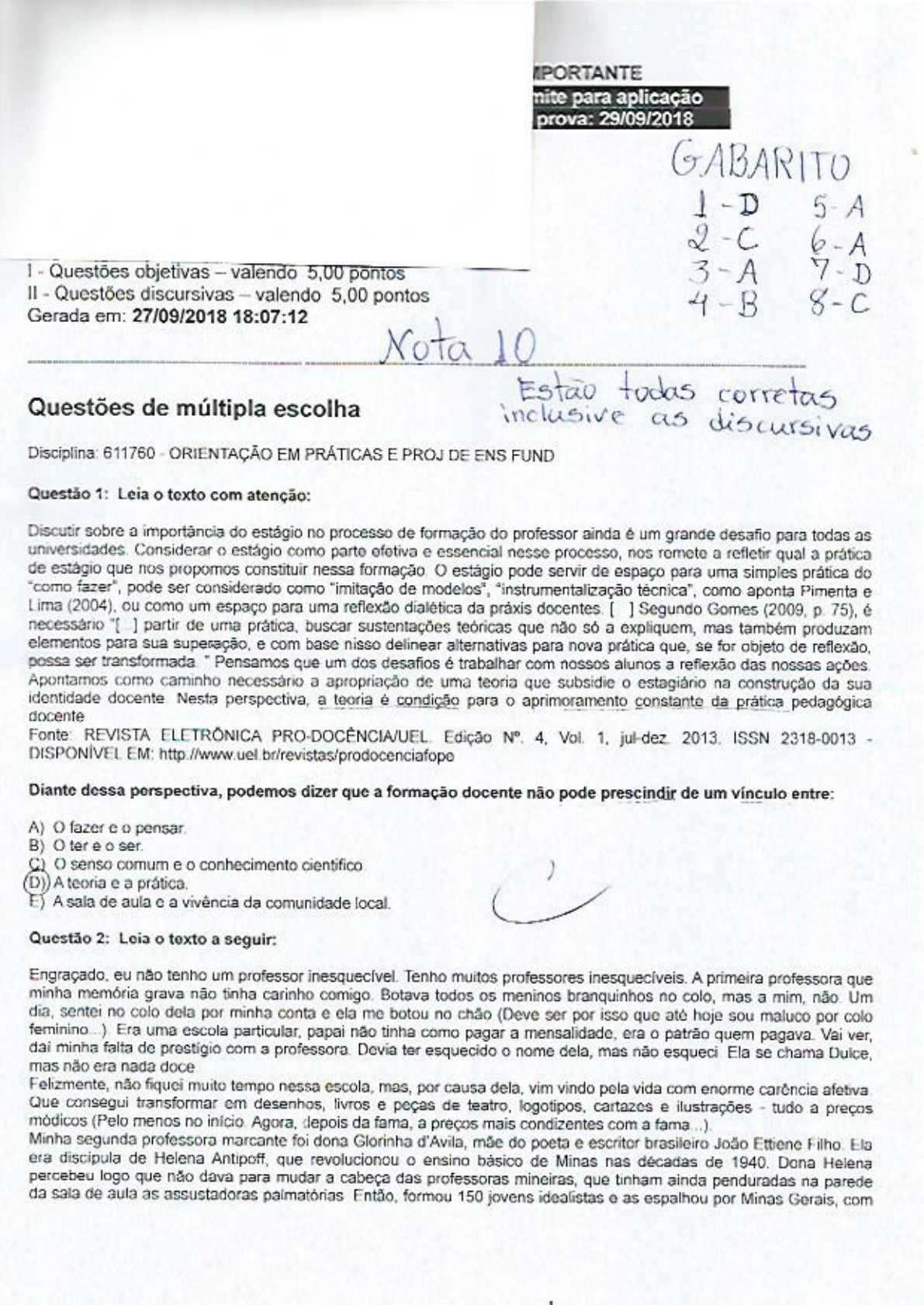 <p>IPORTANTE mite para aplicação prova: 29/09/2018 GABARITO 1-D 5-A 6-A Questões objetivas valendo 5,00 pontos 3-A 7-D II Questões discursivas valendo 5,00 pontos 4-B 8-C Gerada em: 27/09/2018 18:07:12 Nota 10 Estao todas corretas Questões de múltipla escolha inclusive as discursivas Disciplina: 611760 ORIENTAÇÃO EM PRÁTICAS E PROJ DE ENS FUND Questão 1: Leia texto com atenção: Discutir sobre a importância do estágio no processo de formação do professor ainda é um grande desafio para todas as Considerar estágio como parte e essencial nesse processo, nos remete a refletir qual a prática de estágio que nos propomos constituir nessa formação estágio pode servir de espaço para uma simples prática do "como fazer", pode ser considerado como de modelos", como aponta Pimenta e Lima ou como um espaço para uma reflexão da práxis [ ] Segundo Gomes 75), é partir de uma buscar sustentações teóricas que não só a expliquem, mas também produzam elementos para sua e com base nisso delinear alternativas para nova prática que, se for objeto de reflexão, possa ser transformada Pensamos que um dos desafios é trabalhar com nossos alunos a reflexão das nossas Apontamos como caminho necessário a apropriação de uma teoria que subsidie estagiário na construção da sua identidade docente Nesta perspectiva, a teoria é condição para aprimoramento constante da prática pedagógica docente Fonte: REVISTA ELETRÔNICA PRO-DOCÊNCIA/UEL Edição 4, Vol. 2013. ISSN 2318-0013 DISPONÍVEL EM: Diante dessa perspectiva, podemos dizer que a formação docente não pode prescindir de um vínculo entre: A) o fazer e B) ter e O senso comum e conhecimento cientifico (D)) A teoria e a E) A sala de aula a da comunidade Questão 2: texto a seguir: eu não tenho um professor Tenho muitos professores A primeira professora que minha memória grava não tinha carinho Botava todos os meninos branquinhos no colo, mas a mim, não Um dia, sentei no colo dela por minha conta e ela me botou no chão (Deve ser por isso que até hoje sou maluco por colo Era uma escola particular, papai não tinha como pagar a mensalidade, era patrão quem pagava. Vai ver, dai minha falta de prestigio com Devia ter esquecido nome dela, mas não esqueci Ela se chama mas não era nada doce Felizmente, não fiquei muito tempo nessa mas, por causa dela, vim vindo pela vida com enorme carência afetiva Que consegui transformar em desenhos, livros e peças de teatro, logotipos, cartazes e ilustrações tudo a preços módicos (Pelo menos no Agora, depois da fama, a preços mais condizentes com a fama...) Minha segunda professora marcante foi dona Glorinha d'Avila, mãe do poeta e escritor brasileiro João Filho Ela era discipula de Helena Antipoff, que revolucionou ensino básico de Minas nas décadas de Dona Helena percebeu logo que não dava para mudar a cabeça das professoras mineiras, que tinham ainda penduradas na parede da sala de aula as assustadoras palmatórias formou 150 jovens idealistas e as espalhou por Minas Gerais, com</p>