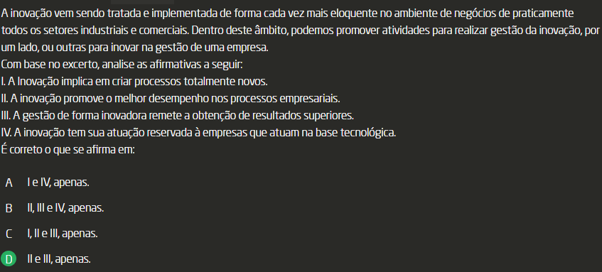 <p>A inovação vem sendo tratada e implementada de forma cada vez mais eloquente no ambiente de negócios de praticamente todos os setores industriais e comerciais. Dentro deste âmbito, podemos promover atividades para realizar gestão da inovação, por um lado, ou outras para inovar na gestão de uma empresa. Com base no excerto, analise as afirmativas a I. A Inovação implica em criar processos totalmente novos. II. A inovação promove melhor desempenho nos processos empresariais. III. A gestão de forma inovadora remete a obtenção de resultados superiores. IV. A inovação tem sua atuação reservada à empresas que atuam na base tecnológica. É correto que se afirma em: A I e IV, apenas. B II, III e IV, apenas. C I, II e III, apenas. D II e III, apenas.</p>