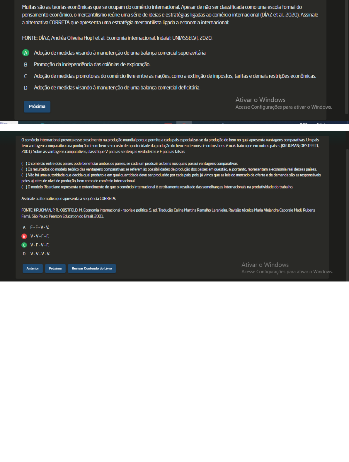 <p>Muitas são as teorias econômicas que se ocupam do comércio internacional. Apesar de não ser classificada como uma escola formal do pensamento econômico, mercantilismo reúne uma série de ideias e estratégias ligadas ao comércio internacional (DÍAZ et al., 2020). Assinale a alternativa CORRETA que apresenta uma estratégia mercantilista ligada a economia internacional: FONTE: Andréa Oliveira Hopf et al. Economia internacional. Indaial: UNIASSELVI, 2020. A Adoção de medidas visando à manutenção de uma balança comercial superavitária. B Promoção da independência das colônias de exploração. Adoção de medidas promotoras do comércio livre entre as nações, como a extinção de impostos, tarifas e demais restrições econômicas. D Adoção de medidas visando à manutenção de uma balança comercial deficitária. Ativar Windows Próxima Acesse Configurações para ativar Windows. 0 comércio internacional provoca esse crescimento na produção mundial porque permite a cada país especializar-se da produção do bem no qual apresenta vantagens comparativas. Um país tem vantagens comparativas na produção de um bem se custo de oportunidade da produção do bem em termos de outros bens é mais baixo que em outros países 2001) Sobre as vantagens comparativas, classifique V para as sentenças verdadeiras e F para as ( comércio entre dois países pode beneficiar ambos os países, se cada um produzir os bens nos quais possui vantagens comparativas. ( ) Os resultados do modelo teórico das vantagens comparativas se referem às possibilidades de produção dos países em questão, e, portanto, representam a economia real desses ( ) Não há uma autoridade que decida qual produto e em qual quantidade deve ser produzido por cada país, pois, já vimos que as leis do mercado de oferta e de demanda são as responsáveis pelos ajustes de nível de produção, bem como de comércio internacional. ( modelo Ricardiano representa entendimento de que comércio internacional é estritamente resultado das semelhanças internacionais na produtividade do trabalho. Assinale a alternativa que apresenta a CORRETA: FONTE: P.R. Economia internacional teoria e 5. ed. Tradução Celina Martins Ramalho Laranjeira. Revisão técnica Maria Alejandra Caporale Rubens Famá São Pearson Education do Brasil, 2001. A B V-F-V-F D V-V-V-V Ativar Windows Anterior Próxima Revisar Conteúdo do Livro Acesse Configurações para ativar Windows.</p><p>1 2 3 5 7 9 10 0 pensamento mercantilista sai do campo da teoria a partir do século XVI e entra para a História por meio de seu impacto nas políticas dos países FIELD COBB, Sobre analise as sentenças a I-0 sistema econômico mercantilista tinha como base a ideia de que a concentração de metais preciosos era fundamental para os países. Havia uma visão dinâmica dos recursos econômicos mundiais, em que os ganhos econômicos de um país advinham dos ganhos econômicos de outro III-Para os países emergentes europeus do século XVI, era preciso atuar constantemente na aquisição de metais preciosos como forma de aumentar suas e bem-estar individual. IV-0 aperfeiçoamento do poder do Estado enfraqueceu processo de crescimento econômico e, consequentemente, estagnou desenvolvimento do Assinale a alternativa CORRETA: FONTE: APPLEYARD, FIELD JR., A. COBB, S. L Economia internacional. Tradução técnica André Fernandes Lima et al. 6. ed. Porto Alegre: AMGH, 2010. A As sentenças le III estão B As sentenças le IV estão As sentenças II e IV estão D As sentenças II e III estão Ativar Windows Anterior Próxima Acesse Configurações para ativar Windows. POR 19:59 N 25°C - PTB2 27/08/2024</p>