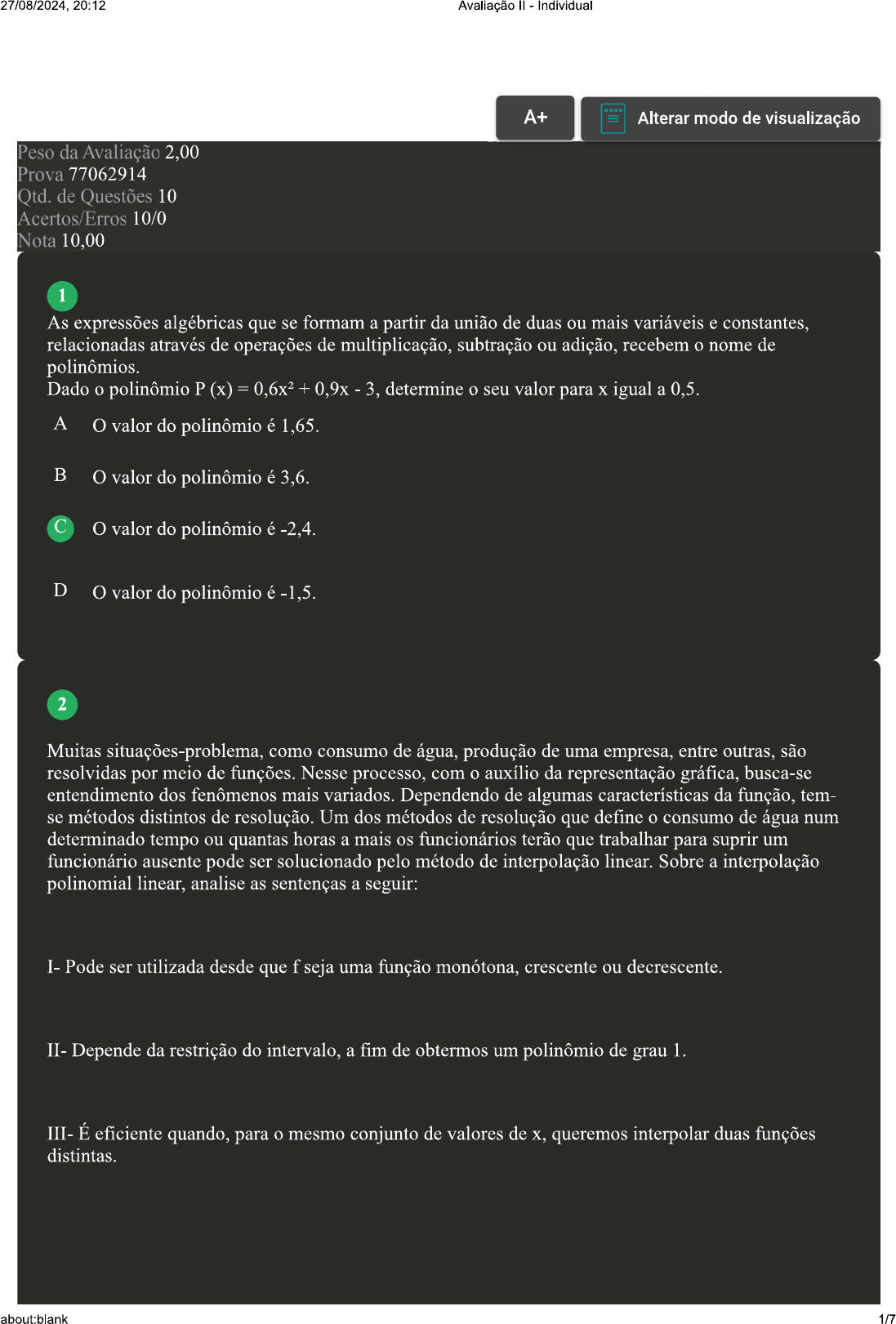 <p>27/08/2024, 20:12 Avaliação Individual A+ Alterar modo de visualização Peso da Avaliação 2,00 Prova 77062914 Qtd. de Questões 10 Acertos/Erros 10/0 Nota 10,00 1 As expressões algébricas que se formam a partir da união de duas ou mais variáveis e constantes, relacionadas através de operações de multiplicação, subtração ou adição, recebem nome de polinômios. Dado polinômio P (x) 0,6x2 + 0,9x - - 3, determine seu valor para X igual a A O valor do polinômio é 1,65. B O valor do polinômio é 3,6. C O valor do polinômio é -2,4. D O valor do polinômio é -1,5. 2 Muitas situações-problema, como consumo de água, produção de uma empresa, entre outras, são resolvidas por meio de funções. Nesse processo, com o auxílio da representação gráfica, busca-se entendimento dos fenômenos mais variados. Dependendo de algumas características da função, tem- se métodos distintos de resolução. Um dos métodos de resolução que define consumo de água num determinado tempo ou quantas horas a mais os funcionários terão que trabalhar para suprir um funcionário ausente pode ser solucionado pelo método de interpolação linear. Sobre a interpolação polinomial linear, analise as sentenças a seguir: I- Pode ser utilizada desde que f seja uma função monótona, crescente ou decrescente. II- Depende da restrição do intervalo, a fim de obtermos um polinômio de grau 1. III- É eficiente quando, para mesmo conjunto de valores de X, queremos interpolar duas funções distintas. about:blank 1/7</p><p>27/08/2024. 20:12 Avaliação Individual IV- utilizado quando estamos interessados no valor de apenas um ponto X. Assinale a alternativa CORRETA: A As sentenças I e III estão corretas. B As sentenças I e IV estão corretas. C As sentenças II e III estão corretas. D As sentenças II e IV estão corretas. 3 Método iterativo clássico que data do final do século XVIII. Técnicas são raramente utilizadas para solucionar sistemas lineares de pequenas dimensões, já que tempo requerido para obter um mínimo de precisão ultrapassa requerido pelas técnicas diretas como a eliminação gaussiana. Contudo, para sistemas grandes, com grande porcentagem de entradas de zero, essas técnicas aparecem como alternativas mais eficientes. Sistemas esparsos de grande porte frequentemente surgem na análise de circuitos, na solução numérica de problemas de valor de limite e equações diferenciais parciais. De que método estamos falando? A Método de Jacobi. B Método de Gauss. C Método de bissecção. D Método de Newton. 4 No universo da Matemática, tudo que estudamos tem uma razão e aplicabilidade. Da teoria à prática, os logaritmos são trabalhados em diversas áreas do conhecimento. O trabalho com uma função logarítmica tem como objetivo facilitar os cálculos, bem como ampliar os conhecimentos em assuntos específicos, como: a) na Química, quando trabalho envolve radioatividade, para determinar o tempo de desintegração de uma substância radioativa é utilizada a fórmula: Q=qo.e^(-r-t). Nesta fórmula, Q representa a massa da substância, q° a massa inicial, r a taxa de redução da radioatividade e a variável t tempo. Equações com essa tipologia podem ser resolvidas com auxílio da teoria dos logaritmos; b) no ano de 1935, os sismólogos Charles Francis Richter e Beno Gutenberg desenvolveram uma escala para quantificar nível de energia liberada por um sismo. A escala Richter, que também é conhecida por escala de magnitude local, é uma função logarítmica. Assim, é about:blank 2/7</p><p>27/08/2024, 20:12 Avaliação Individual possível quantificar em Joules a quantidade de energia liberada por um movimento tectônico; c) na Medicina, quando é ministrado um tratamento, paciente recebe medicamento. que entra na corrente sanguínea, que passa por órgãos como fígado e rins. Neste caso, é possível obter tempo necessário para que a quantidade desse medicamento presente no corpo do paciente seja menor ou maior que uma determinada quantidade, e para isso é necessário trabalhar com uma equação logarítmica. Neste contexto, trabalhando com uma margem de erro menor ou igual a (0,1), calcule valor aproximado da função: f(x) x.log(x+1) 2, sabendo que a função tem apenas uma raiz real, Utilize o MÉTODO DA BISSECÇÃO Para k=0, considerarmos e Na iteração k=1, tomamos (a+b) 2 Então uma das três situações a seguir pode ocorrer: 1) A primeira situação que pode ocorrer é f(x1)=0. Neste caso, tivemos sorte e encontramos exatamente a raiz de e não há mais nada a ser feito. 2) Outra possibilidade é Então repetimos o procedimento para o intervalo com e 3) A terceira situação é > 0. Neste caso, f(a) e f(x1) tem o mesmo sinal e, portanto, < 0 Repetimos assim o procedimento para o intervalo que está contida no intervalo. com e =b. A A função tem sua raiz real em 3,3. B A função tem sua raiz real em 3,25. C A função tem sua raiz real em 3,5. D A função tem sua raiz real em 3,2. 5 A interpolação é um método que permite definir uma nova função a partir de um conjunto discreto de dados pontuais previamente conhecidos e que represente a função inicial. Com relação à interpolação inversa de uma função f, analise as sentenças a seguir: I- É a operação inversa à interpolação. II- Pode ser aplicada qualquer que seja a função f. about:blank</p><p>27/08/2024, 20:12 Avaliação Individual Só podemos aplicar via interpolação linear. IV- É utilizada quando estamos interessados no valor de X cujo f(x) conhecemos. Assinale a alternativa CORRETA: A As sentenças I e II estão corretas. B Somente a sentença IV está correta. C As sentenças I e III estão corretas. D Somente a sentença I está correta. 6 Funções polinomiais são um caso particular de funções, em geral são bem-comportadas e apresentam várias propriedades interessantes. Uma dessas propriedades é que todo polinômio possui pelo menos uma raiz, pod