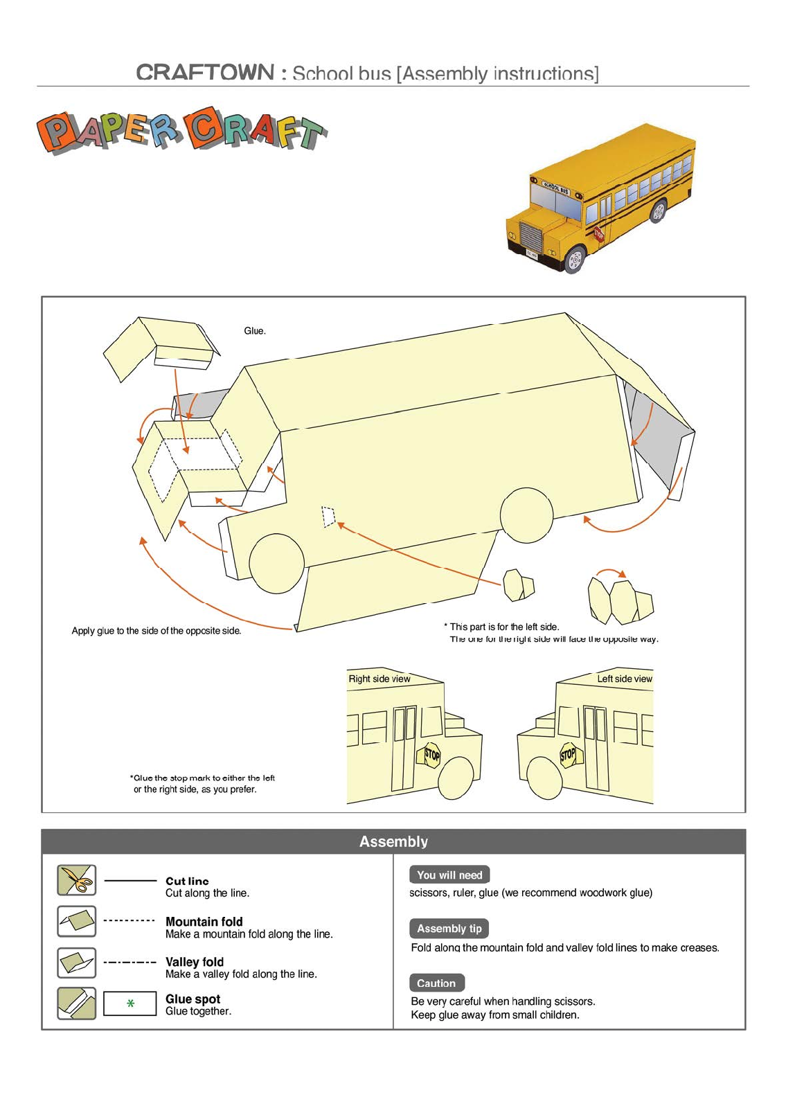 <p>CRAFTOWN : School bus [Assembly instructions] 8 Glue. Apply glue to the side of the opposite side. * This part is for the left side. The one for the right side will face the opposite way. Right side view Left side view STOP *Glue the stop mark to either the left or the right side, as you prefer. Assembly You will need Cut line Cut along the line. scissors, ruler, glue (we recommend woodwork glue) Mountain fold Make a mountain fold along the line. Assembly tip Fold along the mountain fold and valley fold lines to make creases. Valley fold Make a valley fold along the line. Caution Glue spot Be very careful when handling scissors. Glue together. Keep glue away from small children.</p><p>fold CRAFTOWN : School bus Valley fold Glue spot 99-55 * * * 55-66 STOPSTOP STOPSTOP *</p>