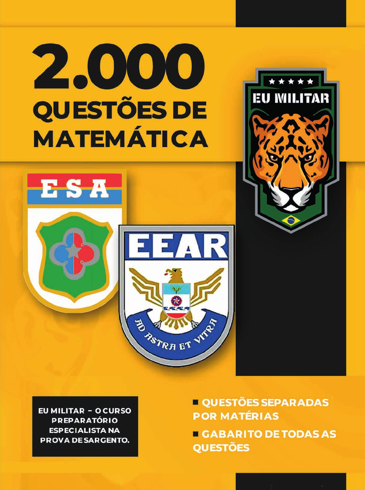 <p>2</p><p>.0</p><p>0</p><p>0</p><p>Q</p><p>U</p><p>E</p><p>S</p><p>T</p><p>Õ</p><p>E</p><p>S</p><p>D</p><p>E</p><p>M</p><p>A</p><p>T</p><p>E</p><p>M</p><p>Á</p><p>T</p><p>IC</p><p>AAcesse:</p><p>www.eumilitar.com.br</p><p>sac@eumilitar.com.br</p><p>Nós sabemos que ser aprovado num concurso militar</p><p>é um grande desafio, por isso é muito importante estar</p><p>focado em ter a melhor preparação possível.</p><p>É verdade que não existe uma fórmula mágica ou uma</p><p>regra de como estudar para passar em um concurso,</p><p>mas estudar sem o material correto não te aproxima</p><p>da vitória, pelo contrário, só afasta.</p><p>E foi com isso em mente que nós criamos um material</p><p>didático específico para a prova de sargento.</p><p>Então aproveite!</p><p>ANO 2023</p><p>Edição 2023 © Eu Militar</p><p>Organizador I Professor Jonas Pereira de Lima Junior</p><p>Produção Editorial | Editora Kimera</p><p>Revisão de Texto | Flor de Letras (Claudia Gouvêa)</p><p>Projeto Gráfico | ArtePlus</p><p>Grafia atualizada segundo o Acordo Ortográfico da Língua</p><p>Portuguesa de 1990, em vigor no Brasil desde 1º de janeiro</p><p>de 2009.</p><p>Ao comprar um livro, você remunera e reconhece o trabalho</p><p>do autor e de muitos outros profissionais envolvidos na</p><p>produção e comercialização das obras: editores, revisores,</p><p>diagramadores, ilustradores, gráficos, divulgadores,</p><p>distribuidores, livreiros, entre outros. Ajude-nos a combater</p><p>a cópia ilegal! Ela gera desemprego, prejudica a difusão da</p><p>cultura e encarece os livros que você compra.</p><p>Dados Internacionais de Catalogação na Publicação (CIP)</p><p>(Câmara Brasileira do Livro, SP, Brasil)</p><p>Eu Militar,</p><p>2.000 Questões de Matemática / Jonas Pereira de Lima</p><p>Junior. - Rio de Janeiro, RJ : Editora Kimera, 2023.</p><p>ISBN 978-85-68883-79-2</p><p>1. Apostila - Curso. I. Militar. III. Título.</p><p>22-129825 CDD: 028.5</p><p>Cibele Maria Dias - Bibliotecária - CRB-8/9427</p><p>EU MILITAR</p><p>www.eumilitar.com</p><p>APRESENTAÇÃO</p><p>Bem-vindo à nossa apostila de questões para ESA e EEAR! Com este</p><p>material, você estará preparado para encarar desafios e superar obstáculos</p><p>rumo ao seu objetivo de ingressar na carreira de Sargento.</p><p>Nesta apostila, você encontrará questões de matemática que nossa</p><p>equipe de professores especialistas selecionou cuidadosamente, garantindo</p><p>assim a sua relevância e atualidade. O gabarito é objetivo, o que vai te ajudar</p><p>compreender o raciocínio e a lógica por trás de cada questão.</p><p>Com a nossa apostila, você poderá treinar seu conhecimento e habilidade</p><p>em resolução de questões, aumentando sua confiança e preparação para o</p><p>concurso militar. Além disso, poderá verificar seu progresso através do gabarito</p><p>disponibilizado no final de todo o conteúdo.</p><p>Não perca mais tempo e comece já a se preparar com a nossa apostila de</p><p>questões para concursos militares! Com dedicação e esforço, você alcançará</p><p>o sucesso e ingressará na carreira militar dos seus sonhos.</p><p>Boa sorte!</p><p>COMO SE PREPARAR</p><p>É importante dedicar tempo suficiente para estudar e se preparar para o</p><p>concurso, mas tente manter uma vida social ativa e saudável. Portanto, não se</p><p>esqueça de:</p><p>• Planejar sua rotina: estabeleça horários específicos para estudar, participar</p><p>de atividades sociais e descansar.</p><p>• Se juntar a um grupo de pessoas que tem o mesmo objetivo que o seu: isso</p><p>pode te ajudar a se manter motivado, ao mesmo tempo em que interage com os</p><p>amigos sobre o assunto.</p><p>• Praticar atividade física: o concurso militar tem uma segunda etapa onde</p><p>testa sua aptidão física, então é importante estar preparado.</p><p>O equilíbrio é a chave para o sucesso. Caso você se dedique tempo suficiente</p><p>para estudar e se preparar para o concurso, mas também tenha tempo para se</p><p>divertir e se socializar, será mais provável que você se sinta motivado e com</p><p>energia para continuar.</p><p>Observação importante sobre a sua apostila: nós preparamos um módulo</p><p>extra ao final da apostila, e nele colocamos questões de matemática básica para</p><p>garantir que você tenha as bases necessárias para aprofundar seu conhecimento</p><p>nos demais assuntos.</p><p>Logo após, nós disponibilizamos uma revisão dos conteúdos que mais</p><p>aparecem na sua prova e que você precisa conhecer bem.</p><p>Por último, você vai ter acesso a alguns testes, que funcionam como um</p><p>simulado com os conteúdos da apostila, para você ter uma ideia de como será</p><p>no dia da prova.</p><p>Você fez uma ótima escolha ao adquirir essa apostila de questões. Agora,</p><p>é hora de colocar em prática todo o seu esforço e dedicação para conquistar</p><p>sua aprovação no concurso militar. Lembre-se, o sucesso não vem da noite</p><p>para o dia, mas é resultado do esforço contínuo e da persistência em busca</p><p>dos seus objetivos. Aproveite cada oportunidade para estudar, absorver todo o</p><p>conhecimento disponível e se preparar da melhor forma possível.</p><p>Com determinação e trabalho duro, você pode alcançar o seu sonho e se</p><p>tornar um militar de carreira.</p><p>Não desista, você é capaz!</p><p>#maquinadepapiro</p><p>Vamos juntos!</p><p>SUMÁRIO</p><p>Capítulo 1 - Conjuntos e conjuntos numéricos .......................................................... 07</p><p>Capítulo 2 - Funções ................................................................................................. 13</p><p>Capítulo 3 - Função afim e inequação do 1º grau ..................................................... 18</p><p>Capítulo 4 - Função quadrática e inequação do 2º grau ........................................... 22</p><p>Capítulo 5 - Equação exponencial, função ex