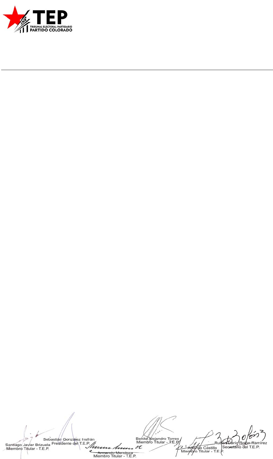 <p>Asunción, 4 de Noviembre de 2019.-</p><p>VISTA: La inscripción del MOVIMIENTO "FUERZA RENOVADORA REPUBLICANA" , y</p><p>su respectiva lista de pre-candidatos para la elección interna partidaria prevista para el día</p><p>domingo 15 de Diciembre de 2019; y, -</p><p>CONSIDERANDO:</p><p>POR LA QUE SE OFICIALIZAN LAS CANDIDATURAS DEL MOVIMIENTO "FUERZA</p><p>RENOVADORA REPUBLICANA".</p><p>RESOLUCION N° 589</p><p>9 de setiembre de 2019 dictada por el Tribunal Electoral Partidario, en la que dispone en el</p><p>numeral 2.18.- “Inscripción de Pre-Candidaturas: hasta las 13:00 horas del 1 de octubre de 2019</p><p>(Art. 55, 56, 58 y 59 R.E.).-</p><p>cretaría del Tribunal Electoral Partidario por el término de cinco días corridos a partir del 14 de</p><p>octubre de 2019 hasta las 13:00 horas del 18 de octubre de 2019, estableciéndose que dentro de</p><p>dicho plazo debe pantearse las impugnaciones a que hubiere lugar.-</p><p>candidaturas, notificadas en tiempo y forma, y habiendo transcurrido el plazo, corresponde que el</p><p>Tribunal Electoral Partidario oficialice las pre-candidaturas que se encuentran conforme a lo</p><p>dispuesto en el Estatuto Partidario, Reglamento Electoral y demás disposiciones legales que</p><p>rigen la materia.-</p><p>Estatutarias y Reglamentarias que rigen la materia, en usos de sus atribuciones; -</p><p>Que, las mismas fueron presentadas en cumplimiento de la Resolución Nro. 424 de</p><p>Que, recibida las propuestas a pre-candidaturas, fueron puestas de manifiesto en la</p><p>Que, habiendo existido impugnaciones o inhabilidades de algunas propuestas de pre-</p><p>Por tanto, en mérito de las consideraciones que anteceden y las disposiciones legales,</p><p>presentación de la declaración jurada consignando todos los activos y recursos de la campaña</p><p>electoral entre el 4 de noviembre y el 8 de noviembre del presente año de 7:00 a 13:00 hs, en</p><p>Secretaría de éste Tribunal, conforme al inciso a) del artículo 64 de la ley N° 6167/2018 que</p><p>regula el financiamiento político; -</p><p>Que, en el numeral 2.29 de la Resolución N° 424 dictada por este Tribunal, se dispone la</p><p>las candidaturas propuestas por el MOVIMIENTO "FUERZA</p><p>RENOVADORA REPUBLICANA", conforme al listado adjunto y que forma parte de esta</p><p>resolución. -</p><p>TRIBUNAL ELECTORAL PARTIDARIO</p><p>RESUELVE:</p><p>1.- OFICIALIZAR</p><p>que los movimientos presenten la declaración jurada consignando todos</p><p>los activos y recursos de la campaña electoral. -</p><p>a quien corresponda y cumplido archivar. -</p><p>2.-</p><p>3.-</p><p>DISPONER</p><p>COMUNICAR</p><p>Elección Interna de la Comisión Central de la</p><p>Juventud Colorada - 15/12/2019</p><p>Asociación Nacional Republicana</p><p>Tribunal Electoral Partidario</p><p>Area de Sistemas</p><p>Oficialización de Candidaturas</p><p>Asunción, 4 de Noviembre de 2019Anexo de la Resolución N° 589 / 2019</p><p>Mov.: FUERZA RENOVADORA REPUBLICANA MFRRSiglas:</p><p>Cargo: PRESIDENTE DE LA COMISION CENTRAL DE LA JUVENTUD COLORADA1</p><p>Orden C.I. Nº Nombre y Apellido</p><p>1 3.390.033 MARCELO FAUSTINO CENTURION VELILLA</p><p>Elección Interna de la Comisión Central de la</p><p>Juventud Colorada - 15/12/2019</p><p>Asociación Nacional Republicana</p><p>Tribunal Electoral Partidario</p><p>Area de Sistemas</p><p>Oficialización de Candidaturas</p><p>Asunción, 4 de Noviembre de 2019Anexo de la Resolución N° 589 / 2019</p><p>Mov.: FUERZA RENOVADORA REPUBLICANA MFRRSiglas:</p><p>Departamento: 0 CAPITAL</p><p>Cargo: MIEMBRO DEPTAL TITULAR DE LA COM.CENTRAL DE LA JUVENTUD4</p><p>Orden C.I. Nº Nombre y Apellido</p><p>1 3.768.103 JOSE MANUEL PLATE SILVERO</p><p>2 3.753.294 JUAN CARLOS OZORIO ADMEN</p><p>3 3.655.635 MARGARET ELIZABETH LOPEZ SILVA</p><p>Elección Interna de la Comisión Central de la</p><p>Juventud Colorada - 15/12/2019</p><p>Asociación Nacional Republicana</p><p>Tribunal Electoral Partidario</p><p>Area de Sistemas</p><p>Oficialización de Candidaturas</p><p>Asunción, 4 de Noviembre de 2019Anexo de la Resolución N° 589 / 2019</p><p>Mov.: FUERZA RENOVADORA REPUBLICANA MFRRSiglas:</p><p>Departamento: 0 CAPITAL</p><p>Cargo: MIEMBRO DEPTAL SUPLENTE DE LA COM.CENTRAL DE LA JUVENTUD5</p><p>Orden C.I. Nº Nombre y Apellido</p><p>1 3.200.627 VICTOR GABRIEL RODRIGUEZ ULLON</p><p>2 3.653.828 EMILIANO GASPAR CANTERO JACQUET</p><p>3 3.642.747 MARIA NATHALIA SAMANIEGO MACIEL</p><p>Elección Interna de la Comisión Central de la</p><p>Juventud Colorada - 15/12/2019</p><p>Asociación Nacional Republicana</p><p>Tribunal Electoral Partidario</p><p>Area de Sistemas</p><p>Oficialización de Candidaturas</p><p>Asunción, 4 de Noviembre de 2019Anexo de la Resolución N° 589 / 2019</p><p>Mov.: FUERZA RENOVADORA REPUBLICANA MFRRSiglas:</p><p>Departamento: 0 CAPITAL</p><p>Comisión Seccional: 2 DR. FACUNDO INSFRAN</p><p>Cargo: PRESIDENTE DE SECCIONAL6</p><p>Orden C.I. Nº Nombre y Apellido</p><p>1 5.032.531 MARIA JAZMIN RODRIGUEZ VELAZQUEZ</p><p>Elección Interna de la Comisión Central de la</p><p>Juventud Colorada - 15/12/2019</p><p>Asociación Nacional Republicana</p><p>Tribunal Electoral Partidario</p><p>Area de Sistemas</p><p>Oficialización de Candidaturas</p><p>Asunción, 4 de Noviembre de 2019Anexo de la Resolución N° 589 / 2019</p><p>Mov.: FUERZA RENOVADORA REPUBLICANA MFRRSiglas:</p><p>Departamento: 0 CAPITAL</p><p>Comisión Seccional: 2 DR. FACUNDO INSFRAN</p><p>Cargo: MIEMBRO TITULAR DE SECCIONAL7</p><p>Orden C.I. Nº Nombre y Apellido</p><p>1 3.822.391 OSMAR ANDRES BAELLO CABALLERO</p><p>2 4.800.828 LIDIA JOHANA RIOS CUEVAS</p><p>3 3.279.967 MARIA BELEN ORTEGA VERA</p><p>4 4.203.460 NAOMI SOPHIA BORJA CANTERO</p><p>5 2.481.203 BERND CHRISTIAN FUNK DURKSEN</p><p>6 4.311.486 NELSON MARTIN GONZALEZ MONGES</p><p>7 5.024.370 RICHARD GUSTAVO BRITEZ DIAZ</p><p>8 3.652.501 MARIA FATIMA DOMINGUEZ NUÑEZ</p><p>9 4.248.356 KATHERIN FABIANA BEATRIZ VEGA DIANA</p><p>10 3.759.610 LIZA VALERIA BENITEZ RIVEROS</p>