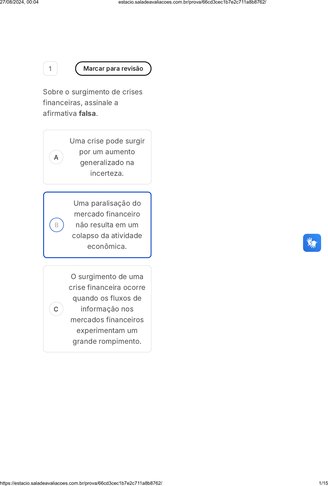 <p>A</p><p>B</p><p>C</p><p>1 Marcar para revisão</p><p>Sobre o surgimento de crises</p><p>financeiras, assinale a</p><p>afirmativa falsa.</p><p>Uma crise pode surgir</p><p>por um aumento</p><p>generalizado na</p><p>incerteza.</p><p>Uma paralisação do</p><p>mercado financeiro</p><p>não resulta em um</p><p>colapso da atividade</p><p>econômica.</p><p>O surgimento de uma</p><p>crise financeira ocorre</p><p>quando os fluxos de</p><p>informação nos</p><p>mercados financeiros</p><p>experimentam um</p><p>grande rompimento.</p><p>27/08/2024, 00:04 estacio.saladeavaliacoes.com.br/prova/66cd3cec1b7e2c711a8b8762/</p><p>https://estacio.saladeavaliacoes.com.br/prova/66cd3cec1b7e2c711a8b8762/ 1/15</p><p>D</p><p>E</p><p>A</p><p>B</p><p>Os problemas de</p><p>informação</p><p>assimétrica que agem</p><p>como barreiras contra</p><p>a alocação eficiente</p><p>do capital são</p><p>chamados de fricções</p><p>financeiras.</p><p>Uma crise pode surgir</p><p>por causa de aumento</p><p>ou diminuição</p><p>significativa de</p><p>crédito na economia.</p><p>2 Marcar para revisão</p><p>Considere um banco que</p><p>recebe um depósito de R$1.000</p><p>de João e empresta R$400</p><p>desse valor para Maria.</p><p>Assinale a alternativa correta.</p><p>O risco de crédito</p><p>surge, pois Maria</p><p>pode não pagar no</p><p>prazo acordado.</p><p>O valor que o banco</p><p>pode emprestar para</p><p>Maria independe da</p><p>regulação financeira.</p><p>27/08/2024, 00:04 estacio.saladeavaliacoes.com.br/prova/66cd3cec1b7e2c711a8b8762/</p><p>https://estacio.saladeavaliacoes.com.br/prova/66cd3cec1b7e2c711a8b8762/ 2/15</p><p>C</p><p>D</p><p>E</p><p>Requisitos de capital</p><p>são importantes para</p><p>garantir que Maria</p><p>possa pegar o</p><p>empréstimo.</p><p>Se não houver</p><p>assimetria</p><p>informacional, o</p><p>banco pode</p><p>emprestar os R$1.000</p><p>a Maria.</p><p>O empréstimo gera</p><p>riscos para João, mas</p><p>não para o banco.</p><p>3 Marcar para revisão</p><p>Assinale a alternativa correta</p><p>sobre as características de</p><p>uma firma que afetam sua</p><p>capacidade de obter recursos</p><p>no sistema financeiro.</p><p>27/08/2024, 00:04 estacio.saladeavaliacoes.com.br/prova/66cd3cec1b7e2c711a8b8762/</p><p>https://estacio.saladeavaliacoes.com.br/prova/66cd3cec1b7e2c711a8b8762/ 3/15</p><p>A</p><p>B</p><p>C</p><p>D</p><p>E</p><p>Firmas pequenas em</p><p>geral têm maior</p><p>facilidade para se</p><p>financiar.</p><p>Firmas grandes têm</p><p>dificuldade para obter</p><p>financiamento porque,</p><p>em geral, precisam de</p><p>grandes volumes de</p><p>recursos.</p><p>O tamanho de uma</p><p>firma não afeta sua</p><p>capacidade de</p><p>financiamento.</p><p>Quanto mais</p><p>conhecida é uma</p><p>firma, menores são os</p><p>problemas de</p><p>assimetria</p><p>informacional, o que</p><p>leva a melhores</p><p>condições de</p><p>financiamento.</p><p>Bancos nunca</p><p>emprestam recursos</p><p>para firmas</p><p>desconhecidas.</p><p>4 Marcar para revisão</p><p>O chamado "Problema dos</p><p>Limões" está também presente</p><p>27/08/2024, 00:04 estacio.saladeavaliacoes.com.br/prova/66cd3cec1b7e2c711a8b8762/</p><p>https://estacio.saladeavaliacoes.com.br/prova/66cd3cec1b7e2c711a8b8762/ 4/15</p><p>A</p><p>B</p><p>C</p><p>no mercado de títulos privados</p><p>e ações, sendo prejudicial ao</p><p>seu funcionamento. Assinale a</p><p>alternativa correta a respeito</p><p>desse problema.</p><p>É um problema de</p><p>seleção adversa e a</p><p>exigência de um</p><p>colateral por parte da</p><p>instituição financeira</p><p>não reduz em nada</p><p>esse problema.</p><p>É um problema de</p><p>seleção adversa e não</p><p>há nada que o</p><p>governo possa fazer.</p><p>É um problema de</p><p>risco moral, podendo</p><p>ser inteiramente</p><p>mitigado com</p><p>informações</p><p>produzidas por</p><p>agências de</p><p>classificação de risco.</p><p>27/08/2024, 00:04 estacio.saladeavaliacoes.com.br/prova/66cd3cec1b7e2c711a8b8762/</p><p>https://estacio.saladeavaliacoes.com.br/prova/66cd3cec1b7e2c711a8b8762/ 5/15</p><p>D</p><p>E</p><p>É um problema de</p><p>risco moral, podendo</p><p>ser facilmente</p><p>resolvido pelos</p><p>bancos.</p><p>É um problema de</p><p>seleção adversa,</p><p>podendo ser</p><p>mitigado, mas não</p><p>eliminado, com</p><p>informações</p><p>produzidas pelas</p><p>agências de</p><p>classificação de risco.</p><p>5 Marcar para revisão</p><p>�IBFC/2017� Política é um</p><p>conjunto de declarações</p><p>escritas a respeito das</p><p>intenções das instituições em</p><p>relação a determinado assunto.</p><p>As políticas indicam os meios e</p><p>a forma para atingir os</p><p>objetivos. Aquela política que</p><p>envolve o controle da oferta de</p><p>moeda, da taxa de juros e do</p><p>crédito em geral, para efeito de</p><p>estabilização da economia e</p><p>influência na decisão de</p><p>produtores e consumidores</p><p>denomina-se:</p><p>00</p><p>hora</p><p>: 27</p><p>min</p><p>: 34</p><p>seg</p><p>Ocultar</p><p>Questão 10 de 10</p><p>Respondidas �10� Em branco �0�</p><p>Finalizar prova</p><p>1 2 3 4 5</p><p>6 7 8 9 10</p><p>SM2 Operacoes Bancarias</p><p>27/08/2024, 00:04 estacio.saladeavaliacoes.com.br/prova/66cd3cec1b7e2c711a8b8762/</p><p>https://estacio.saladeavaliacoes.com.br/prova/66cd3cec1b7e2c711a8b8762/ 6/15</p><p>A</p><p>B</p><p>C</p><p>D</p><p>E</p><p>Política implícita.</p><p>Política fiscal.</p><p>Política regulatória.</p><p>Política explícita.</p><p>Política monetária.</p><p>6 Marcar para revisão</p><p>�Marinha/2014� Dentre as</p><p>afirmativas abaixo sobre a</p><p>Curva de Phillips �CP) e</p><p>formação de expectativas,</p><p>assinale a opção correta.</p><p>p27/08/2024, 00:04 estacio.saladeavaliacoes.com.br/prova/66cd3cec1b7e2c711a8b8762/</p><p>https://estacio.saladeavaliacoes.com.br/prova/66cd3cec1b7e2c711a8b8762/ 7/15</p><p>A</p><p>B</p><p>C</p><p>Tem declividade</p><p>negativa, indicando</p><p>que
