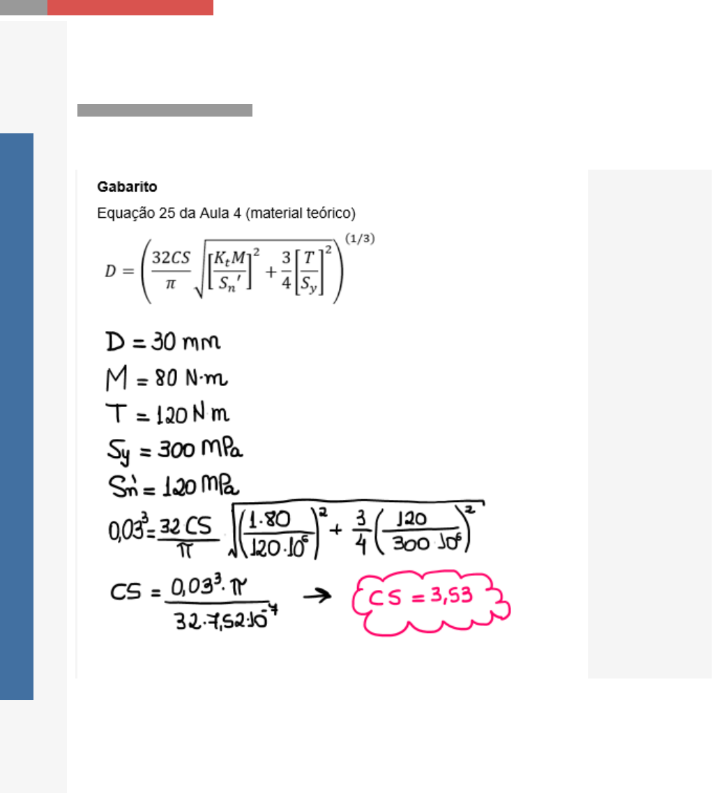 <p>Questão 1/10 - Projeto de Componentes Mecânicos</p><p>A norma ANSI/ASME, para o projeto de eixos de transmissão, pressupõe a combinação</p><p>de torção constante e flexão alternada. Supondo um eixo de diâmetro 30 mm que deva</p><p>suportar um momento fletor alternado de 80 Nm conjuntamente com um torque</p><p>constante de 120 Nm, determinar o coeficiente de segurança de projeto (supor uma</p><p>tensão de escoamento de 300 MPa, um limite de fadiga de 120 MPa, e fator de</p><p>concentração de tensão de 1:</p><p>(conteúdo da Aula 4 temas 4)</p><p>Nota: 0.0Você não pontuou essa questão</p><p>A 2,98</p><p>B 3,25</p><p>Você assinalou essa alternativa (B)</p><p>C 3,53</p><p>D 3,96</p><p>E 4,34</p><p>Questão 2/10 - Projeto de Componentes Mecânicos</p><p>Chavetas são componentes mecânicos que permitem a fixação de polias, engrenagens</p><p>ou rodas dentadas em relação aos seus respectivos eixos de transmissão permitindo</p><p>assim a transmissão de potência e consequentemente de torque entre tais</p><p>componentes. Para uma chaveta com tensão admissível ao cisalhamento de 100 MPa</p><p>que deva transmitir um torque de 180 Nm, determine o comprimento mínimo necessário</p><p>para a mesma, considerando a condição da solicitação de cisalhamento apenas e</p><p>supondo: um diâmetro de eixo de 50 mm e uma largura de chaveta de 15 mm.</p><p>(conteúdo da Aula 4 tema 1)</p><p>Nota: 10.0</p><p>A 4,5 mm</p><p>B 4,8 mm</p><p>Você assinalou essa alternativa (B)</p><p>Você acertou!</p><p>C 5,1 mm</p><p>D 5,6 mm</p><p>E 6,2 mm</p><p>Questão 3/10 - Projeto de Componentes Mecânicos</p><p>Um eixo circular de diâmetro 20 mm é submetido, simultaneamente, a um torque de 300</p><p>N.m e a um momento fletor de 600 N.m. Qual é a tensão principal máxima</p><p>correspondente?</p><p>Nota: 10.0</p><p>A 741,7 MPa</p><p>B 773,8 MPa</p><p>C 809,4 MPa</p><p>Você assinalou essa alternativa (C)</p><p>Você acertou!</p><p>D 835,6 MPa</p><p>E 882,5 MPa</p><p>Questão 4/10 - Projeto de Componentes Mecânicos</p><p>Um mancal radial hidrodinâmico com diâmetro 40 mm deve suportar uma carga</p><p>projetada de 3,2 MPa numa rotação de 720 rpm. Sabendo-se que a viscosidade do</p><p>lubrificante adotado vale 0,03 Pa.s, calcule a energia dissipada no mancal (supor uma</p><p>relação l/d = 1 e uma folga radial de 0,02 mm).</p><p>(conteúdo da Aula 5 temas 1 e 2)</p><p>Nota: 0.0Você não pontuou essa questão</p><p>A 11,7 W</p><p>B 14,8 W</p><p>C 17,3 W</p><p>Você assinalou essa alternativa (C)</p><p>D 19,5 W</p><p>E 23,2 W</p><p>Questão 5/10 - Projeto de Componentes Mecânicos</p><p>A capacidade de carga dinâmica de um rolamento expressa a carga que permitirá ao</p><p>rolamento atingir 1 milhão de revoluções podendo, porém, variar de fabricante para</p><p>fabricante. Para um rolamento rígido de esferas com capacidade de carga dinâmica</p><p>equivalente de 12000 N, pode-se afirmar que a expectativa de vida (em horas de</p><p>funcionamento) será de…? Supor que o rolamento venha a trabalhar numa rotação de</p><p>500 rpm, suportando uma carga radial de 3000 N.</p><p>(conteúdo da Aula 5 tema 4)</p><p>Nota: 10.0</p><p>A 1639 horas</p><p>B 1850 horas</p><p>C 2133 horas</p><p>Você assinalou essa alternativa (C)</p><p>Você acertou!</p><p>D 2328 horas</p><p>E 2511 horas</p><p>Questão 6/10 - Projeto de Componentes Mecânicos</p><p>Mancais de deslizamento são componentes mecânicos utilizados para dar sustentação</p><p>a eixos de transmissão em geral. A partir do número de Sommerfeld, torna-se possível</p><p>obter parâmetros de projeto destes dispositivos a partir da consulta às chamadas cartas</p><p>de Sommerfeld. Para um mancal radial que venha a trabalhar numa rotação de 300</p><p>rpm, quando submetido a uma carga projetada de 1,5 MPa, obtém-se um número de</p><p>Sommerfeld de 0,05. Determine a viscosidade do lubrificante utilizado nessa operação.</p><p>O número de Sommerfeld corresponde. Supor que mancal tenha um diâmetro de 40mm</p><p>e uma folga radial de 0,04 mm.</p><p>(conteúdo da Aula 5 tema 1)</p><p>Nota: 0.0Você não pontuou essa questão</p><p>A 0,03 Pa.s</p><p>B 0,04 Pa.s</p><p>C 0,05 Pa.s</p><p>Você assinalou essa alternativa (C)</p><p>D 0,06 Pa.s</p><p>E 0,07 Pa.s</p><p>Questão 7/10 - Projeto de Componentes Mecânicos</p><p>Chavetas são componentes mecânicos que permitem a fixação de polias, engrenagens</p><p>ou rodas dentadas em relação aos seus respectivos eixos de transmissão permitindo</p><p>assim a transmissão de potência e consequentemente de torque entre tais</p><p>componentes. Para uma chaveta com tensão admissível (tensão máxima) em</p><p>cisalhamento de 60 MPa e comprimento de 25 mm, determine o máximo torque a ser</p><p>transmitido pela mesma, considerando exclusivamente a condição de cisalhamento</p><p>sobre a mesma (supor um diâmetro de eixo de 40 mm e uma largura de chaveta de 10</p><p>mm).</p><p>(conteúdo da Aula 4 tema 1)</p><p>Nota: 10.0</p><p>A 300 N.m</p><p>Você assinalou essa alternativa (A)</p><p>Você acertou!</p><p>B 320,7 N.m</p><p>C 342,0 N.m</p><p>D 358,2 N.m</p><p>E 364,3 N.m</p><p>Questão 8/10 - Projeto de Componentes Mecânicos</p><p>Determinar o diâmetro mínimo necessário para que um eixo de transmissão transmita</p><p>com segurança um torque de 100 N.m simultaneamente a um carregamento de flexão</p><p>alternada de 300 N.m. Supor: uma tensão de escoamento de 250 MPa, um limite de</p><p>fadiga de 180 MPa, um coeficiente de segurança = 2 e fator de concentração de tensão</p><p>de 1,8.</p><p>(conteúdo da Aula 4 tema 4)</p><p>Nota: 0.0Você não pontuou essa questão</p><p>A 31,4 mm</p><p>B 35,3 mm</p><p>Você assinalou essa alternativa (B)</p><p>C 39,5 mm</p><p>D 43,2 mm</p><p>E 47,6 mm</p><p>Questão 9/10 - Projeto de Componentes Mecânicos</p><p>Uma chaveta paralela é utilizada num eixo de diâmetro 20 mm o qual deve transmitir</p><p>um torque de 72 N.m. Sabendo-se que a chaveta apr