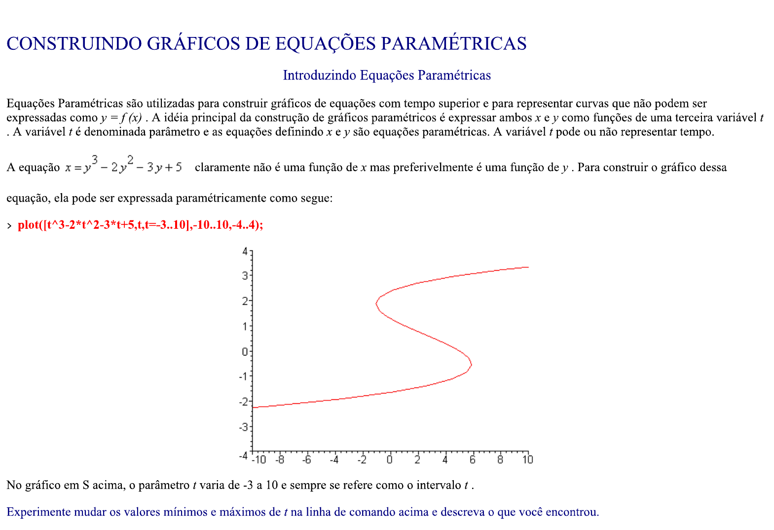 <p>CONSTRUINDO GRÁFICOS DE EQUAÇÕES PARAMÉTRICAS Introduzindo Equações Paramétricas Equações Paramétricas são utilizadas para construir gráficos de equações com tempo superior e para representar curvas que não podem ser expressadas como A idéia principal da construção de gráficos paramétricos é expressar ambos e y como funções de uma terceira variável t . A variável t é denominada parâmetro e as equações definindo e y são equações paramétricas. A variável t pode ou não representar tempo. A equação claramente não é uma função de x mas preferivelmente é uma função de Para construir o gráfico dessa equação, ela pode ser expressada paramétricamente como segue: > 4 3 2 1 0 -1 -2 -3 -4 -10 -8 -6 -4 -2 0 2 4 6 8 10 No gráfico em S acima, o parâmetro t varia de -3 a 10 e sempre se refere como o intervalo Experimente mudar os valores mínimos e máximos de t na linha de comando acima e descreva o que você encontrou.</p><p>R: Variando os valores de t , a curva pode ser modificada para aparecer como começa e parar pela demonstração da única parte ems. Construa o gráfico da seguinte equação paramétrica com t variando de -5 a 7, e descreva a forma descrita pela curva. - t + > 6 4 2 -4 -2 2 4 6 8 10 2 -4 -6 R: Forma . Para quais valores mínimo e máximo aproximados de t a curva pode ser definida por *10 acima no começo e no fim do eixo R: mínimo: - 4.45 máximo: 4.45 Construa o gráfico da seguinte equação paramétrica usando as coordenadas - com um intervalo de t -2.2 para 3 e identifique a letra Grega que é obtida 2 -</p><p>> 10 5 0 -5 -10 -15 -2 0 2 4 6 R: alfa Usando as equações abaixo e o intervalo t, , determine os ponto(s) onde a curva definida por intercepta ela "12=t2 > 8 6 4 2 0 -10 -5 0 5 10 R: (0,4)</p><p>Movimentos ao longo da curva podem ser modelados com equações paramétricas. Por exemplo, a posição da partícula no plano no tempo , onde t varia de -3 a 3 pode ser descrita por equações paramétricas tal como vemos abaixo: > 15 10 5 -2-1 1 2 3 -5 A partícula é posicionada em (0, 0) quando e em (1, 4) quando Podemos modificar o t direto na linha de comando do Maple. Modifique o gráfico de para ilustrar um tempo de começo de t = 0 segundos e tempo final de 4 segundos modificando a linha de comando vista anteriormente. > 15 10 5 -1 1 2 3 -5 R: (2,16)</p><p>Examine a curva definida pela equação paramétrica abaixo e determine o tempo no qual a curva alcança valor máximo. > 8 6 2 -10 -5 5 10 15 Investigando Formas Alternativas de Equações Paramétricas Considere os gráficos de duas diferentes equações parametricamente definidas. ></p><p>10 8 6 4 2 0 0 2 4 6 8 b) > 10 8 6 4 2 0 2 4 6 8 O que você observa sobre os gráficos dessas duas equações parametricamente definidas ? R: Os gráficos são idênticos. Construa o gráfico dos dois pares das seguintes equações paramétricas usando as coordenadas com t variando a 3 e descreva o que você encontrou.</p><p>> 1 -1 -1 -2 -3 -4 R: O é uma abre a direita com vértices em gráfico parábola que para b) > 1 2 -1 -2 -3 -4 R: O é uma abre a direita com vértices em gráfico parábola que para O gráfico é idêntico ao gráfico na parte (a).</p><p>Representações Paramétricas de uma curva não única. Lá estão infinitamente várias Representações Paramétricas de uma dada curva. Considere o seguinte gráfico de equações paramétricas. 2 > 2 0 -2 -4 -5 1 Usando as mesmas coordenadas, crie uma diferente representação paramétrica para o gráfico acima inserindo suas equações 2 ></p><p>2 0 -2 -4 1 R: Uma das várias respostas Considere a seguinte forma S no gráfico definida parametricamente. > 2 1 0 -1 -2 -3 -5 0 5 10 Crie uma diferente representação paramétrica para a forma S do gráfico acima inserindo suas equações nos x6</p><p>> 2 1 0 -1 -2 -3 -5 0 5 10 R: Uma das respostas certas Aprofundando seus conhecimentos Construa o gráfico da curva no intervalo [-18,25] e [-15, 10] onde t varie de -2.5 a 2.5 e determine como a curva atravessa ela mesma várias vezes. > 10 5 0 -5 -10 -15</p><p>R: 5 vezes. Determine as equações paramétricas que descrevem a curva que atravessa ela mesma mais vezes que a curva definida por e identifique o número de cortes. 1 > 15 10 5 -10 10 20 5 R: Uma das várias respostas corretas é: Número de cortes: 7 VOLTAR</p>