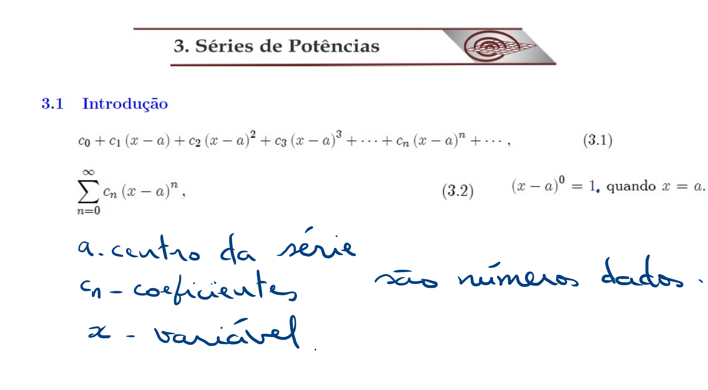 <p>3. Séries de Potências 3.1 Introdução - + C3 + (x - , (3.1) - (3.2) = 1. quando = a. n=0 a. centro da serie coeficientes sao x variavel</p><p>1 Para que de x a (3.1) convergente? Note que a serie sempre converge Seja = definida too D={ / n converge 2 Qual i a entre cientes e 3 b continua ! ? ?</p><p>Exemplo 3.1.1 Para qualquer valor que se atribua a a série de potências converge n=0 absolutamente. De fato, O termo geral da série é an de modo que 1 an n! = e sendo L < 1 independentemente do valor real x, Critério da Razão assegura a convergência absoluta da série. Assim, podemos definir uma função real f : R R por: (3.6) n! termo a termo, too n! = N = ex</p><p>=D = = constante y y S4 S3 x Fig. 3.1(a) Fig. 3.1(b)</p><p>Exemplo 3.1.2 Se na série de a variável x for substituída por , obteremos: n=0 para qualquer valor de t, e integrando (3.9) de 0 até 1, termo a termo, resultará: 0</p><p>Exemplo 3.1.4 Serie geometrica 8 g(x) n=0 para |x| <1. (-1,1) Dan = x -x, n = para Trocando x per = para</p><p>termo a para t dx = 2 x dt 2n S 1 1 + " (- 2n+1 arctgt 2n+1 t 2n+1 n=0 para</p><p>t , too = = (1)" 2n+1 4 = 1 - 3 1 5 - +</p><p>Exemplo 3.1.5 = para - n=0 3n+1 1 1 . 1+x 3+(x-2) 3 1 + ( 3 to = 3 3 to 1 = 1 x x</p><p>Assim t S 1 dx = 2 n=o 3n+1 2 too 2 3n+1 =D ln3+ too W 5-11" n=</p><p>Exemplo 3.1.6 para n=0 n+1 1 = 2 t n=0 Integrando de 1 ati o<t<2 = too n=0 1 lnx = 2 n=0 n+1</p><p>3.2 Intervalo de Convergência (a - - ou - n=0 x-a > R x-a<R x-a > R divergência convergência absoluta divergência a-R a+ R a Fig. 3.2</p><p>série raio de convergência intervalo de convergência = R = 8 (-00,00) n=0 n! R= 0 {0} n=0 1 = xn R= 1 (- 1,1) n=0 1 00 = 1 (-1,1) n=0 arctg R= 1 [-1, 1] n=0 2n + 1</p><p>Teorema 3.2.1 Se uma série de potências E convergir em algum valor # a, então n=0 ela convergirá absolutamente em qualquer ponto do intervalo Se ela divergir em = então ela será divergente quando R x a x x Prova: Suponha que seja particular E, existe tal para todo</p><p>Seja x que <1 < too Como i geometrica n= de logo convergente. que e</p><p>se a e 1x - a serie pode pelo caso a serie devenia converger X1</p><p>Teorema 3.2.3 Com relação à série de potências E , apenas uma das situações n=0 abaixo ocorre: (a) ou a série converge apenas quando = a; (b) ou a série converge absolutamente para qualquer valor que se atribua a x; (c) ou existe um número real R>0, denominado raio de convergência, tal que a série converge absolutamente quando x - <R e diverge quando - A= now new que acontace caso, to tal que pelo Teo anterior</p><p>A e limitado superiorment 1x1-al. Seja se existe to tal que e convergente Teo anterior, absolutamente convergente n=0 Isso</p><p>n=0 R- de convergencia R pode ser diverge converge diverge a-R a a+R de convergencia i um for intervalor [a-R, a (a-R, at RJ,</p><p>lim Cn+1 Teorema 3.2.4 Se l = e raio de convergência da série - Cn n=0 então: (a) 0 R=00 R= 0 e Aplicando too teste da para a serie an n=0 = him an = 1x-alk = l Cn</p><p>Se a too 2 converge E, se > I 1 a diverge converge diverge a- a at Logo (caso</p><p>n!(x - A n=0 10n n=0 (2n - 1) 32n-1 converge Cn= n! (-1)" (-9,9) a=5 K=1 pl x=+9. R= 10" = 2n-1 = (2n+1) 32n+1 him = too = 10 =D =</p><p>2 (-1)" n=0 9. too 2 =3.2 diverge 2n-2 2 =3.2 too converge n=0 Ic: n=0 2n-1</p><p>4nx2n n=1 l= = lim =4.1 cn (n+1)2 4" 1 2 diverge converge diverge -1/2 . = n=1 n2 Ic = 2</p><p>3.3 Derivação e Integração Teorema 3.3.1 (Derivação Termo a Termo) Se a série Cn tem raio de convergên- cia então a série obtida por derivação termo a termo, tem raio de convergência R, a função f (x) = Cn é derivável no intervalo (a - R, a + R) e neste intervalo = nen & = existe him = duas series raw</p><p>Teorema 3.3.2 (Integração Termo a Termo) Se uma série de potências = tem raio de convergência R>0, então para a - R, a série f n=0 dx, obtida por integração termo a termo, também tem raio de convergência R. Em particular, , (3.28)</p><p>de seno e senx x x7 3! 5! todo 2 + 2n x = 1 2! 4! Para todo 2 sen x = 2 2</p><p>?? Trocando serie de Cos2x = an (2n)! + - 26x6 2! 6! sen2x 11 2 2 ( 21 - t 4! 6! = 2.x2 4 + 2.1 4! 6.1 D</p><p>= 2 / n=1 (2n)! Como 2 = - 1 + 2 2 too x2n N=1 (2n)! tgx = seux tgx=</p><p>sen Exemplo 3.3.5 Estimando x # 0. senx = = 1 - Pelo Criterio de para - 1 2 31 < senx 31 lim (Limite</p><p>: Identifican a pela sine de (a) 2 n+1 para too (b) pana n=0 (a) 1 = = 1 = 1 = It 1-t</p><p>Como 1-t = - too 1 + ln(1-0)] n= n+1 ln(1-x) = - flx) (b) 2 too = n=0 n=0</p><p>Mas = e n=0 = (x 1 " = (1+x) = g(x) (1+x) g(x) = 1</p><p>3.4A Falso ou Verdadeiro? Justifique. (a) se é convergente, então é absolutamente convergente no intervalo [-1,1]; n=0 n=0 (b) se uma série de potências é absolutamente convergente em um dos extremos de seu intervalo de convergência, então ela também converge absolutamente no outro extremo; (c) se uma série de potências converge em um extremo de seu intervalo de convergência e diverge no outro, então a convergência naquele extremo é condicional; (d) se R é raio de convergência de então VR é raio de convergência de n=0 n=0 (e) se lim n = 0, então a série tem raio de convergência 1/L; n=0 (f) se tem raio de convergência R > então R também é O raio de convergência n=0 8 das séries nen e n=1</p><p>to (a) convergente i conver. gente todo 1 [-1, 1]. =P 1 1n = 1 1 =D n=0 too too e convergente n=0 n=0 convergente</p><p>(b) se uma série de potências é absolutamente convergente em um dos extremos de seu intervalo de convergência, então ela também converge absolutamente outro extremo; no a-R a a+R ACO Pl a-R, E, = = n=0</p><p>3.4B Em cada caso determine intervalo de convergência da série de potências: x2n+1 (a) (b) (2n (c) 2.4.6 (2n) (d) (e) 32n-1 (f) n=1 (g) (h) (i) n=1 2nx2n (j) (k) (2n)! (m) (n) (o) 3n-2 (p) arctgn (q) (r) n=1 n=1 n=1 n2 (e) cn n k = 2 32n l= him 32n+1 n 32</p><p>a serie converge para todo (a-R, at - / a too 32n = n=1 32n-1 n=1 a serie 2 