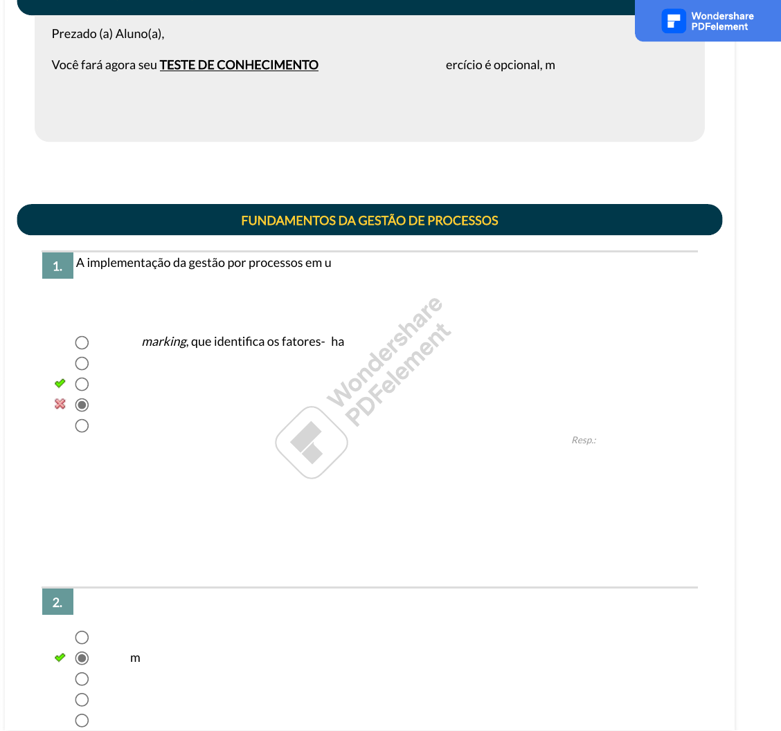 <p>Teste de</p><p>Conhecimento</p><p>avalie sua aprendizagem</p><p>A implementação da gestão por processos em uma organização contempla a identi�cação, a gestão, o</p><p>monitoramento e a melhoria dos processos, entendido processo como um conjunto de atividades inter-</p><p>relacionadas que transforma insumos (entradas) em produtos (saídas). Entre as ferramentas que fazem parte dessa</p><p>metodologia, pode-se citar:</p><p>As tarefas para gerenciar os processos no dia a dia estão associadas a diversas atividades, com exceção de:</p><p>MODELAGEM DE PROCESSOS</p><p>Lupa</p><p>DGT0015_202211167621_TEMAS</p><p>Aluno: MILCA VIANA DA SILVA Matr.: 202211167621</p><p>Disc.: MODELAGEM DE PROCE 2023.1 EAD (GT) / EX</p><p>Prezado (a) Aluno(a),</p><p>Você fará agora seu TESTE DE CONHECIMENTO! Lembre-se que este exercício é opcional, mas não valerá ponto para</p><p>sua avaliação. O mesmo será composto de questões de múltipla escolha.</p><p>Após responde cada questão, você terá acesso ao gabarito comentado e/ou à explicação da mesma. Aproveite para se</p><p>familiarizar com este modelo de questões que será usado na sua AV e AVS.</p><p>FUNDAMENTOS DA GESTÃO DE PROCESSOS</p><p>1.</p><p>O benchmarking, que identi�ca os fatores-chave para o sucesso dos processos estratégicos.</p><p>O mapa estratégico, que aponta a cadeia de valor gerada pelo conjunto de processos da organização.</p><p>O �uxograma, utilizado no mapeamento dos processos da organização.</p><p>O Diagrama de Pareto, que identi�ca os pontos críticos de cada processo.</p><p>A matriz SWOT, que identi�ca os desa�os e as oportunidades da organização.</p><p>Data Resp.: 12/04/2023 10:28:57</p><p>Explicação:</p><p>A resposta correta é: O �uxograma, utilizado no mapeamento dos processos da organização.</p><p>2.</p><p>acompanhar a execução dos processos.</p><p>evitar mudanças ou ajustes de curto prazo.</p><p>implementar novos processos.</p><p>realizar ajustes quando for aplicável.</p><p>promover a realização dos processos.</p><p>javascript:voltar();</p><p>javascript:voltar();</p><p>javascript:diminui();</p><p>javascript:aumenta();</p><p>http://cbs.wondershare.com/go.php?pid=5484&m=db</p><p>O exemplo abaixo é referente a que tipo de ferramenta para tomada de decisão?</p><p>Uma arquitetura de software, trata da estrutura a ser usada nas diversas aplicações possíveis em uma organização,</p><p>ou seja, ela de�ne um vocabulário para os componentes e as restrições na maneira que devem ser combinados.</p><p>Essa é a de�nição de:</p><p>Data Resp.: 12/04/2023 10:30:12</p><p>Explicação:</p><p>A resposta correta é: evitar mudanças ou ajustes de curto prazo.</p><p>METODOLOGIAS DE GERENCIAMENTO DE PROCESSOS</p><p>3.</p><p>Diagrama de Ishikawa.</p><p>Histograma.</p><p>Grá�co de Pareto.</p><p>Grá�co de Gantt.</p><p>Fluxograma.</p><p>Data Resp.: 12/04/2023 10:31:09</p><p>Explicação:</p><p>A resposta correta é: Grá�co de Pareto.</p><p>4.</p><p>3TA</p><p>BPM</p><p>Web Service</p><p>http://cbs.wondershare.com/go.php?pid=5484&m=db</p><p>Pensar em estratégias de gerenciamento de risco de processo é essencial para as organizações. Assinale a</p><p>alternativa correta em relação ao risco:</p><p>As etapas para a implantação de um BPM seguem uma sequência, assinale a alternativa correta que representa</p><p>esta sequência:</p><p>SOA</p><p>BPMS</p><p>Data Resp.: 12/04/2023 10:34:43</p><p>Explicação:</p><p>A resposta correta é: SOA</p><p>IMPLEMENTAÇÃO E ACOMPANHAMENTO DA GESTÃO DE PROCESSOS</p><p>5.</p><p>O risco é entendido como sendo a probabilidade de um evento desejável acontecer.</p><p>Todo risco tem uma falha, mas nem toda falha é um risco.</p><p>O risco representa a certeza de que haverá falhas no processo.</p><p>O processo de gerenciamento de risco é entendido como a possibilidade de ter falhas.</p><p>O risco é entendido como sendo a possibilidade de um evento não desejável acontecer.</p><p>Data Resp.: 12/04/2023 10:36:38</p><p>Explicação:</p><p>O risco é entendido como a possibilidade de um evento não desejável acontecer, ou seja, a chance de ocorrer</p><p>uma falha. Ela pode ter consequências mais ou menos graves dependendo de seu grau de seriedade.</p><p>6.</p><p>Estratégia e Planejamento do Processo, Análise dos Processos de Negócio, Desenho e Modelagem dos</p><p>Processos de Negócio, Implantação do Processo, Controle e Monitoramento do Processo e Re�namento do</p><p>Processo.</p><p>Análise dos Processos de Negócio, Estratégia e Planejamento do Processo, Implantação do Processo,</p><p>Desenho e Modelagem dos Processos de Negócio, Re�namento do Processo e Controle e Monitoramento do</p><p>Processo.</p><p>Estratégia e Planejamento do Processo, Análise dos Processos de Negócio, Implantação do Processo,</p><p>Desenho e Modelagem dos Processos de Negócio, Re�namento do Processo e Controle e Monitoramento do</p><p>Processo.</p><p>Análise dos Processos de Negócio, Estratégia e Planejamento do Processo, Implantação do Processo,</p><p>Desenho e Modelagem dos Processos de Negócio, Controle e Monitoramento do Processo e Re�namento do</p><p>Processo.</p><p>Estratégia e Planejamento do Processo, Desenho e Modelagem dos Processos de Negócio, Análise dos</p><p>Processos de Negócio, Implantação do Processo, Re�namento do Processo e Controle e Monitoramento do</p><p>Processo.</p><p>Data Resp.: 12/04/2023 10:39:04</p><p>Explicação:</p><p>A resposta correta é: Estratégia e Planejamento do Processo, Análise dos Processos de Negócio, Desenho e</p><p>Modelagem dos Processos de Negócio, Implantação do Processo, Controle e Monitoramento do Processo e</p><p>Re�namento do Processo.</p><p>http://cbs.wondershare.com/go.php?pid=5484&m=db</p><p>Para se escolher os indicadores de desempenho, estes devem atender alguns critérios. Assinale a alternativa</p><p>errada:</p><p>Uma importante ferramenta para auxiliar as organi