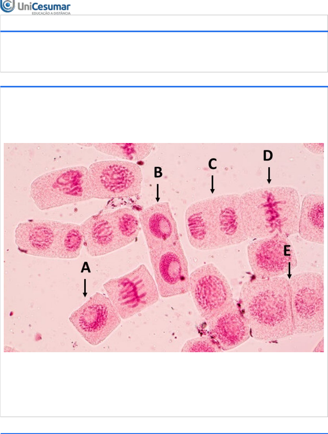 <p>ATIVIDADE 2 - EDU - BIOLOGIA E BIOQUÍMICA HUMANA - 53_2024</p><p>Período:26/08/2024 08:00 a 15/09/2024 23:59 (Horário de Brasília)</p><p>Status:ABERTO</p><p>Nota máxima:1,00</p><p>Gabarito:Gabarito será liberado no dia 16/09/2024 00:00 (Horário de Brasília)</p><p>Nota obtida:</p><p>1ª QUESTÃO</p><p>Durante uma aula de microscopia, em que estava-se estudando a divisão celular, você preparou uma lâmina</p><p>para observação da divisão celular mitótica. Como essa divisão possui as mesmas etapas em animais e</p><p>vegetais, o professor trouxe raiz de cebola para realizar a análise microscópica, pois esse material possui</p><p>melhor visualização.</p><p>A imagem encontrada por você no microscópio foi a seguinte:</p><p>Imagem: Mitose (adaptado). Fonte: https://brasilescola.uol.com.br/biologia/mitose.htm. Acesso em 31 jan.</p><p>2023.</p><p>Como parte da atividade, o professor pediu para que encontrassem a célula que apresenta a fase mitótica</p><p>da metáfase e descrevessem o processo. Dessa forma, assinale a alternativa correta sobre qual célula será</p><p>escolhida por você para dar continuidade à atividade.</p><p>ALTERNATIVAS</p><p>26/08/2024, 13:12 Unicesumar - Ensino a Distância</p><p>about:blank 1/8</p><p>A.</p><p>B.</p><p>C.</p><p>D.</p><p>E.</p><p>2ª QUESTÃO</p><p>Para que qualquer atividade possa ser realizada pelo nosso organismo, dependemos de energia oriunda de</p><p>reações bioquímicas. O metabolismo é o conjunto de reações químicas que acontece por meio da interação</p><p>entre as moléculas que o constituem, processo esse que controla recursos materiais e energéticos da célula.</p><p>Fonte: VARGAS, R. Biologia e Bioquímica Humana. Maringá: Unicesumar, 2022.</p><p>Sobre o metabolismo, avalie as afirmações a seguir:</p><p>I. Nas rotas catabólicas ocorre a decomposição de moléculas complexas, formando moléculas mais simples.</p><p>II. Nas rotas anabólicas ocorre a produção de moléculas complexas, sintetizadas a partir de moléculas mais</p><p>simples.</p><p>III. Reações bioquímicas endergônicas são aquelas em que ocorre liberação de energia livre e ocorrem</p><p>espontaneamente.</p><p>IV. Reações bioquímicas exergônicas são aquelas que absorvem energia livre, armazenando essa energia nas</p><p>moléculas e não são espontâneas.</p><p>É correto o que se afirma em:</p><p>ALTERNATIVAS</p><p>I e II, apenas.</p><p>III e IV, apenas.</p><p>I, II e III, apenas.</p><p>I, II e IV, apenas.</p><p>I, II, III e IV.</p><p>3ª QUESTÃO</p><p>A membrana plasmática é uma estrutura semipermeável, responsável pelo transporte e seleção de</p><p>substâncias que entram e saem da célula. Por isso ela é de extrema importância para o metabolismo celular.</p><p>Disponível em: < https://www.todamateria.com.br/membrana-plasmatica/>. Acesso em 30 jan. 2023.</p><p>Sobre o tema abordado no texto anterior, avalie as asserções a seguir e a relação proposta entre elas.</p><p>I. O transporte passivo é aquele em que há consumo de energia (ATP).</p><p>PORQUE</p><p>II. Para uma molécula (soluto) ser transportada contra seu gradiente de concentração, há gasto de energia</p><p>(ATP).</p><p>A respeito dessas asserções, assinale a opção correta.</p><p>26/08/2024, 13:12 Unicesumar - Ensino a Distância</p><p>about:blank 2/8</p><p>wilian.mahl</p><p>Realce</p><p>wilian.mahl</p><p>Realce</p><p>ALTERNATIVAS</p><p>As asserções I e II são proposições verdadeiras, e a II é uma justificativa correta da I.</p><p>As asserções I e II são proposições verdadeiras, mas a II não é uma justificativa correta da I.</p><p>A asserção I é uma proposição verdadeira, e a II é uma proposição falsa.</p><p>A asserção I é uma proposição falsa, e a II é uma proposição verdadeira.</p><p>As asserções I e II são proposições falsas.</p><p>4ª QUESTÃO</p><p>Todo indivíduo humano apresenta, em seu DNA, uma combinação de informações genéticas oriundas de</p><p>seus antecessores. Contudo, quando este indivíduo gerar novos descendentes, estes possuirão uma</p><p>sequência genética diferente de seu progenitor. Isso acontece porque durante a meiose (formação de</p><p>gametas), especificamente na prófase I da meiose I, ocorre um processo que promove a fusão e troca de</p><p>conteúdo entre os cromossomos homólogos.</p><p>Fonte: VARGAS, R. Biologia e Bioquímica Humana. Maringá: Unicesumar, 2022.</p><p>Assinale a alternativa que indica corretamente o nome dado a esse processo:</p><p>ALTERNATIVAS</p><p>Citocinese.</p><p>Crossing over.</p><p>Paquíteno.</p><p>Diplóteno.</p><p>Mitose.</p><p>5ª QUESTÃO</p><p>26/08/2024, 13:12 Unicesumar - Ensino a Distância</p><p>about:blank 3/8</p><p>wilian.mahl</p><p>Realce</p><p>wilian.mahl</p><p>Realce</p><p>O sistema endomembranas (endo- = "dentro") é um grupo de membranas e organelas das células</p><p>eucarióticas que trabalham em conjunto para modificar, empacotar e transportar lipídios e proteínas. Ele</p><p>inclui uma variedade de organelas</p><p>Fonte: https://pt.khanacademy.org/science/ap-biology/cell-structure-and-function/cell-</p><p>compartmentalization-and-its-origins/a/the-endomembrane-system. Acesso em 30 jan. 2023.</p><p>Abaixo está uma imagem que representa as estruturas do sistema de endomembranas.</p><p>Fonte: < https://commons.wikimedia.org/wiki/File:Endomembrane_system_diagram_pt.svg>. Acesso em 30</p><p>jan. 2023.</p><p>De acordo com o sistema e imagem descritos anteriormente, a seguir, avalie as situações propostas e</p><p>assinale (V) para verdadeiro e (F) para falso:</p><p>I. O retículo endoplasmático é encontrado em duas formas, o liso e o rugoso. O primeiro está relacionado</p><p>com a síntese de proteínas e o segundo com a síntese de lipídios, especialmente os fosfolipídios</p><p>encontrados nas membranas plasmáticas.</p><p>II. O retículo endoplasmático liso possui enzimas oxidativas que permitem a detoxificação celular,</p><p>envo