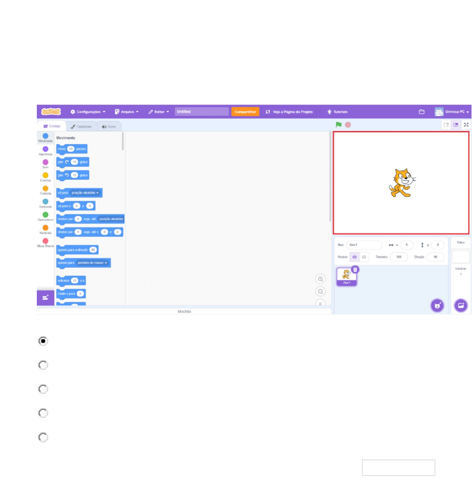 <p>PENSAMENTO COMPUTACIONAL</p><p>ATIVIDADE AVALIATIVA SEMANA 3</p><p>PERGUNTA 1</p><p>1. Para que serve a parte demarcada com o retângulo vermelho na imagem abaixo?</p><p>a.</p><p>Ver a execução.</p><p>b.</p><p>Incluir, excluir ou editar atores.</p><p>c.</p><p>Selecionar um comando.</p><p>d.</p><p>Selecionar um tipo de comando.</p><p>e.</p><p>Montar o programa.</p><p>1,43 pontos</p><p>PERGUNTA 2</p><p>1. Para que serve a parte demarcada com o retângulo vermelho na imagem abaixo?</p><p>a.</p><p>Selecionar um tipo de comando.</p><p>b.</p><p>Selecionar um comando.</p><p>c.</p><p>Incluir, excluir ou editar atores.</p><p>d.</p><p>Ver a execução.</p><p>e.</p><p>Montar o programa.</p><p>1,43 pontos</p><p>PERGUNTA 3</p><p>1. Para que serve a parte demarcada com o retângulo vermelho na imagem abaixo?</p><p>a.</p><p>Ver a execução.</p><p>b.</p><p>Selecionar um comando.</p><p>c.</p><p>Montar o programa.</p><p>d.</p><p>Selecionar um tipo de comando.</p><p>e.</p><p>Incluir, excluir ou editar atores.</p><p>1,43 pontos</p><p>PERGUNTA 4</p><p>1. Para que serve a parte demarcada com o retângulo vermelho na imagem abaixo?</p><p>a.</p><p>Selecionar um comando.</p><p>b.</p><p>Selecionar um tipo de comando.</p><p>c.</p><p>Ver a execução.</p><p>d.</p><p>Incluir, excluir ou editar atores.</p><p>e.</p><p>Montar o programa.</p><p>1,43 pontos</p><p>PERGUNTA 5</p><p>1. O que o programa abaixo faz quando se clica na bandeira verde?</p><p>a.</p><p>O ator, normalmente o gato, vai andar, esperar e voltar a andar, até que alguém pare o programa.</p><p>b.</p><p>O ator, normalmente o gato, vai andar 30 passos, esperar 1 segundo e depois andar mais 10 passos.</p><p>c.</p><p>O programa não vai rodar, pois tem um erro grave que o impede de funcionar.</p><p>d.</p><p>O ator, normalmente o gato, vai andar 40 passos e, depois, esperar 1 segundo.</p><p>e.</p><p>O cenário do palco vai se deslocar para o lado direito.</p><p>1,43 pontos</p><p>PERGUNTA 6</p><p>1. Para que serve a parte demarcada com o retângulo vermelho na imagem abaixo?</p><p>a.</p><p>Selecionar um tipo de comando.</p><p>b.</p><p>Ver a execução.</p><p>c.</p><p>Selecionar um comando.</p><p>d.</p><p>Montar o programa.</p><p>e.</p><p>Incluir, excluir ou editar atores.</p><p>1,43 pontos</p><p>PERGUNTA 7</p><p>1. O ator sempre inicia apontado para uma certa direção. Se pedirmos para ele se mover, ele se moverá para essa direção. Qual comando faz o ator apontar para uma direção diferente e começar a se mover para uma direção diferente?</p><p>a.</p><p>Deslize.</p><p>b.</p><p>Adicione.</p><p>c.</p><p>Mova.</p><p>d.</p><p>Gire.</p><p>e.</p><p>Vá para X Y.</p><p>1,42 pontos</p><p>image4.png</p><p>image5.png</p><p>image6.png</p><p>image7.png</p><p>image8.png</p><p>image1.png</p><p>image2.wmf</p><p>image3.wmf</p>