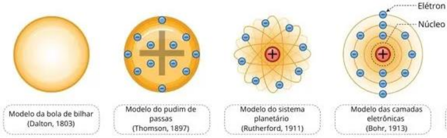 <p>EVOLUÇÃO DOS MODELOS ATÔMICOS</p><p>O átomo é a unidade fundamental da matéria e a menor fração capaz de</p><p>identificar um elemento químico, pois detém sua identidade. O termo átomo</p><p>deriva do grego e significa indivisível. A evolução dos modelos atômicos ocorreu</p><p>por meio do avanço tecnológico e de experimentos realizados por alguns</p><p>cientistas, tais como Dalton, Thomson, Rutherford e Bohr.</p><p>Figura 1 – Exemplos para os modelos atômicos com o decorrer dos anos</p><p>Visto que não é possível visualizar um átomo isoladamente, os cientistas,</p><p>com o passar do tempo, criaram modelos atômicos, ou seja, imagens que</p><p>servem para explicar a constituição, propriedades e comportamento dos átomos.</p><p>Esses modelos explicam o que diz a teoria, mas isso não quer dizer que</p><p>fisicamente o átomo seja igual ao seu modelo.</p><p>Os primeiros que imaginaram a existência dos átomos foram os filósofos</p><p>gregos Leucipo e Demócrito em, aproximadamente, 450 a.C. Segundo eles, tudo</p><p>seria formado por minúsculas partículas indivisíveis. Daí a origem do nome</p><p>“átomo”, que vem do grego a (não) e tomo (partes). No entanto, essas ideias não</p><p>puderam ser comprovadas na época, constituindo-se apenas como hipóteses.</p><p>Assim, outras teorias tomaram o seu lugar, e o pensamento de que tudo seria</p><p>composto por átomos ficou esquecido durante uma boa parte da história da</p><p>humanidade.</p><p>Mas, no século XIX, alguns cientistas passaram a realizar testes</p><p>experimentais cada vez mais precisos graças aos avanços tecnológicos. Com</p><p>isso, não só se descobriu que tudo era realmente formado por minúsculas</p><p>partículas, mas também foi possível entender cada vez mais sobre a estrutura</p><p>atômica.</p><p>Os cientistas usaram as informações descobertas por outros estudiosos</p><p>para desenvolver o modelo atômico. Dessa forma, as descobertas de um</p><p>cientista eram substituídas pelas de outros. Os conceitos que estavam corretos</p><p>permaneciam, mas os que comprovadamente não eram reais passavam a ser</p><p>abandonados. Assim, novos modelos atômicos foram criados. Essa série de</p><p>descobertas da estrutura atômica até se chegar aos modelos aceitos hoje ficou</p><p>conhecida como a evolução do modelo atômico. São quatro as principais teorias</p><p>atômicas estudadas nessa evolução, que serão apresentadas a seguir.</p><p>Modelo Atômico de Dalton</p><p>Em 1803, Dalton retomou as ideias de Leucipo e Demócrito e propôs o</p><p>seguinte:</p><p>“A matéria é formada por átomos, que são partículas minúsculas,</p><p>maciças, esféricas e indivisíveis.”</p><p>O modelo atômico de Dalton foi a primeira teoria proposta para tentar</p><p>explicar a construção da matéria e foi desenvolvida por John Dalton em 1808.</p><p>Esse modelo supõe que o átomo é uma esfera maciça, homogênea, indivisível</p><p>e indestrutível e, por isso, é também conhecido como modelo da “bola de sinuca”.</p><p>Figura 2 – Modelo atômico de Dalton</p><p>Dalton determinou alguns princípios que explicavam a matéria e seus</p><p>fenômenos, baseado na ideia de que o átomo é uma esfera indivisível:</p><p>• A matéria é formada por pequenas partículas que não se dividem, os</p><p>átomos.</p><p>• Os átomos de um mesmo elemento químico são idênticos.</p><p>• Os átomos de elementos químicos diferentes possuem propriedades</p><p>físicas e químicas distintas.</p><p>• Átomos não são criados ou destruídos.</p><p>• Um elemento é definido pelo peso do seu átomo.</p><p>• Ao formar substâncias, os átomos não se alteram.</p><p>• Uma reação química ocorre mediante a simples reorganização dos</p><p>átomos, os quais mantêm a sua identidade.</p><p>Modelo Atômico de Thomson</p><p>O modelo atômico proposto por Joseph John Thomson, em 1898, afirma</p><p>que o átomo possui natureza elétrica, é divisível e formado por partículas</p><p>subatômicas. Thomson descobriu a existência de partículas carregadas</p><p>negativamente (elétrons) no átomo, derrubando o conceito de Dalton, que</p><p>afirmava que o átomo seria indivisível.</p><p>Por meio de experimentos, Thomson construiu uma nova teoria atômica,</p><p>na qual defendeu a existência de cargas elétricas negativas presas a um núcleo,</p><p>com carga elétrica positiva. Devido a essa estrutura, esse modelo atômico é</p><p>conhecido como modelo do “pudim de passas”."</p><p>Figura 3 – Modelo atômico de Thomson</p><p>Modelo atômico de Rutherford</p><p>Ernest Rutherford propôs um novo modelo atômico em 1911, no qual</p><p>afirma que o átomo é formado por uma região central de massa elevada e com</p><p>caráter elétrico positivo. Em torno dele, há uma região de massa desprezível em</p><p>que orbitam os elétrons (partículas de carga negativa).</p><p>Em razão dessa configuração, o átomo de Rutherford é comparado ao</p><p>Sistema Solar, assumindo o núcleo como o Sol e os elétrons como os planetas,</p><p>e conhecido como modelo do sistema planetário.</p><p>Figura 4 – Modelo atômico de Rutherford</p><p>Nesse modelo, o átomo é formado por duas principais regiões: o núcleo e</p><p>a eletrosfera. O núcleo é a região central do átomo. Apresenta alta massa e alta</p><p>densidade por concentrar as partículas de carga elétrica positiva (prótons) em</p><p>um pequeno volume.</p><p>A eletrosfera é a região em torno do núcleo que abriga os elétrons. Como</p><p>os elétrons são partículas minúsculas, assume-se que a eletrosfera é formada</p><p>por extensos espaços vazios, por isso possui baixa densidade.</p><p>Modelo atômico de Bohr</p><p>O modelo atômico de Bohr, proposto por Niels Bohr em 1913, determina</p><p>que a eletrosfera é formada por camadas de energia nas quais se distribuem os</p><p>elétrons.</p><p>Esse modelo é conhecido também como modelo a