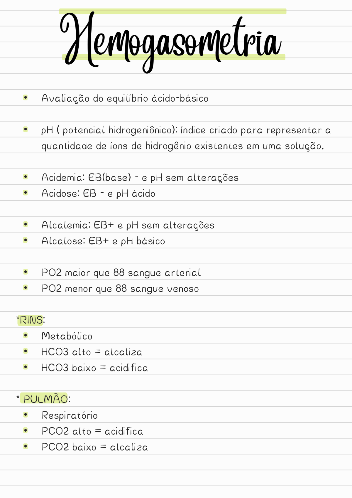 <p>Hemogasometria Avaliação do equilíbrio pH ( potencial índice criado para representar a quantidade de de hidrogênio existentes em uma Acidemia: EB(base) - e pH sem alterações Acidose: EB - e pH acido Alcalemia: EB+ e pH sem alterações Alcalose: EB+ e pH básico PO2 maior que 88 sangue arterial PO2 menor que 88 sangue venoso Metabólico HCO3 alto = alcaliza HCO3 baixo = acidifica PULMÃO: Respiratório PCO2 alto = acidifica PCO2 baixo = alcaliza</p><p>* Passo a passo: Olhar pH e a base 2. Quem está acido ou alcalino 3. Metabólico ou respiratório EXEMPLO pH= 7,25 (7,27 a 7,40) pCO2= 39,9 mmHg (32,7 a 44,7) HCO3= 17,1 mmol/L (18 a 24) EB= -9,32mmol/L (-3 a +3) pH está e base negativa = ACIDOSE pCO2 está normal HCO3 está baixo = acidifica o meio e indica METABÓLICO RESPOSTA: acidose metabólica EXEMPLO 02 pH= 7,10 (7,27 a 7,40) pCO2= 20 mmHg (32,7 a 44,7) HCO3= 15,0 mmol/L (18 a 24) EB= -4,0mmol/L (-3 a +3) pH ácido e base negativa = ACIDOSE quem está acidificando meio: HCO3 negativo = METABÓLICO pCO2 está baixo = Alcaliniza o meio RESPOSTA: acidose metabólica com tentativa de compensação</p><p>respirtória. EXEMPLO 03: pH= 7,21 (7,27 a 7,40) (32,7 a 44,7) HCO3= (18 a 24) EB= -6,0mmol/L (-3 a +3) pH e base negativa: ACIDOSE pCO2 alto: acidifica o meio HCO3 baixo: acidifica meio RESPOSTA: acidose mista, tanto pCO2 quanto HCO3 estão acidos EXEMPLO 04: pH= 7,40 (7,27 a 7,40) pCO2= 58 mmHg (32,7 a 44,7) HCO3= 34,0 mmol/L (18 a 24) EB= -3,0 mmol/L (-3 a +3) pH normal e base negativa pCO2 acidificando meio RESPOSTA: acidose respiratória compensada, como o pH voltou GO normal significa que compensou</p><p>* ACIDOSE METABÓLICA: aumento na produção de H+ de acido geração de outros retenção de H+ perda de bicarbonato - diarreira * ACIDOSE RESPIRATÓRIA: acúmulo de CO2 na corrente sanguínea obstrução pneumonia * ALCALOSE METABÓLICA: perda de H+ - dilatação do abomaso retenção de bicabornato ALCALOSE RESPIRATÓRIA: - anemias, doença cardiaca congestiva Co2 baixo DISTÚRBIOS ELETROLÍTICOS: ocorre quando paciente perde quantidade significativa de líquidos corporais, como suor excessivo, poliúria, vômitos e diarreia. FUNÇÕES DOS ELETRÓLITOS manter a pressão osmótica do plasma regular a distribuição de no organismo manutenção do pH ficiológico regular a função cardiaca e muscular participar das reações de óxido redução</p><p>participar como co-fatores enzimáticos Na+, K+, Ca+ e Mg+ Cl-, HCO3-, HPO4- DISTÚRBIOS Os eletrólitos devem ser considerados em conjunto visto que correto funcionamento da célula é necessário uma combinação específica de e cations GAP Valores superiores a 20mEq/L indicam a de acidose metabólica independent do pH e da de bicarbonato no plasma. equilíbrio entre as cargas positivas e negativas. Corresponde GO somatório de todos os plasmáaticos Avaliar sempre que tiver uma acidose metabólica aumentado Se na acidose metabólica o gap estiver aumentado tem que dosar lactato = usa muito em equinos Indica a de um ou mais anormais não medidos no plasma. Ocorre em cetoacidose diabética, intoxicações estado urêmico que fica em falta é substituído pelo lactato</p><p>hiperclorêmica Se na acidose metabólico gap estiver normal tem que dosar cloro, por que ele que causa o dessa carga e esta aumentado ja que ele é uma carga negativa gap normal cloro aumentado acidose metabólica hiperclorêmica Ocorre a perda de bicarbonato levando rim a reter cloro como uma forma de compensar perdas de cargas negativas. Ocorre em: distúrbios intestinais e acidose tubular renal.</p>