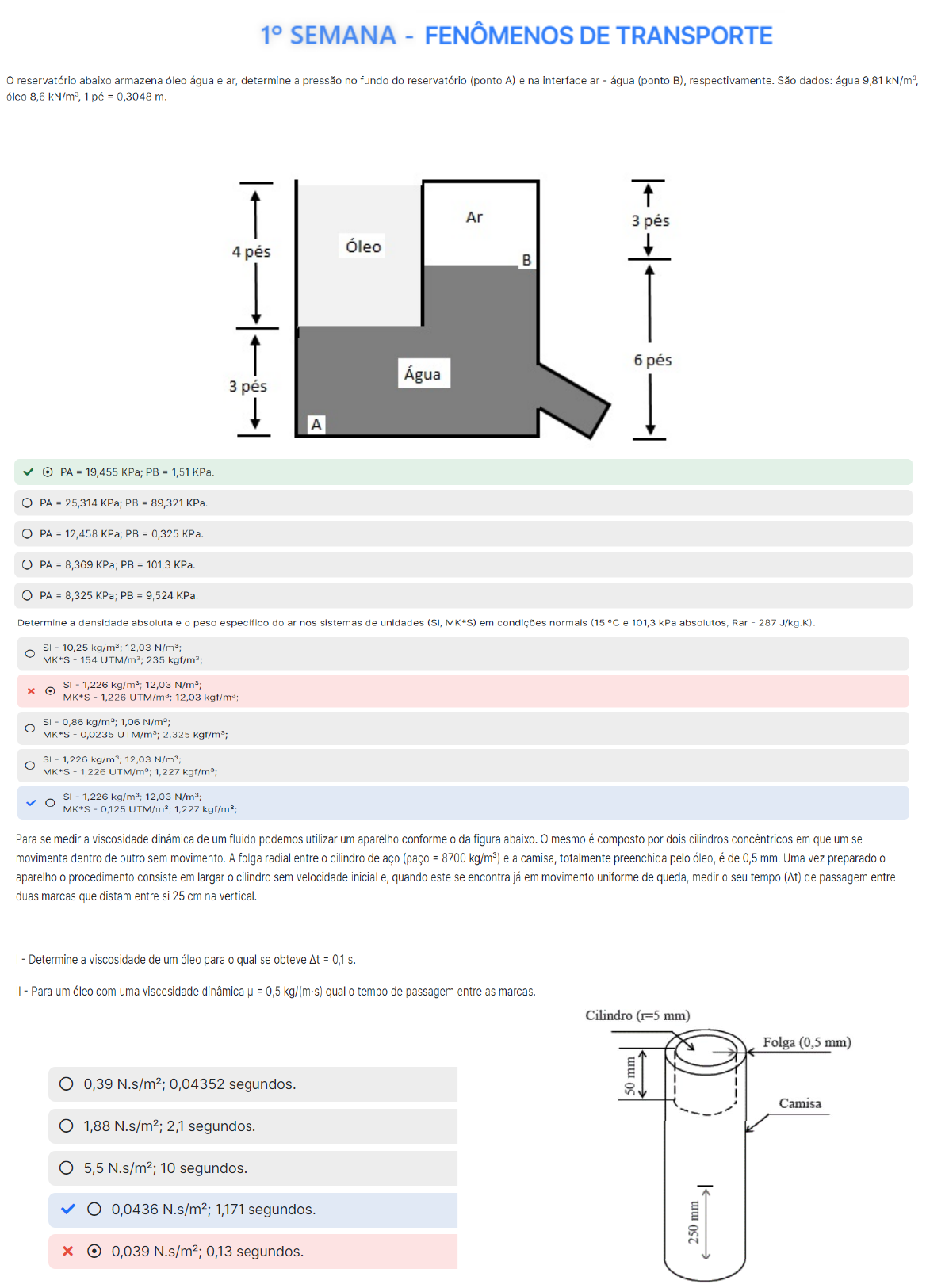 <p>1° SEMANA - FENÔMENOS DE TRANSPORTE o reservatório abaixo armazena óleo água e ar, determine a pressão no fundo do reservatório (ponto A) e na interface água (ponto B), respectivamente. São dados: água óleo 8,6 1 pé = 0,3048 m. An 3 pés 4 pés Óleo B 6 pés Água 3 pés A PA = 19,455 KPa; PB = 1,51 KPa. PA - 25,314 KPa; PB - 89,321 KPa. PA 12,458 KPa; PB 0,325 KPa. PA = 8,369 KPa; PB = 101,3 KPa. PA = 8,325 KPa; PB = 9,524 KPa. Determine a densidade absoluta e peso específico do nos sistemas de unidades (SI, MK*S) em condições normais (15 °C e 101,3 kPa absolutos, Rar 287 SI 10,25 12,03 MK*S 154 235 SI 1,226 12,03 MK*S 1,226 12,03 SI 0,86 1,06 MK*S 0,0235 2,325 SI 1,226 12,03 MK*S 1,226 1,227 SI 1,226 12,03 MK*S 0,125 1,227 Para se medir a viscosidade dinâmica de um fluido podemos utilizar um aparelho conforme da figura abaixo. mesmo é composto por dois cilindros concêntricos em que um se movimenta dentro de outro sem movimento. A folga radial entre cilindro de aço (paço = 8700 e a camisa, totalmente preenchida pelo óleo, é de 0,5 mm. Uma vez preparado aparelho 0 procedimento consiste em largar 0 cilindro sem velocidade inicial e, quando este se encontra já em movimento uniforme de queda, medir 0 seu tempo (At) de passagem entre duas marcas que distam entre si 25 cm na vertical. Determine a viscosidade de um óleo para qual se obteve At = 0,1 Para um óleo com uma viscosidade dinâmica = 0,5 kg/(m.s) qual 0 tempo de passagem entre as marcas. Cilindro (r=5 mm) Folga (0,5 mm) 0,39 0,04352 segundos. Camisa 1,88 2,1 segundos. 10 segundos. 0,0436 1,171 segundos. 0,039 0,13 segundos.</p><p>2° SEMANA Em um shopping de departamentos, duas correntes de água encontram se em um determinado ponto a primeira vazão é de 25 L / S e temperatura de 18 °C (alimentação de água fria), a segunda tem 25 / min e temperatura de (alimentação de água quente). Logo após a mistura (alimentação temperada), qual será a vazão da corrente de água em / S e a temperatura da água em K? = T 43,47 K. T = 43,47 K. Q = T = 316,47 K. = T = 500 K. Dado o dispositivo da figura, calcular a vazão do escoamento da água no conduto. Desprezar as perdas e considerar o diagrama de velocidades uniforme. Dados: yH20 = ym = 104 P2 = 20 kPa; A = 10-2 g = 10 Área A 3,80 m água 2 0,20 m Ym 55,32 3,25 80 L / S 60 . 40 L / Ao se levantar de manhã um estudante de engenharia ao escovar os dentes notou que a água 0,77 10-6 estava saindo a 32 °C da torneira com diâmetro de 1,5 cm, e a velocidade de escoamento estava a 2 m/s. Neste caso determine o número de Reynolds do escoamento observado por este estudante e determine se o escoamento é laminar ou turbulento. 58.968,21, regime laminar 1.25636, regime laminar 38.961,03, regime turbulento 890, regime laminar 38.961,03, regime laminar SEMANA Um sistema de irrigação utiliza uma bomba que faz a sucção em um reservatório (cota 0) uma taxa de 4 Caso o tubo tenha 6 polegadas de determine a potência em Hp necessária para a bomba (cota = 12 pés) fazer a sucção. Dados: perda de carga 0,4 pé/pé, comprimento total da tubulação 15 pés, peso específico da água 62,4 Considere 1 Hp = 550 pé 12 pol, g = 5,568 Hp 3,358 Hp 11,09 Hp 13,25 Hp 25,76 Hp</p><p>A figura abaixo indica um tubo para sucção de água. Na seção transversal (1), tem se: V1 = 4,5 A área da seção transversal (2) A2 = 6 Adotando g 10 calcular a pressão efetiva na seção (1). P1 1235 P1 4000 P1 986 kgt P1 3654 P1 8963 Uma mangueira de jardim tem diâmetro interno de 19 mm e está ligada a um irrigador de grama que consiste simplesmente de um recipiente que apresenta 24 furos de mm de diâmetro cada um. Se a água na mangueira possuir uma velocidade de 1 qual a velocidade de saída pelos furos? 9,325 0,95 15,23 13,25 5° SEMANA Uma indústria química bombeia água a um ponto 3,2 m acima da cota normal de A velocidade em A é igual a 0,9 m/s e a variação de pressão de A para B vale 98,1 se a bomba tem uma eficiência de 90% determine sua potência em CV. Dado: água 9810 Considere a perda de carga como sendo 1,5 m e CV 745 W. 150 mm 3,2 m 250 mm A Bomba 7,02 CV 5,31 CV 3,31 CV 6,15 CV Ng 9,09 CV Uma bomba faz a sucção de água em um reservatório (cota = 0) a uma taxa de 4 Caso o tubo tenha 6 polegadas de diâmetro, determine a altura manométrica da bomba (cota 12 pés) fazer a sucção. Dados: perda de carga 0,4 pé/pé, comprimento total da tubulação 15 pés, peso específico da água 62,4 Considere 1 Hp 550 1 pé 12 pol, g 32,2 Nota: a bomba está no mesmo nível da descarga. 36,66 pés 72,22 pés 45,55 pés 63,33 pés 24,44 pés</p><p>Uma indústria química bombeia água a um ponto 3.2 m acima da cota normal de bombeamento A velocidade em A igual 0,9 m/s e variação de pressão de A para B vale 98,1 se a bomba tem uma eficiência de 90% determine sua altura Dado: água 9810 Considere a perda de carga como sendo 15 m 150 mm 250 mm A Bomba 14,07 m 16,01 m 17,65 m 13,35 m 6° SEMANA A única alternativa verdadeira a respeito de sistemas de bombeamento é: No cálculo de perda de carga localizada deve-se considerar o comprimento total físico da a velocidade média do fluido e material das paredes da tubulação. Se a velocidade média do fluido dobrar a perda de carga será oito vezes maior. Uma bomba pode ser instalada em qualquer do reservatório desde que tenha potência suficiente para recalcar o fluido. o ábaco de Moody pode ser usado para diferentes diâmetros e materiais de tubulação e fornece o fator de atrito para cálculo da perda de carga. A energia necessária para um sistema de bombeamento deve ser a soma de todas parcelas de energia no estado final do fluido, subtraindo tanto as parcelas de energia do estado inicial quanto as perdas do Em uma indústria química, um grupo de engenheiros foi designado para projetar uma tubulação (AISI 304 W/m.K) para transporte de fluido refrigerante. o tubo deve ter um diâmetro interno de 36 mm e espessu