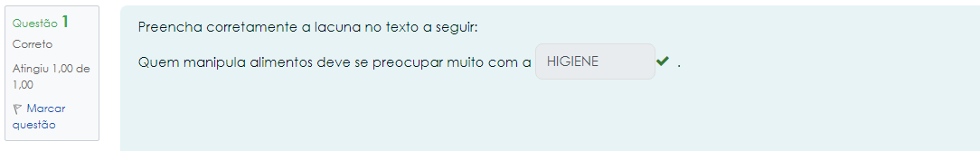 <p>Questão 1 Preencha corretamente a lacuna no texto a seguir: Correto Quem manipula alimentos deve se preocupar muito com a HIGIENE Atingiu 1,00 de 1,00 P Marcar questão</p>