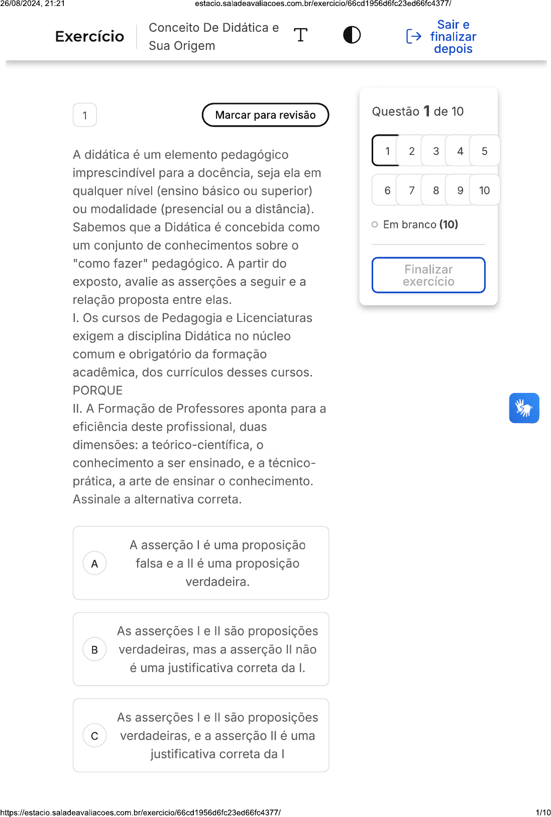 <p>26/08/2024, 21:21 Conceito De Didática e Sair e Exercício T finalizar Sua Origem depois 1 Marcar para revisão Questão 1 de 10 A didática é um elemento pedagógico 1 2 3 4 5 imprescindível para a docência, seja ela em qualquer nível (ensino básico ou superior) 6 7 8 9 10 ou modalidade (presencial ou a distância). Sabemos que a Didática é concebida como Em branco (10) um conjunto de conhecimentos sobre o "como fazer" pedagógico. A partir do Finalizar exposto, avalie as asserções a seguir e a exercício relação proposta entre elas. I. Os cursos de Pedagogia e Licenciaturas exigem a disciplina Didática no núcleo comum e obrigatório da formação acadêmica, dos currículos desses cursos. PORQUE II. A Formação de Professores aponta para a eficiência deste profissional, duas dimensões: a o conhecimento a ser ensinado, e a técnico- prática, a arte de ensinar o conhecimento. Assinale a alternativa correta. A asserção é uma proposição A falsa e a é uma proposição verdadeira. As asserções e são proposições B verdadeiras, mas a asserção não é uma justificativa correta da I. As asserções e II são proposições C verdadeiras, e a asserção é uma justificativa correta da https://estacio.saladeavaliacoes.com.br/exercicio/66cd1956d6fc23ed66fc4377/ 1/10</p><p>26/08/2024. 21:21 As asserções I e são proposições D falsas. A asserção I é uma proposição E verdadeira e a II é uma proposição falsa. 2 Marcar para revisão A Didática é um elemento pedagógico imprescindível para a docência, seja ela em qualquer nível da escolarização ou modalidade (presencial ou a distância). A professora Cecília, que trabalha na Educação Básica, reconhece que a Didática auxilia no processo de escolha de estratégias adequadas para a prática pedagógica e que muitos são os elementos e fatores que interferem numa boa prática educativa. Nesse sentido, a docente defende ainda a importância de que o professor conheça o Projeto Político Pedagógico da escola e ainda: Que elabore o planejamento semanal de acordo com a realidade A dos alunos e os recursos disponíveis na escola. Que é desnecessária a preocupação com a didática, B quando se trabalha na Educação Básica. 2/10</p><p>26/08/2024, 21:21 Que no Ensino Fundamental, o mais importante é apenas uma boa C avaliação da aprendizagem pautada numa pedagogia tradicional. Que é desnecessário um planejamento semanal se há um D bom projeto político pedagógico na escola. Que ao planejar, o professor trabalhe os conteúdos E exclusivamente do interesse das crianças. 3 Marcar para revisão Existe, especificamente, uma área do conhecimento que auxilia o professor a utilizar técnicas, metodologias e instrumentos para melhorar o desenvolvimento do processo de ensino- aprendizagem. Como se denomina esta área? A A avaliação. B perfil docente. C A didática. 3/10</p><p>26/08/2024, 21:21 D A legislação. E currículo. 4 Marcar para revisão Os Pilares da Educação que Jacques Delors propõe, apesar de estruturados muito posteriormente à proposição de Comenius, têm um fundamento norteador que a Didática continua compondo como fundamental. Essa proposição pode ser observada quando: Ensinar cada um segundo sua A classe. A Didática possibilita criar B estratégias para melhorar o ensino. A Pedagogia o campo C primordial do saber. A educação possibilita o aluno a D ser, ter sua cultura e o direito a ela. Há quatro pilares fundamentais da E aprendizagem. 5 Marcar para revisão 4/10</p><p>26/08/2024, 21:21 estacio.saladeavaliacoes.com.br/exercicio/66cd1956d6fc23ed66fc4377 De acordo com Comenius (1592 - 1670), "um método Universal de se ensinar tudo a todos" se aplica ao conceito de: A Educação B Ensino C Aprendizado D Didática E Pedagogia 6 Marcar para revisão Leia o texto, a seguir: Classicamente, a Didática é um campo de estudo, uma disciplina de natureza pedagógica aplicada, orientada para as finalidades educativas e comprometida com as questões concretas da docência, com as expectativas e os interesses dos alunos. Para tanto, requer um espaço teórico- prático, a fim de compreender a multidimensionalidade da docência, entendida como ensino em ato. Neste sentido, trazemos abaixo a definição de alguns autores sobre Didática? ALTHAUS, M. T. M; ZANON, D. P. Didática: questões de ensino. Ponta Grossa: Ed. UEPG/NUTEAD, 2009. p. 12-25 Marque a resposta correta: 5/10</p><p>26/08/2024, 21:21 objeto de estudo da didática é ensinar algo, sempre desafiando o A interlocutor a pensar sobre algo, ou seja, toda a didática apoia-se no conceito de ensino. objetivo da Didática é somente se preocupar com os processos de B ensino e aprendizagem em sua relação com as finalidades educacionais. objetivo da didática perpassa pelo crivo da sociedade civil, onde considera como uma prática C educacional em situações historicamente situadas significa examiná-lo nos contextos sociais nos quais se efetiva. objeto de estudo da didática é basicamente o elemento da D formação do professor, ou seja, regula, num sentido amplo, o comportamento de ser professor. objeto de estudo da didática é o processo de ensino-aprendizagem, ou seja, toda proposta didática está E impregnada, implícita ou explicitamente, de uma concepção do processo de ensino- aprendizagem. 7 Marcar para revisão 6/10</p><p>26/08/2024, 21:21 Segundo Comenius, a produção do conhecimento deve ser significativa para que o processo de ensino e aprendizagem aconteça de forma efetiva. Para que isso aconteça, na visão deste autor, é necessário: Utilizar conhecimentos, atitudes e A procedimentos de ensino de maneira articulada. For escolhida pelos responsáveis B da criança. Estabelecer superioridade do C conteúdo escolar e sobre o social. Cumprir todo o conteúdo D programático. E Se transformar em fonte de renda. 8 Marcar para revisão Adaptado de IF-RO 2013 Leia o texto, a seguir: Quando se fala de uma escola e