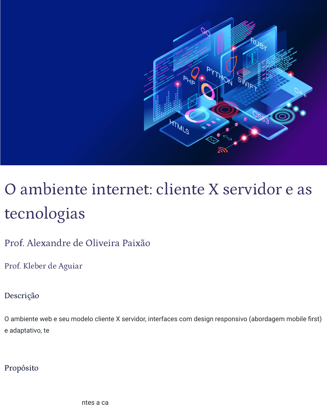 <p>O ambiente internet: cliente X servidor e as</p><p>tecnologias</p><p>Prof. Alexandre de Oliveira Paixão</p><p>Prof. Kleber de Aguiar</p><p>Descrição</p><p>O ambiente web e seu modelo cliente X servidor, interfaces com design responsivo (abordagem mobile first)</p><p>e adaptativo, tecnologias do lado cliente (HTML, CSS, páginas estáticas com JavaScript) e do lado servidor</p><p>(páginas dinâmicas com PHP, acesso a banco de dados).</p><p>Propósito</p><p>Compreender a composição do ambiente web e seus componentes dos lados cliente e servidor, assim</p><p>como as tecnologias inerentes a cada componente, é essencial para a formação do profissional de</p><p>desenvolvimento de sistemas na web.</p><p>Objetivos</p><p>Módulo 1</p><p>O ambiente web</p><p>Reconhecer o ambiente web.</p><p>Módulo 2</p><p>O conceito de interface</p><p>Descrever o conceito de interface.</p><p>Módulo 3</p><p>Tecnologias do lado cliente</p><p>Reconhecer as tecnologias do lado cliente.</p><p>Módulo 4</p><p>Tecnologias do lado servidor</p><p>Reconhecer as tecnologias do lado servidor.</p><p>Introdução</p><p>O chamado modelo cliente X servidor, com origem na computação, é uma estrutura de aplicação distribuída</p><p>em que temos tarefas partilhadas e executadas entre as duas camadas: de um lado, a origem das</p><p>requisições e solicitações de recursos ou serviços — o lado cliente — e, do outro, processos sendo</p><p>executados a fim de prover tais recursos ou serviços �� o lado servidor. Atualmente, tal modelo é</p><p>amplamente utilizado, sendo base do ambiente web e de suas aplicações.</p><p></p><p>1 - O ambiente web</p><p>Ao �nal deste módulo, você será capaz de reconhecer o ambiente web.</p><p>Modelo cliente X servidor</p><p>O modelo cliente X servidor foi criado pela Xerox PARC nos anos 1970, tendo como principal premissa a</p><p>separação entre dados e recursos de processamento, ao contrário do modelo predominante à época —</p><p>conhecido como modelo centralizado, em que tanto o armazenamento dos dados quanto o seu</p><p>processamento ficavam a cargo dos computadores de grande porte: mainframe.</p><p>Ambiente cliente X servidor</p><p>O ponto de partida para entendermos a arquitetura do modelo cliente X servidor é tomarmos como exemplo</p><p>a rede interna de computadores de uma empresa, em que temos máquinas exercendo a função de</p><p>servidores — provendo serviços como armazenamento de arquivos ou dados, impressão, e-mail etc. — e</p><p>máquinas exercendo a função de clientes — consumindo os recursos fornecidos pelos servidores. Essa</p><p>arquitetura pode ser vista na imagem a seguir.</p><p>Arquitetura cliente X servidor em uma rede interna.</p><p>Aplicações no modelo cliente X servidor</p><p>Esse modelo tornou possível o desenvolvimento de aplicações que fizessem uso de sua arquitetura</p><p>distribuída. Tais aplicações foram desenvolvidas tendo como base o conceito de desenvolvimento em</p><p>camadas. Logo, surgiram os modelos de duas, três e quatro (ou N) camadas.</p><p>Modelo de duas camadas</p><p>Nesse modelo, temos as camadas cliente e servidor, sendo função da primeira tratar a lógica do negócio e</p><p>fazer a interface com o usuário, enquanto a segunda é responsável por tratar os dados — normalmente</p><p>fazendo uso de sistemas gerenciadores de bancos de dados (SGDB). São exemplos desse modelo as</p><p>aplicações desktop instaladas em cada computador cliente que se comunicam com um servidor na mesma</p><p>rede. A imagem que segue exemplifica esse tipo de rede.</p><p>Modelo de duas camadas.</p><p>Modelo de três camadas</p><p>Esse modelo foi criado para resolver alguns problemas do modelo anterior, entre eles a necessidade de</p><p>reinstalação/atualização da aplicação nos clientes a cada mudança de regra ou lógica. Logo, foi incluída</p><p>uma camada a mais, a camada de aplicação. Com isso, as responsabilidades de cada camada ficaram</p><p>assim divididas:</p><p>Representada pela aplicação instalada na máquina cliente. Era responsável pela interface com o</p><p>usuário e passou a acessar o servidor de aplicação, perdendo o acesso direto ao servidor de dados.</p><p>Camada de apresentação </p><p>Camada de aplicação </p><p>Representada por um servidor responsável pela lógica e pelas regras de negócio, assim como pelo</p><p>controle de acesso ao servidor de dados.</p><p>Representada por um servidor responsável pelo armazenamento dos dados.</p><p>Veja um exemplo do modelo de três camadas:</p><p>Modelo de três camadas.</p><p>Modelo de 3 camadas</p><p>Modelo de quatro camadas</p><p>O grande avanço obtido nesse modelo foi tirar da máquina cliente a responsabilidade pela interface com o</p><p>usuário, passando a centralizá-la em um único ponto, normalmente em um servidor web. Com isso, no lugar</p><p>Camada de dados </p><p></p><p>de aplicações instaladas em cada máquina cliente, passamos a ter os clientes acessando aplicações</p><p>hospedadas em servidores web a partir de navegadores. Nesse modelo, a divisão de responsabilidades</p><p>ficou desta forma:</p><p>Cliente</p><p>Passou a precisar apenas de um navegador para ter acesso à aplicação.</p><p>Servidor</p><p>Composto por três servidores — o de aplicações, o de dados e o web, sendo este último o responsável</p><p>pela apresentação/interface com o usuário cliente.</p><p>Veja um exemplo do modelo de quatro camadas:</p><p></p><p>Modelo de quatro camadas.</p><p>Modelo de 4 camadas</p><p>Ambiente web</p><p>Como vimos, inicialmente as aplicações ficavam hospedadas dentro de uma rede interna, onde estavam</p><p>tanto os clientes quanto os servidores. Posteriormente, elas migraram para a internet, surgindo então o</p><p>ambiente web, cuja base é justamente prover aos clientes, usuários, o acesso a várias aplicações a partir de</p><p>diversos dispositivos, como navegadores em desktops e smartphones ou a partir de aplic