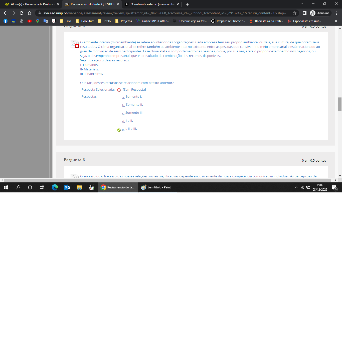 <p>Aluno(a) - Universidade Paulista Bb Revisar envio do teste: QUESTIO O ambiente externo (macroambi x + V Anônima CoolStuff Estilo Projetos Online MP3 Cutter.. veja as fot... G Prepare seu home t... Radiestesia na Práti... Especialista em Aut... U em 0.5 pontos ambiente interno (microambiente) se refere ao interior das organizações. Cada empresa tem seu próprio ou seja, sua cultura, de que obtém seus resultados. clima organizacional se refere também ao ambiente interno existente entre as pessoas que convivem no meio empresarial e está relacionado ao grau de motivação de seus participantes. Esse clima afeta comportamento das pessoas, que, por sua vez, afeta próprio desempenho nos negócios, ou seja, desempenho empresarial, que é resultado da combinação dos recursos disponíveis. Vejamos alguns desses recursos: Humanos II- III- Qual(ais) desses recursos se relacionam com texto anterior? Resposta Selecionada: [Sem Resposta] Respostas: Somente I. a. b. Somente II. Somente III. C. d. II. e. II III. Pergunta 6 0 em pontos sucesso ou fracasso das nossas relações sociais significativas depende exclusivamente da nossa competência comunicativa individual. As percepções de 15:02 Revisar envio do te... Sem Paint 03/12/2022 6</p>
