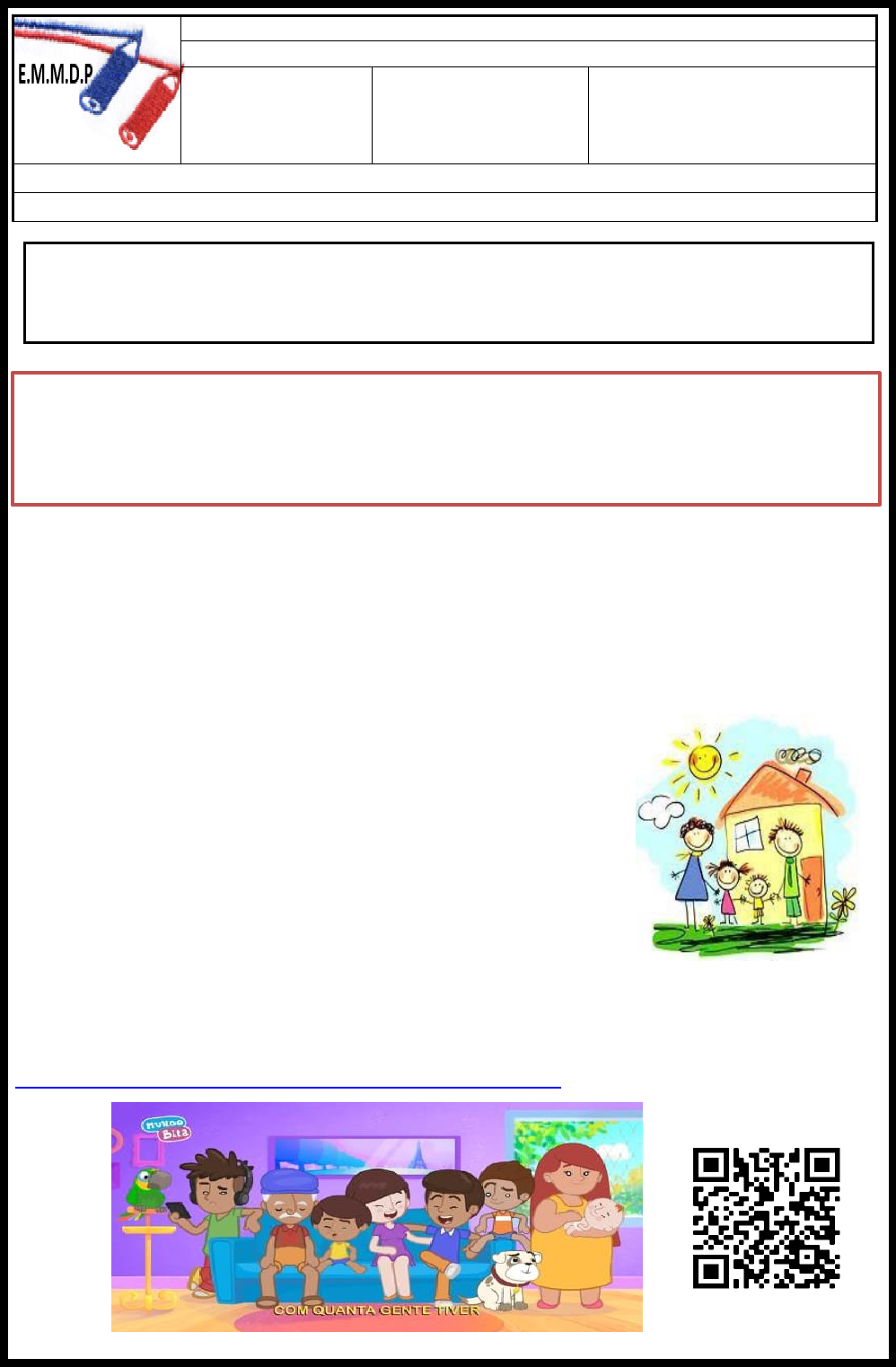 <p>1</p><p>A FAMÍLIA É O NOSSO ABRIGO, ONDE NOS SENTIMOS SEGUROS,</p><p>ACOLHIDOS E AMADOS. CADA FAMÍLIA É DE UM JEITO, MAS TODAS</p><p>SÃO ESPECIAIS.</p><p>1-FAMÍLIA , LEIA O POEMA PARA SUA CRIANÇA.</p><p>MINHA FAMÍLIA</p><p>TENHO UMA FAMÍLIA</p><p>QUE É MESMO GENIAL</p><p>CARREGO NO CORAÇÃO</p><p>ESTE AMOR ESPECIAL!</p><p>ISABEL CRISTINA S. SOARES</p><p>SE POSSÍVEL, ASSISTA O VÍDEO SOBRE FAMÍLIA.</p><p>https://www.youtube.com/watch?v=s48phnrkZ5w</p><p>ESCOLA MUNICIPAL MARINETE DAMASCENO PINHEIRO</p><p>ATIVIDADES INTEGRADAS DE ESTUDOS REMOTOS</p><p>1ºTRIMESTRE</p><p>2021</p><p>BLOCO 3</p><p>EDUCAÇÃO</p><p>INFANTIL</p><p>2°PERÍODO</p><p>ALUNO (A):</p><p>PROFESSOR (A): VANESSA APARECIDA/ MÁRCIA CRISTINA DATA: 29/03/2021 A 09/04/2021</p><p>EM CONSONÂNCIA COM A LEI 9610/98, AS IMAGENS (PEQUENOS DESENHOS)</p><p>QUE ILUSTRA ESSE BLOCO DE ATIVIDADES FORAM COPIADAS DO GOOGLE</p><p>IMAGENS.</p><p>QUERIDA CRIANÇA, ESPERAMOS QUE VOCÊS E SEUS FAMILIARES</p><p>ESTEJAM BEM. FAÇAM AS ATIVIDADES COM MUITO CAPRICHO!</p><p>BEIJOS CARINHOSOS DAS PROFESSORAS!</p><p>https://www.youtube.com/watch?v=s48phnrkZ5w</p><p>2</p><p>2-FAMÍLIA, LEIA PARA A CRIANÇA AS PALAVRAS ABAIXO. APÓS O</p><p>MOMENTO DE LEITURA, PINTE O NOME DAS PESSOAS QUE MORAM</p><p>COM VOCÊ.</p><p>-------------------------------------------------------------------------------------------------------</p><p>3- QUANTAS PESSOAS MORAM COM VOCÊ EM SUA CASA? REGISTRE</p><p>NO QUADRINHO ABAIXO A QUANTIDADE.</p><p>-------------------------------------------------------------------------------------------------------</p><p>4-COM AJUDA DE UM FAMILIAR MARQUE UM (X) NO QUADRINHO:</p><p>VOCÊ TEM IRMÃOS OU IRMÃS? SIM NÃO</p><p>SE TIVER REGISTRE NO QUADRINHO ABAIXO QUANTOS SÃO:</p><p>3</p><p>5- COM A AJUDA DE UM FAMÍLIAR , OBSERVE A PALAVRA ABAIXO E</p><p>COMPLETE OS QUADRINHOS COM O QUE SE PEDE:</p><p>FAMÍLIA</p><p>LETRA INICIAL LETRA FINAL NÚMERO DE LETRAS</p><p>-------------------------------------------------------------------------------------------------------</p><p>6-DESENHE NO ESPAÇO ABAIXO A SUA FAMÍLIA.</p><p>4</p><p>BRINCADEIRA EM FAMÍLIA: JOGO DOS 3 ERROS.</p><p>ESCOLHA UM ESPAÇO QUE TENHA MUITOS OBJETOS OU ENFEITES.</p><p>UM FAMILIAR VAI PEDIR PARA CRIANÇA OBSERVAR AQUELE LUGAR</p><p>POR ALGUM TEMPO (ISSO VAI DEPENDER DO TEMPO IDEAL DE CADA</p><p>CRIANÇA). DEPOIS, A CRIANÇA DEVERÁ SAIR DO LOCAL E O FAMILIAR</p><p>IRÁ TIRAR 3 OBJETOS DO LOCAL. QUANDO A CRIANÇA RETORNAR,</p><p>ELA DEVERÁ ADIVINHAR QUAIS OBJETOS FORAM RETIRADOS DO</p><p>LUGAR.</p><p>7- REGISTRE ABAIXO, COM FOTOS OU DESENHOS COMO FOI A</p><p>BRINCADEIRA COM A SUA FAMÍLIA.</p><p>5</p><p>8-OBSERVE A LETRA A E PASSE O DEDINHO SOBRE ELA. EM</p><p>SEGUIDA, PINTE A LETRA COM UM LÁPIS DE COR AZUL. AGORA VOCÊ</p><p>IRÁ MOSTRAR QUE APRENDEU ESCREVENDO A LETRA A NO</p><p>QUADRO AO LADO.</p><p>SE POSSÍVEL, ASSISTA O VÍDEO DA LETRA A.</p><p>https://www.youtube.com/watch?v=KF7mCaJmFJo</p><p>-------------------------------------------------------------------------------------------------------</p><p>9-COM AJUDA DE UM FAMILIAR, LEIA O TEXTO ABAIXO E PINTE DE</p><p>AMARELO TODAS AS PALAVRAS QUE SE INICIAM COM A LETRA A.</p><p>A ABELHA E A ARANHA</p><p>VIAJARAM DE AVIÃO</p><p>FORAM VISITAR A ARARA</p><p>QUE ESTÁ EM EXTINÇÃO!</p><p>ISABEL CRISTINA S. SOARES</p><p>CRIANÇAS, A PARTIR DESTE BLOCO, NÓS IREMOS APRENDER</p><p>UM POUCO MAIS SOBRE AS LETRAS DO ALFABETO. DESTA VEZ</p><p>SERÁ A LETRA A. UMA LETRA QUE ESTÁ PRESENTE EM MUITAS</p><p>PALAVRAS QUE FALAMOS E ESCREVEMOS.</p><p>https://www.youtube.com/watch?v=KF7mCaJmFJo</p><p>6</p><p>10-PINTE OS DESENHOS QUE INICIAM COM ALETRA A.</p><p>-------------------------------------------------------------------------------------------------------</p><p>11-AGORA É A SUA VEZ! DESENHE NO ESPAÇO ABAIXO OBJETOS</p><p>QUE TEM O NOME QUE SE INICIA COM A LETRA A.</p><p>----------------------------------------------------------------------------------------------------</p><p>12-OBSERVE A PALAVRA AMARELINHA E COMPLETE O QUADRO COM</p><p>AS LETRAS QUE ESTÃO FALTANDO.</p><p>A</p><p>M</p><p>A</p><p>R</p><p>E</p><p>L</p><p>I</p><p>N</p><p>H</p><p>A</p><p>M</p><p>R</p><p>E</p><p>L</p><p>I</p><p>N</p><p>H</p><p>7</p><p>13- AGORA É HORA DE BRINCAR:</p><p>PEÇA UM FAMILIAR PARA TE AJUDAR RISCAR A</p><p>AMARELINHA NO CHÃO. O JOGO COMEÇA JOGANDO A</p><p>PEDRINHA NA CASA 1. A CASA ONDE ESTÁ A PEDRA</p><p>NÃO PODE SER PISADA, É PRECISO PULAR POR CIMA</p><p>DELA. VOCÊ VAI PULANDO COM UM PÉ SÓ, OU ONDE</p><p>TIVER 2 CASAS, LADO A LADO, VOCÊ COLOCA UM PÉ EM</p><p>CADA CASA, PULANDO AS CASAS ATÉ CHEGAR NO CÉU.</p><p>DIVIRTAM-SE BASTANTE!</p><p>-------------------------------------------------------------------------------------------------------</p><p>OLÁ! EU SOU O QUADRADO! UMA FORMA GEOMÉTRICA BEM BONITA</p><p>COM QUATRO LADOS IGUAIZINHOS.</p><p>14- PASSE O DEDINHO NA IMAGEM ABAIXO E CONTE QUANTAS</p><p>PARTES TEM. DEPOIS, COLE PEDAÇOS DE PAPEL RASGADO DENTRO</p><p>DO QUADRADO ABAIXO.</p><p>“FORMAS GEOMÉTRICAS: SÃO AS FORMAS QUE OS OBJETOS AO</p><p>NOSSO REDOR POSSUEM E BASICAMENTE, ESTÃO PRESENTES</p><p>EM TODOS OS OBJETOS QUE NOS CERCAM”.</p><p>8</p><p>15-AGORA É SUA VEZ DE MOSTRAR QUE APRENDEU. PINTE OS</p><p>DESENHOS QUE SE PARECEM COM O QUADRADO. APROVEITE</p><p>TAMBÉM PARA PROCURAR EM SUA CASA, OBJETOS QUE SE</p><p>PARECEM COM UM QUADRADO. BOA DIVERSÃO!</p><p>-------------------------------------------------------------------------------------------------------</p><p>16-PINTE AS FIGURAS DE ACORDO COM NUMERAL INDICADO.</p>
