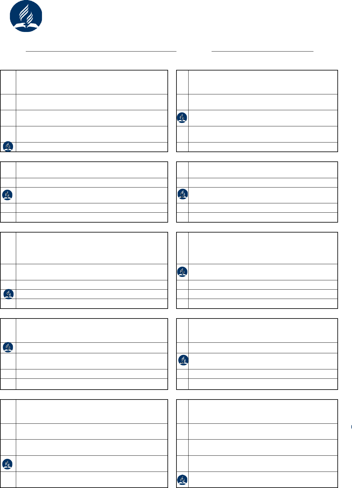 <p>QUIZ 07 – ADOLESCENTES – “QUEM ESTÁ NO CONTROLE?”</p><p>3º Tri 2024 10-17/08 – LIÇÃO 06 E OS UNGIDOS, CAP. 41</p><p>Nome: Base:</p><p>1</p><p>Qual atitude de Nabucodonosor demonstrou</p><p>que ele acreditava que seu reino era</p><p>indestrutível?</p><p>6</p><p>Como Nabucodonosor foi capaz de</p><p>identificar o quarto homem na fornalha?</p><p>a</p><p>A construção a estátua com todos os materiais</p><p>do sonho</p><p>a</p><p>Daniel havia descrito a ele</p><p>b</p><p>A ordem de que todos se curvassem para a</p><p>estátua</p><p>b Através da vida e do caráter dos jovens</p><p>hebreus (pág. 219)</p><p>c</p><p>Enviar Daniel para outro lugar par que não</p><p>atrapalhasse seus planos</p><p>c</p><p>Por causa da teimosia dos hebreus</p><p>d A construção da estátua de ouro (sábado) d Ele havia visto no sonho da estátua</p><p>2</p><p>Onde encontramos a promessa de que o</p><p>fogo não nos queimará?</p><p>7</p><p>O que foi danificado na fornalha?</p><p>a Salmo 20:7 a Nada</p><p>b Isaías 43:2</p><p>b</p><p>Apenas as cordas que os amarravam (pág.</p><p>219)</p><p>c Jó 34:24 c Suas roupas</p><p>d Apocalipse 17:14 d Seus cabelos</p><p>3</p><p>Complete: “O Senhor declarou que Se</p><p>coloca ao lado do ___________ e repreende</p><p>todos os ___________ que se rebelam contra</p><p>a autoridade do Céu.”</p><p>8</p><p>Onde os sábios sugeriram que o rei</p><p>construísse a estátua?</p><p>a</p><p>Pecador - homens</p><p>a Onde todos pudessem admirar a cabeça de</p><p>ouro (pág. 216)</p><p>b Fiel - pecadores b Em frente ao palácio</p><p>c Oprimido – poderes terrestres (quinta) c Em frente ao templo de Salomão</p><p>d Homem – poderes ocultos d Voltada para Jerusalém</p><p>4</p><p>Segundo a lição, o que os jovens hebreus</p><p>demonstraram com sua lealdade frente em</p><p>face da morte?</p><p>9</p><p>Qual era o plano de Nabucodonosor ao</p><p>construir a estátua?</p><p>a Qualidades de caráter (segunda) a Mostrar que ele era soberano</p><p>b</p><p>Medo</p><p>b</p><p>Que a interpretação de Daniel fosse rejeitada e</p><p>a verdade distorcida (pág. 217)</p><p>c Resiliência c Manchar a reputação de Daniel</p><p>d Determinação d A adoração total de toda a nação</p><p>5 Que verso exemplifica bem a resposta dos</p><p>jovens hebreus ao rei?</p><p>10</p><p>Qual a atitude do rei quando os hebreus se</p><p>recusaram terminantemente a se curvar</p><p>perante a estátua?</p><p>a</p><p>Salmo 37:5 - “Entrega teu caminho ao senhor,</p><p>confia nele e tudo ele fará”</p><p>a</p><p>Mandou levarem Daniel para longe para não</p><p>atrapalhar seus planos de glória</p><p>b</p><p>Salmo 119:105 - “Lâmpada para meus passos é</p><p>a tua palavra e luz no meu caminho”</p><p>b</p><p>Ordenou que a fornalha fosse aquecida por</p><p>sete horas antes de jogar os hebreus nela</p><p>c Romanos 14:8 – “Quer vivamos, quer</p><p>morramos, pertencemos ao Senhor” (sexta)</p><p>c</p><p>Ordenou que sete soldados armados</p><p>lançassem os hebreus na fornalha</p><p>d</p><p>Isaías 40:31 – “Mas os que esperam no Senhor</p><p>renovarão as forças...”</p><p>d Ordenou que a fornalha fosse aquecida sete</p><p>vezes mais que o normal (pág. 218)</p>