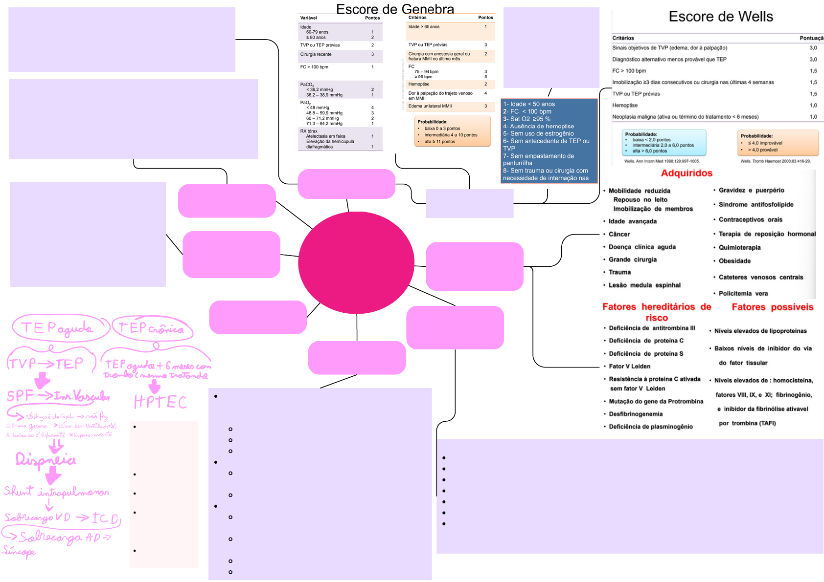 <p>Pensar em TEP;1.</p><p>Quadro clínico compatível;2.</p><p>Identificação de fatores de risco;3.</p><p>Exclusão de diagnóstico alternativo.4.</p><p>obstrução da artéria pulmonar ou de seus ramos por um</p><p>embolo, geralmente um coágulo, com origem em outro</p><p>lugar do corpo, podendo ser causada por Gás , gordura e</p><p>pedaços de tumor também podem causar TEP. Sendo</p><p>uma doença subdiagnosticada, com alta</p><p>morbimortalidade.</p><p>Predisposição para TEV:</p><p>Estase (Imobilidade, repouso,</p><p>varizes);</p><p>1.</p><p>Lesão endotelial (trauma, lesão</p><p>tecidual, inflamação, cirurgia);</p><p>2.</p><p>Hipercoagulobilidade (gravidez,</p><p>neoplasia, trombofilias e</p><p>anticoncepcional).</p><p>3.</p><p>SINTOMAS INESPECÍFICOS!</p><p>Dispneia;</p><p>Taquicardia;</p><p>Dor torácica;</p><p>Tosse;</p><p>Sincope;</p><p>Hemoptiase;</p><p>Creptações.</p><p>apresentação clinica varia de acordo com a carga embólica (número de artéria obstruídas e</p><p>depende do nível -histórico do paciente-).</p><p>TROMBOEMBOLISMO</p><p>PULMONAR</p><p>Diagnóstico</p><p>Classificação</p><p>Fisiopatologia Apresentação</p><p>clínica</p><p>Tríade de</p><p>Virchow Fatores de</p><p>risco</p><p>Definição</p><p>HPTEC=</p><p>Hipertensão</p><p>pulmonar</p><p>tromboembólica</p><p>crônica;</p><p>SBF= Síndrome</p><p>pós-flebítica;</p><p>VD= Ventrículo</p><p>direito;</p><p>ICD=</p><p>Insuficiência</p><p>cardíaca do lado</p><p>direito;</p><p>AD= Átrio</p><p>direito.</p><p>ANATÔMICA (quando mais distal menor o trombo e</p><p>menos comprometimento hemodinâmico tem, quanto</p><p>mais central mais grave):</p><p>Lobar;</p><p>Segmentar;</p><p>Subsegmentar.</p><p>HEMODINÂMICA:</p><p>Maciço (PAS<90mmHg, ou queda de 40mmHg</p><p>na PAS);</p><p>Submaciço/Não maciço;</p><p>PROGNÓSTICA:</p><p>Risco alto (PAS<90mmHg, ou queda de</p><p>40mmHg);</p><p>Risco intermediário-alto (Disf. VD, Troponina e/ou</p><p>BNP);</p><p>Risco intermediário-baixo;</p><p>Risco baixo;</p><p>Escores de</p><p>probabilidade clínica:</p><p>PE Rule-Out Criteria: se</p><p>responde tudo sim pode</p><p>liberar o paciente sem</p><p>nenhum exame, mas tem</p><p>que preencher o critério de</p><p>escore de Wells ou</p><p>Genebra de baixa</p><p>probabilidade.</p><p>Gasometria: Principal achado hipoxemia (extensão embolia e</p><p>doença de base), mas pode ter PaCO2 usualmente reduzida, mas</p><p>pode estar aumentada também.</p><p>Eletrocardiograma:</p><p>Fibrilação atrial de início recente;</p><p>Taquicardia sinusal -> S1 Q3 T3;</p><p>Inversão T V1 - V4;</p><p>Depressão ST em D3/D2;</p><p>Sobrecarga VD / QRS > 90º;</p><p>Bloqueio agudo de ramo direito;</p><p>Onda S (S>R) grande em DI;</p><p>Onda Q grande em DIII, Inversão de T.</p><p>Radiografia de tórax: Auxilia a excluir</p><p>diagnóstico diferencial:</p><p>Elevação do diafragma uni / bilateral;</p><p>Imagem densa em cunha base pleural</p><p>-> Sinal de Hampton (opacidade</p><p>triangular ou em forma de cunha no</p><p>espaço retrocardíaco do tórax, na</p><p>região posterior do coração. A</p><p>opacidade é formada pela presença</p><p>de um coágulo que bloqueia</p><p>parcialmente o fluxo sanguíneo em</p><p>uma artéria pulmonar);</p><p>Aumento da art. Pulmonar e oligoemia</p><p>focal -> Sinal de Westermark (área de</p><p>hipoventilação no pulmão afetado</p><p>pela obstrução de uma artéria</p><p>pulmonar por um coágulo de sangue);</p><p>Sinal de Palla (dilatação da artéria</p><p>pulmonar descendente à direita,</p><p>imagem semelhante a uma salsicha</p><p>indo em direção ao lobo médio</p><p>direito, mais difícil de observar em</p><p>casos mais avançados.</p><p>Doppler de MMII:</p><p>Trombos: ecos estáticos,</p><p>preenchimentos incompletos;</p><p>Compressibilidade ausente</p><p>ou reduzida;</p><p>Estase valvular;</p><p>Fluxo ausente ao doppler;</p><p>Perda da variação</p><p>respiratória;</p><p>Aumento dos fluxos de</p><p>colaterais.</p><p>Testes de</p><p>confirmaçãoTestes de Apoio</p><p>Cintilografia pulmonar perfusional: avalia a</p><p>perfusão;</p><p>Angiotomografia computadorizada do tórax:</p><p>Método de escolha, pois avalia doenças que</p><p>simulam TEP, morfologia e função ventricular,</p><p>configuração septo interventricular, análise de</p><p>fluxos e avaliação de viabilidade ventricular:</p><p>TC como teste único para excluir TEP;</p><p>Baixa ou Intermediária probabilidade: TC</p><p>negativa exclui;</p><p>Alta probabilidade: TC negativa " exames</p><p>adicionais.</p><p>Dímero-D: Produto da degradação da</p><p>trombina. Serve para afastar a TEP.</p><p>Métodos quantitativos > 500 ng/mL =</p><p>anormal;</p><p>Negativo em baixa probabilidade:</p><p>descarta TEP: Exceção: alta</p><p>probabilidade, pós-operatório, idoso</p><p>(>75 anos), sangramento recente,</p><p>grávidas.</p><p>OBS. Em pacientes com mais de 50 anos, os</p><p>autores recomendam a utilização de um</p><p>limite ajustado à idade (idade × 10 ng/mL, em</p><p>vez de um padrão de 500 ng/mL).</p><p>Ecocardiograma: Estima pressão em artéria pulmonar, avalia</p><p>câmaras cardíacas identifica trombos em câmaras direitas,</p><p>diagnóstico diferencial outras entidades;</p><p>Marcador de gravidade (Hipocinesia de parede livre,</p><p>movimentação paradoxal do septo, Hipertensão pulmonar.</p><p>DIAGNÓSTICO DE</p><p>TEP</p><p>Peptídio natriurético do tipo B / BNP ... NT pro- BNP: Secreção</p><p>pelo miócito em resposta a estresse de cisalhamento / sobrecarga</p><p>de VD;</p><p>Troponinas I e T: Liberadas pelo miócito com resultado de</p><p>microinfartos devido a sobrecarga de VD.</p><p>Após confirmação de TEP</p><p>Iniciar anticoagulante oral:</p><p>Associar heparina + cumarínico ≥ 5 dias</p><p>Descontinuar heparina quando:</p><p>Heparina ≥ 5 dias;</p><p>INR ≥ 2,0 / 2 dias consecutivos.</p><p>Tromboprofilaxia</p><p>primária:</p><p>Deambulação</p><p>precoce;</p><p>Elevação membros</p><p>in