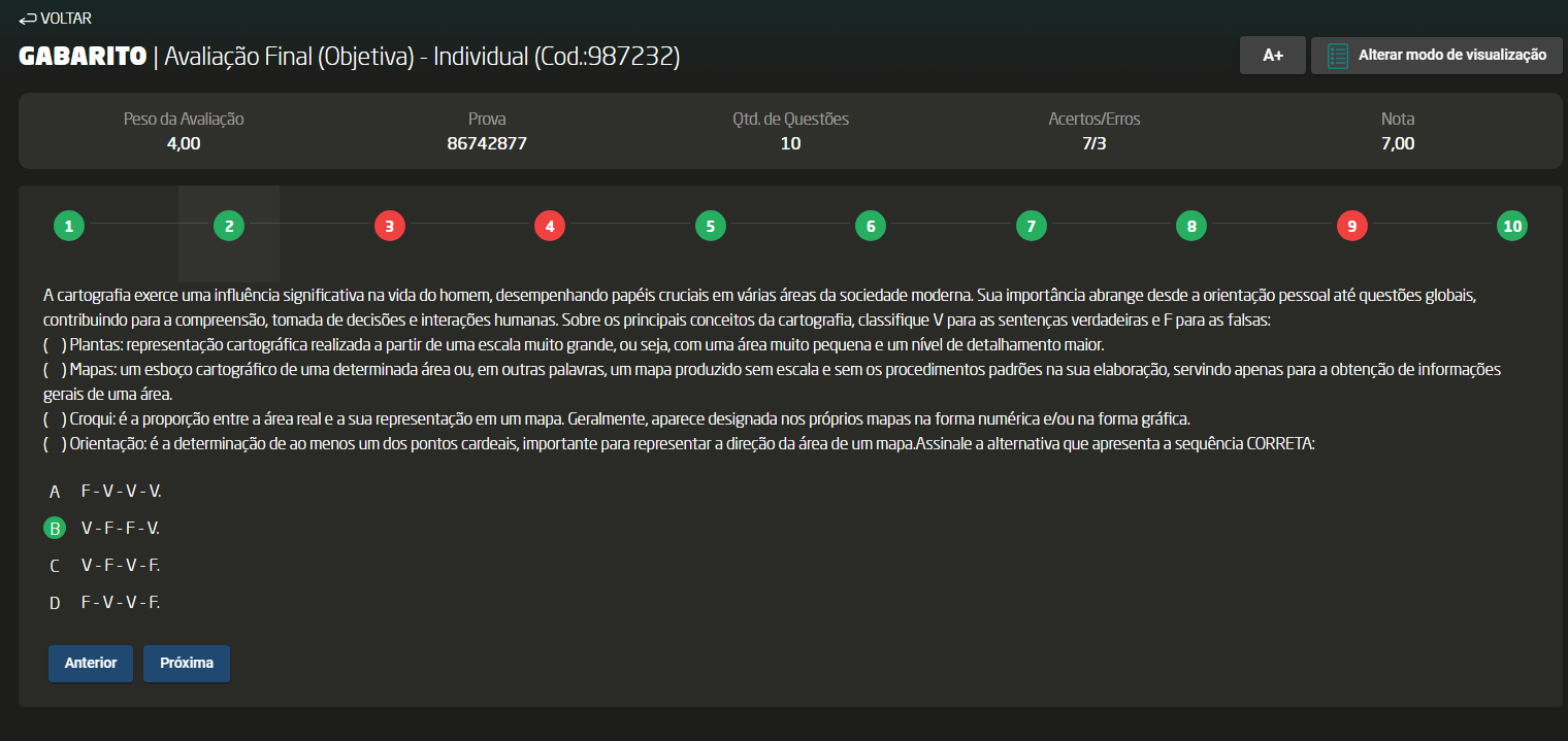 <p>VOLTAR GABARITO Avaliação Final (Objetiva) - Individual A+ Alterar modo de visualização Peso da Avaliação Prova Qtd. de Questões Acertos/Erros Nota 4,00 86742877 10 7/3 7,00 1 2 3 4 5 6 7 8 9 10 A cartografia exerce uma influência significativa na vida do homem, desempenhando papéis cruciais em várias áreas da sociedade moderna. Sua importância abrange desde a orientação pessoal até questões globais, contribuindo para a compreensão, tomada de decisões e interações humanas. Sobre os principais conceitos da cartografia, classifique V para as sentenças verdadeiras e F para as falsas: ( ) Plantas: representação cartográfica realizada a partir de uma escala muito grande, ou seja, com uma área muito pequena e um nível de detalhamento maior. ( ) Mapas: um esboço cartográfico de uma determinada área OU, em outras palavras, um mapa produzido sem escala e sem os procedimentos padrões na sua elaboração, servindo apenas para a obtenção de informações gerais de uma área. ( ) Croqui: é a proporção entre a área real e a sua representação em um mapa. Geralmente, aparece designada nos próprios mapas na forma numérica e/ou na forma gráfica. ( ) Orientação: é a determinação de ao menos um dos pontos cardeais, importante para representar a direção da área de um a alternativa que apresenta a CORRETA: A F-V-V-V V-F-F-V V-F-V-F D F-V-V-F Anterior Próxima</p>