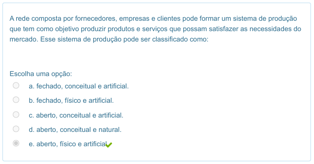 <p>A rede composta por fornecedores, empresas e clientes pode formar um sistema de produção que tem como objetivo produzir produtos e serviços que possam satisfazer as necessidades do mercado. Esse sistema de produção pode ser classificado como: Escolha uma opção: a. fechado, conceitual e b. fechado, físico e artificial. aberto, conceitual e artificial. d. conceitual e e. aberto, físico e artificial</p>
