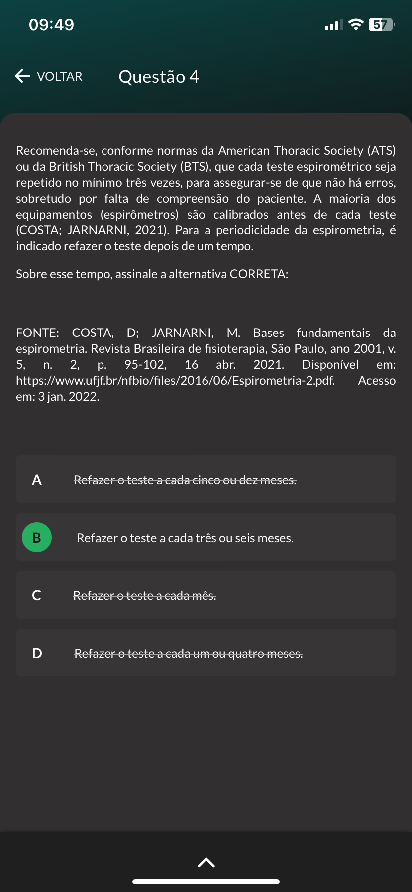 <p>09:49 57 VOLTAR Questão 4 Recomenda-se, conforme normas da American Thoracic Society (ATS) ou da British Thoracic Society (BTS), que cada teste espirométrico seja repetido no mínimo três vezes, para assegurar-se de que não há erros, sobretudo por falta de compreensão do paciente. A maioria dos equipamentos (espirômetros) são calibrados antes de cada teste JARNARNI, 2021). Para a periodicidade da espirometria, é indicado refazer o teste depois de um tempo. Sobre esse tempo, assinale a alternativa CORRETA: FONTE: COSTA, D; JARNARNI, M. Bases fundamentais da espirometria. Revista Brasileira de fisioterapia, São Paulo, ano 2001, V. 5, n. 2, p. 95-102, 16 abr. 2021. Disponível em: https://www.ufjf.br/nfbio/files/2016/06/Espirometria-2.pdf. Acesso em: 3 jan. 2022. A Refazer teste a cada dez meses. Refazer teste a cada três ou seis meses. Refazer D Refazer teste a cada um quatre meses.</p>